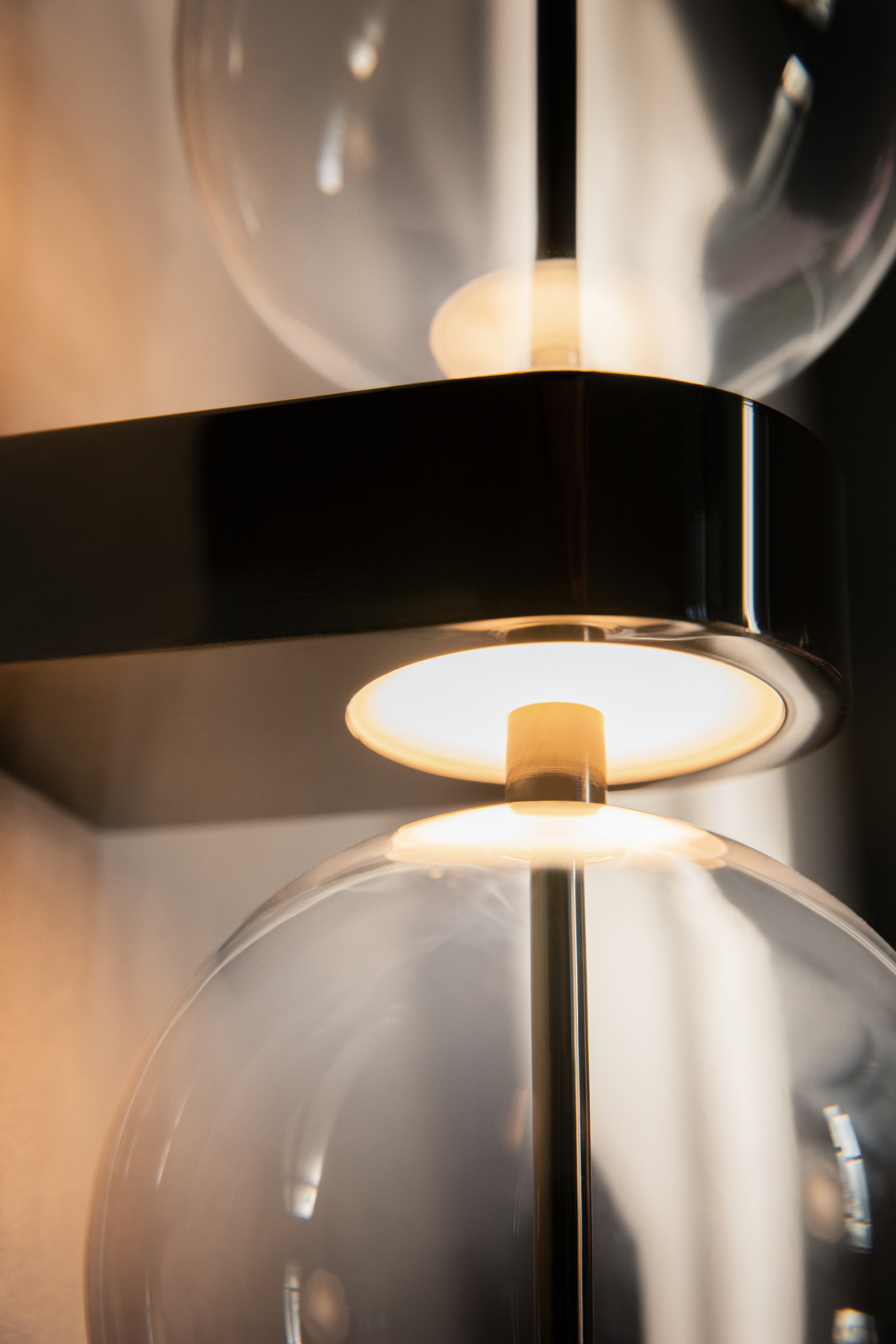 «Для создания светильника с загадочным и чарующим эффектом были использованы разные технологии. По обеим сторонам основания спрятаны источники света с матовыми рассеивателями, создающими мягкое свечение. Стеклянные шарики покрыты зеркальным градиентом, который отражает свет и создает сложные оптические эффекты. Все крепления изготовлены с использованием уникальной магнитной системы, сохраняющей визуальную чистоту конструкции».