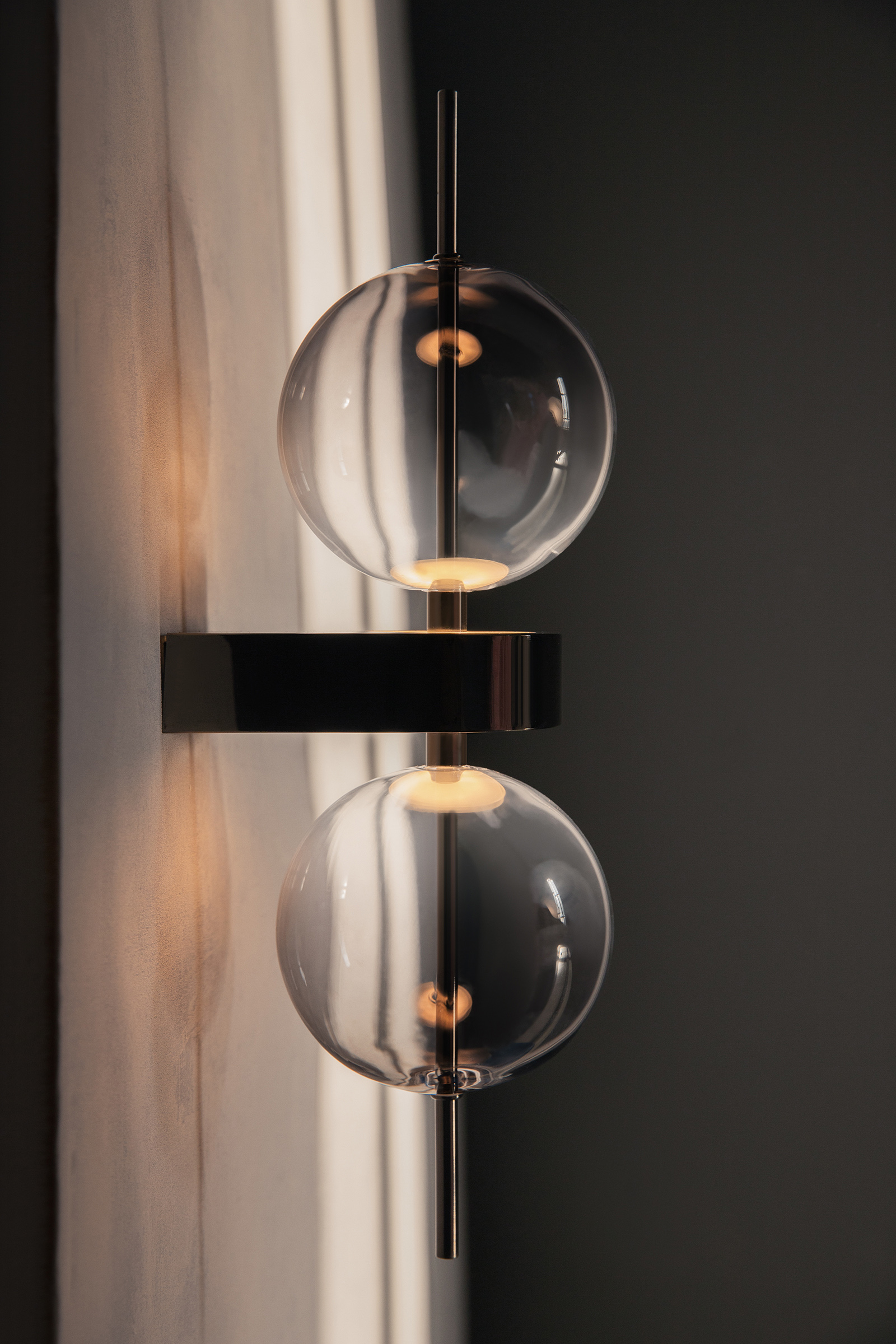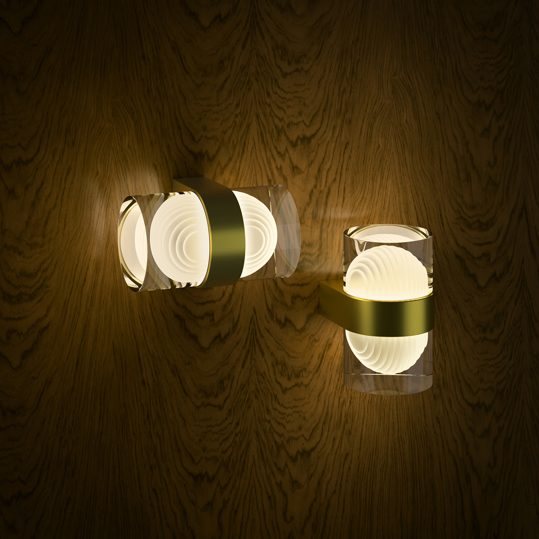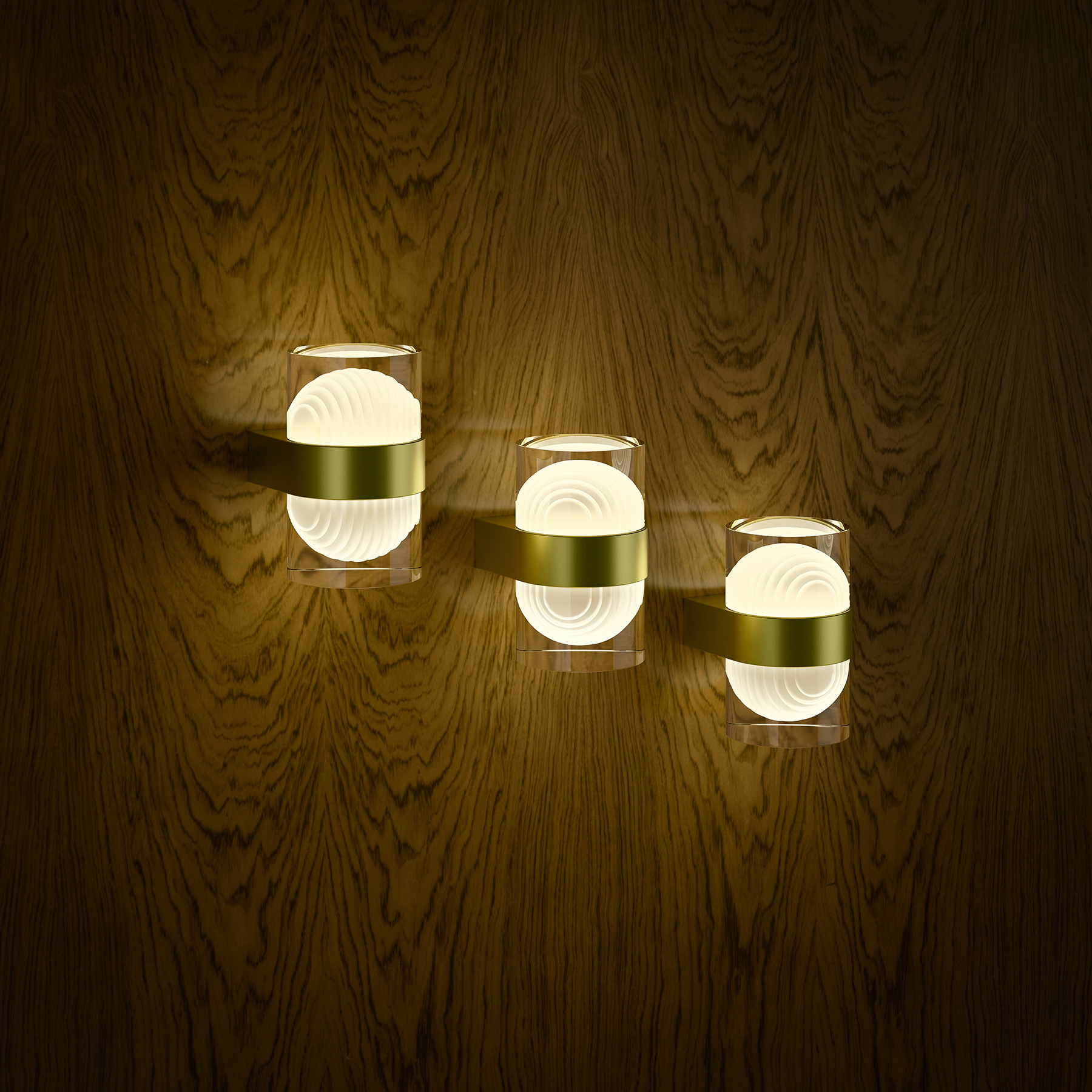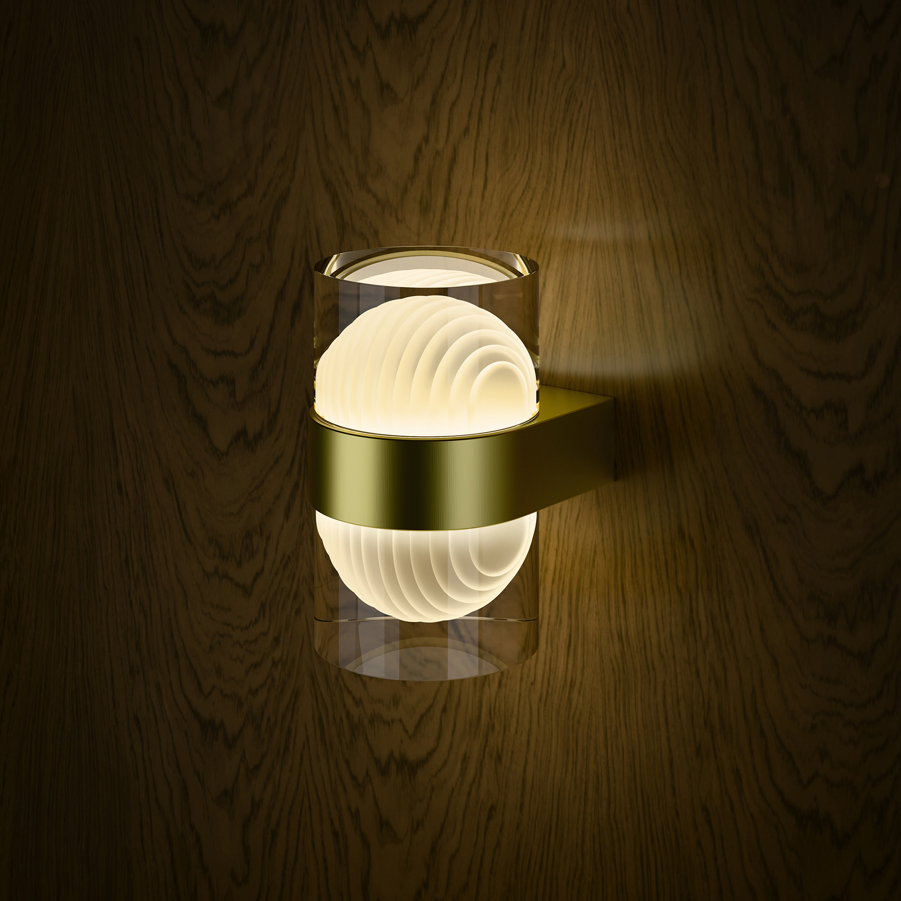 «Эта коллекция основана на двух ключевых идеях. Первая — иллюзия матового светового шара, который на самом деле представляет собой полую форму, вырезанную из цельного стекла и матированную внутри. Такое решение обеспечивает мягкий свет и делает корпус светильника более компактным. Вторая идея — трансформация: с помощью вращающихся стеклянных элементов можно менять орнамент. Дополнительную гибкость конструкции обеспечивает возможность вертикального и горизонтального настенного монтажа».
