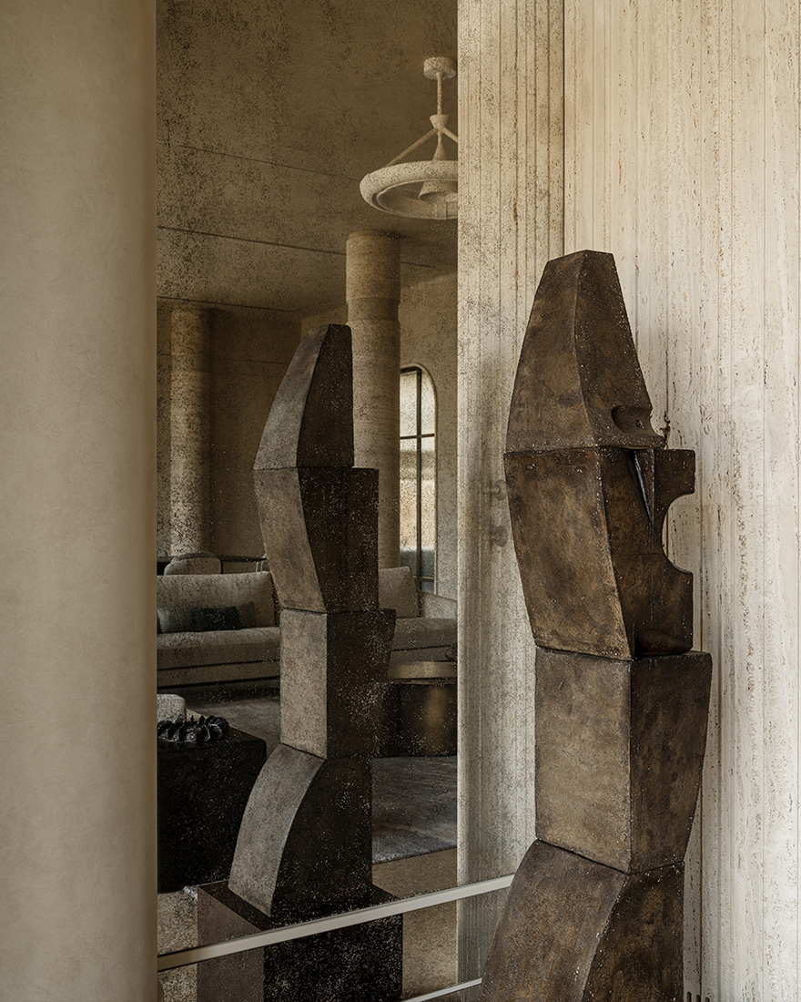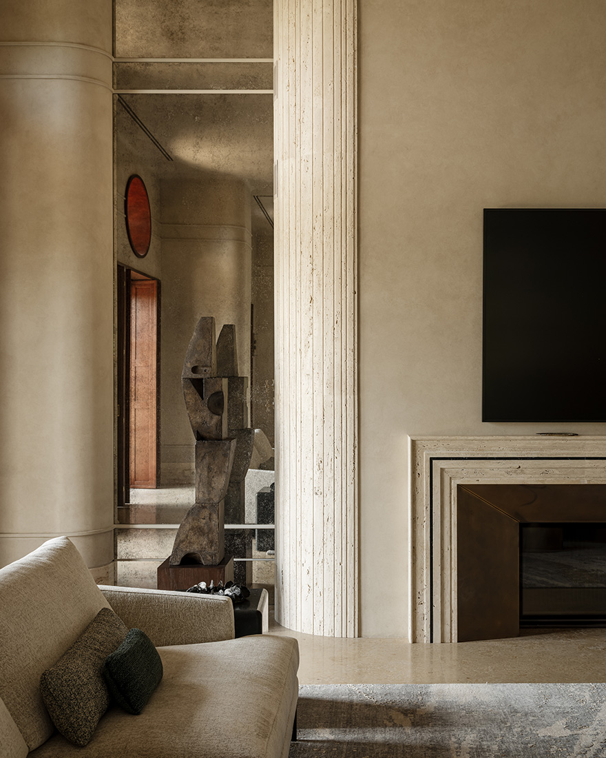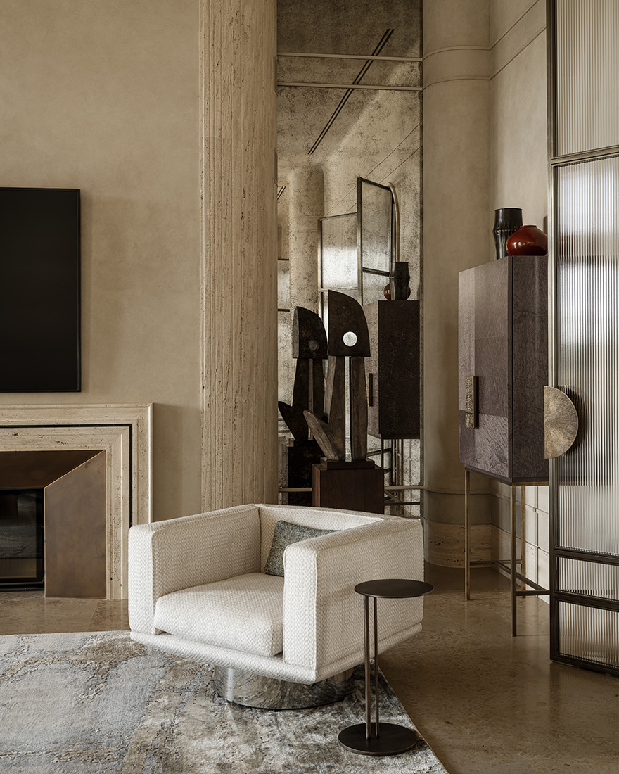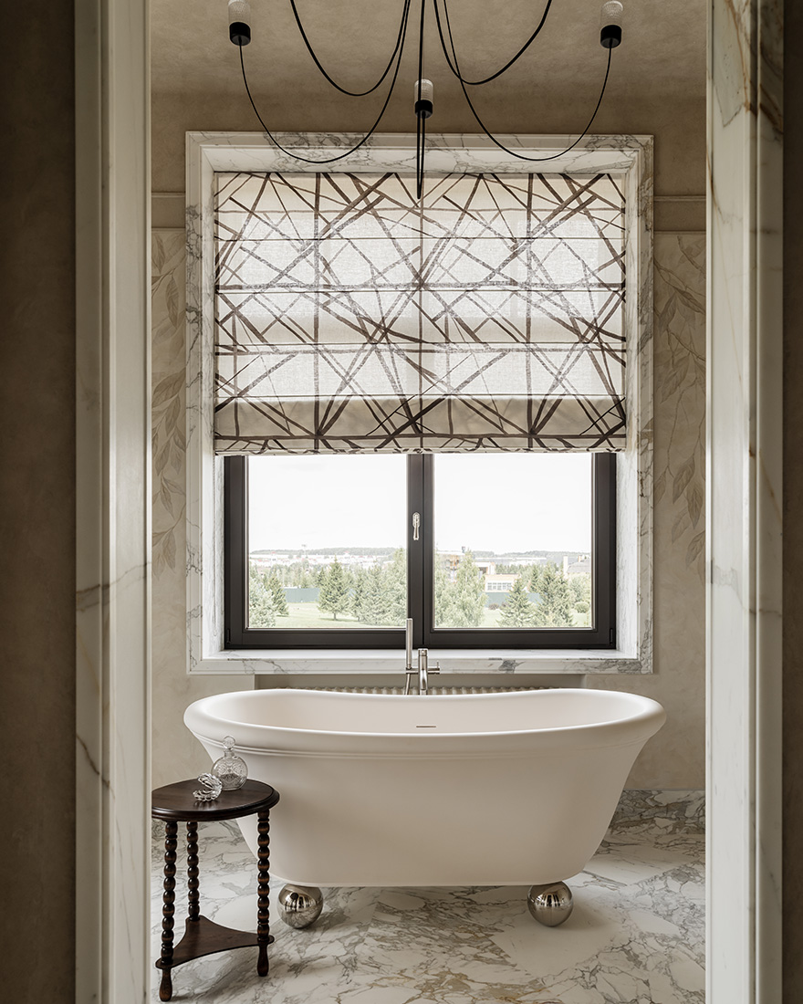 «Прямо пересекающиеся оси комнат первого этажа напоминают звук камертона. Юрский мрамор, травертин, декоративная настенная роспись, неопрятные колонны – на фоне элегантной простоты отделки расставлены акценты: винтажные предметы коллекционирования, дизайнерская мебель и картины из еще формирующейся коллекции произведений искусства. Хозяйка – деловая женщина и ценит свое и наше время. Выполнение решений она доверяет профессионалам, и мы следовали идее до конца.
