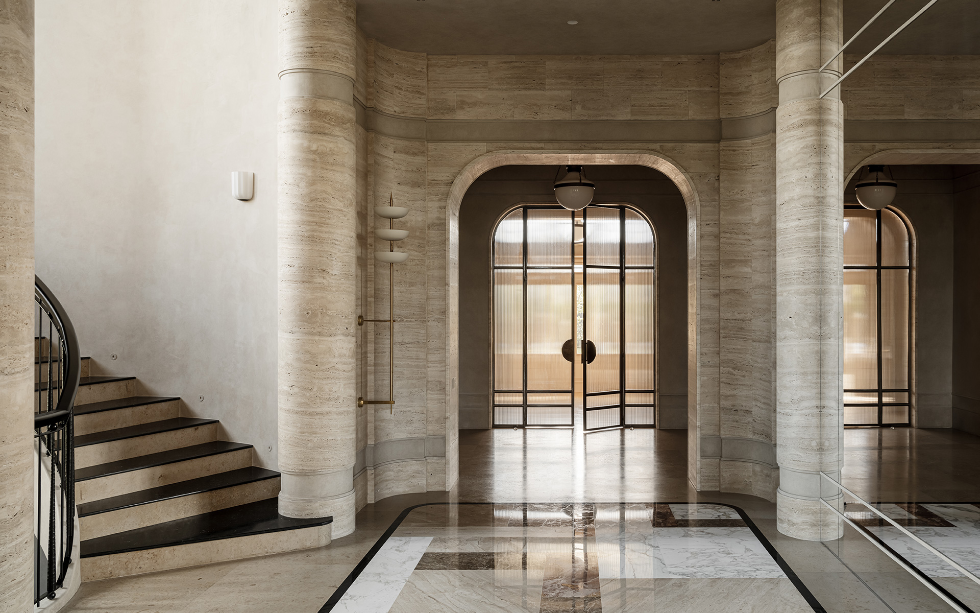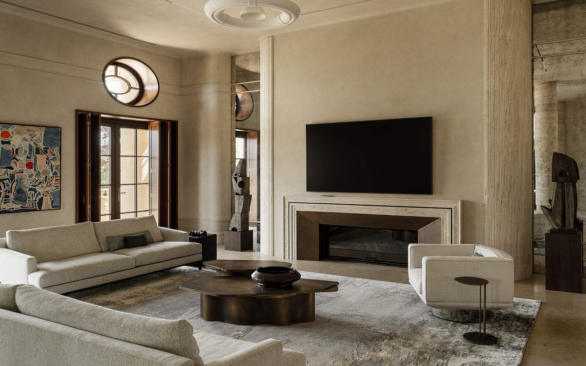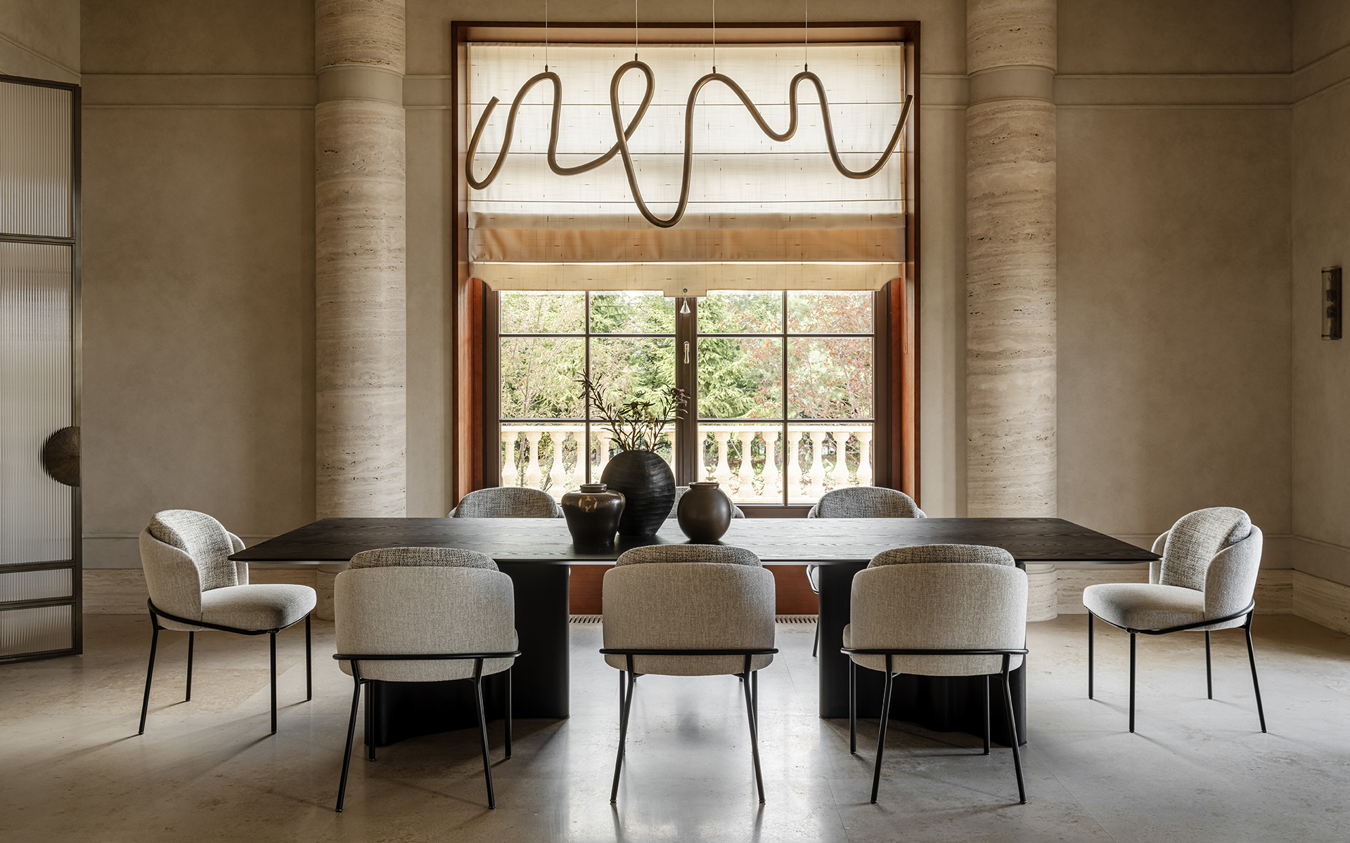 «Прямо пересекающиеся оси комнат первого этажа напоминают звук камертона. Юрский мрамор, травертин, декоративная настенная роспись, неопрятные колонны – на фоне элегантной простоты отделки расставлены акценты: винтажные предметы коллекционирования, дизайнерская мебель и картины из еще формирующейся коллекции произведений искусства. Хозяйка – деловая женщина и ценит свое и наше время. Выполнение решений она доверяет профессионалам, и мы следовали идее до конца.