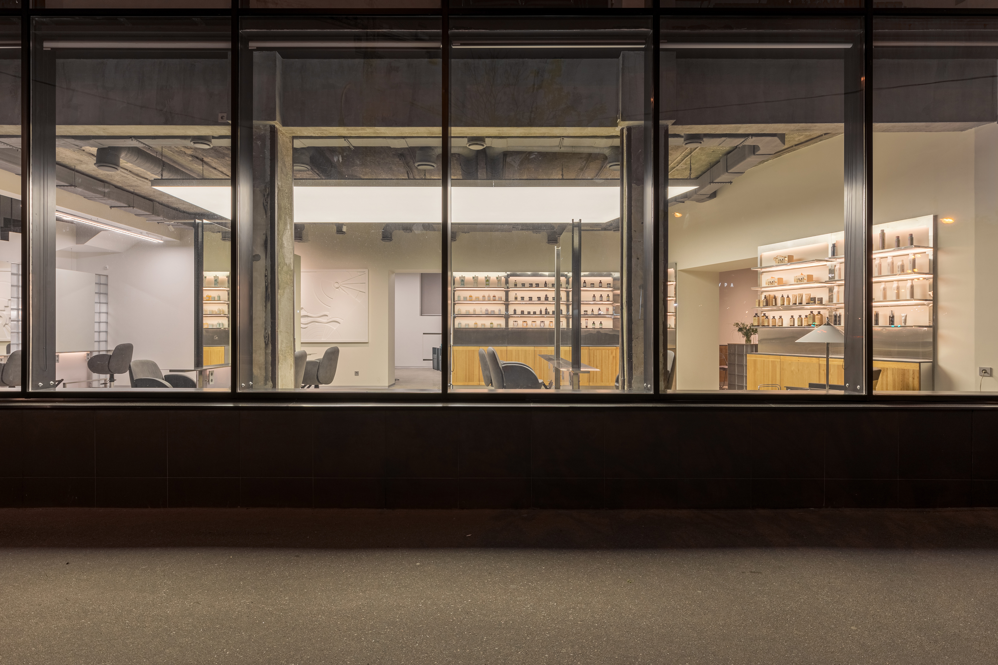 Парикмахерская площадью 213 м². метров расположен на улице Восточной в Москве на первом этаже здания, среди преимуществ которого дизайнеры отмечают высокие потолки и эркеры. «Это вытянутое прямоугольное здание-пристройка советской эпохи с большими окнами, разделенное на два этажа мезонином», — поясняют авторы проекта. — Мы работали с первым этажом, состоящим из трёх залов: холла, основного зала и лаборатории. После демонтажа мы обнаружили настоящие визуальные сокровища в виде текстур старого бетона и слоев краски.