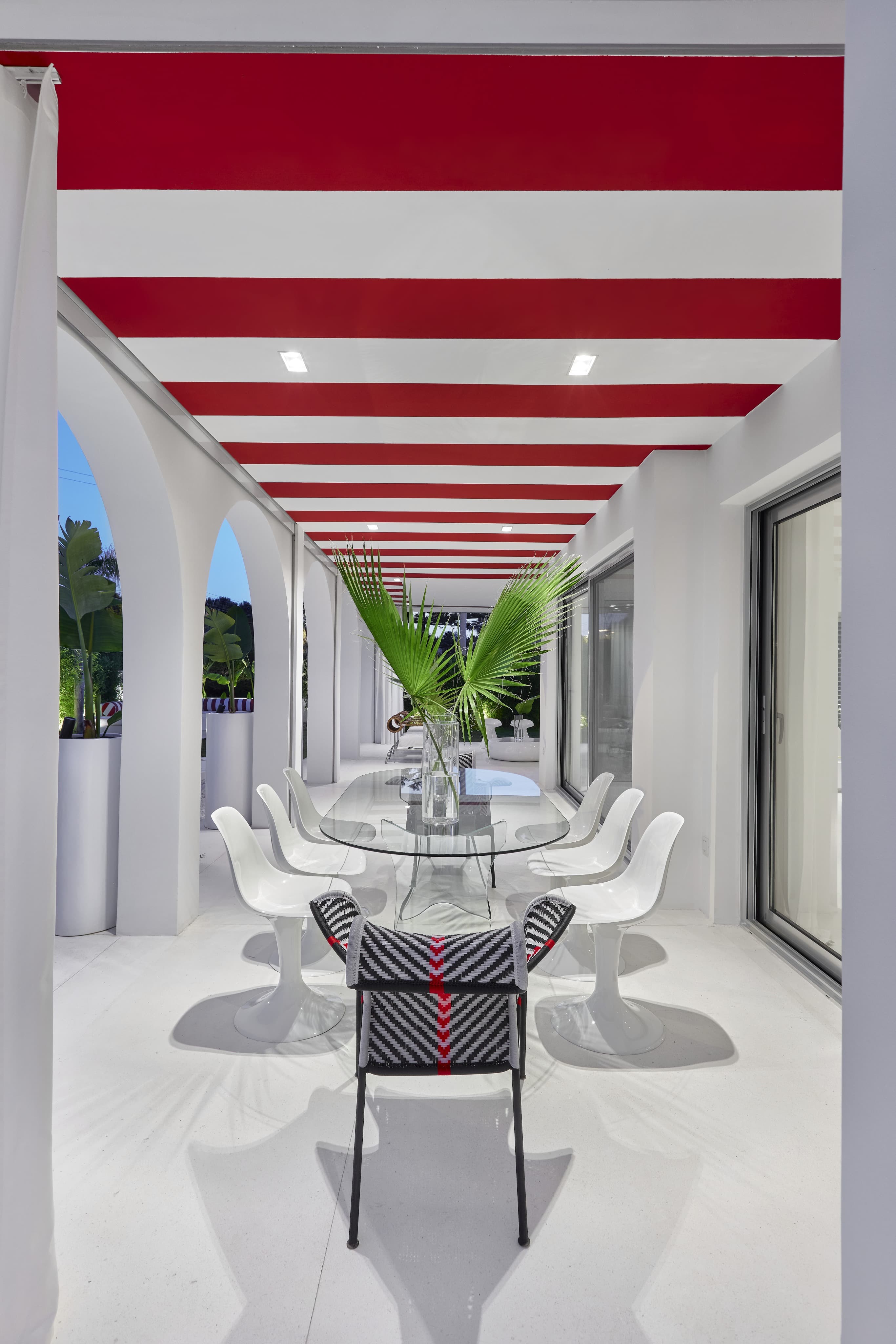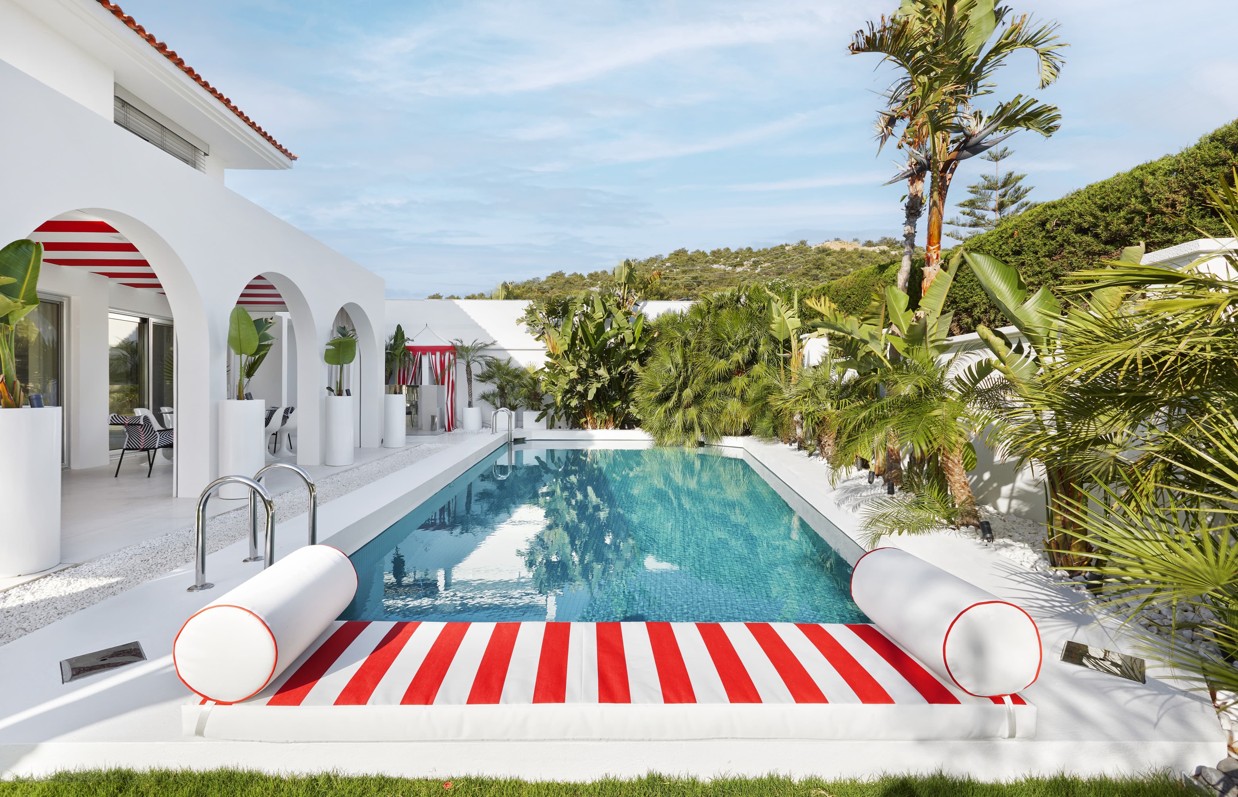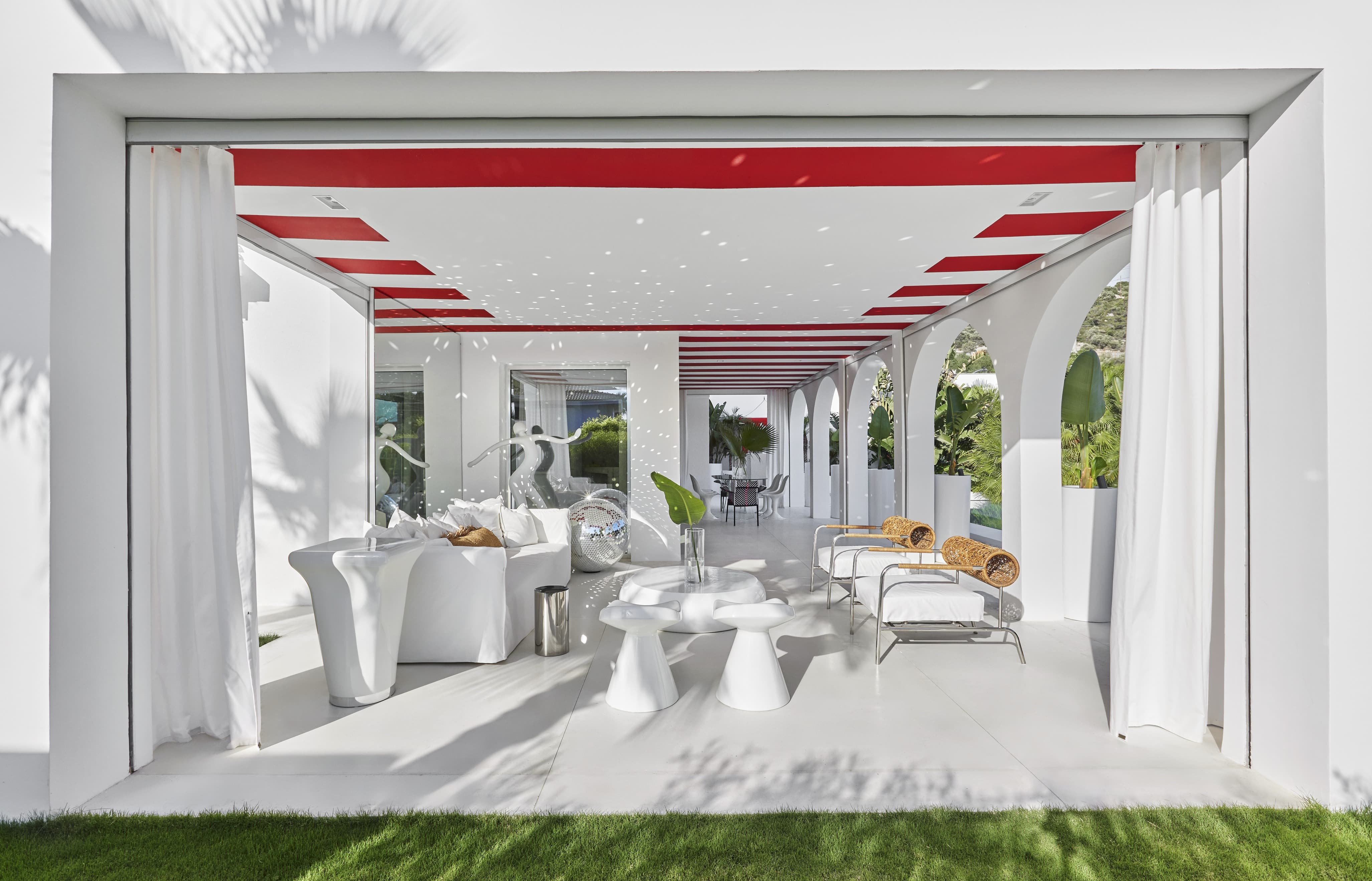 Основа интерьера – белая штукатурка, усиливающая ощущение простора. Белый здесь выступает в качестве архитектурного элемента: он поглощает и отражает интенсивный средиземноморский свет. Красные акценты придают пространству энергию: полосатые текстильные элементы, лакированные стулья и скульптурные детали.