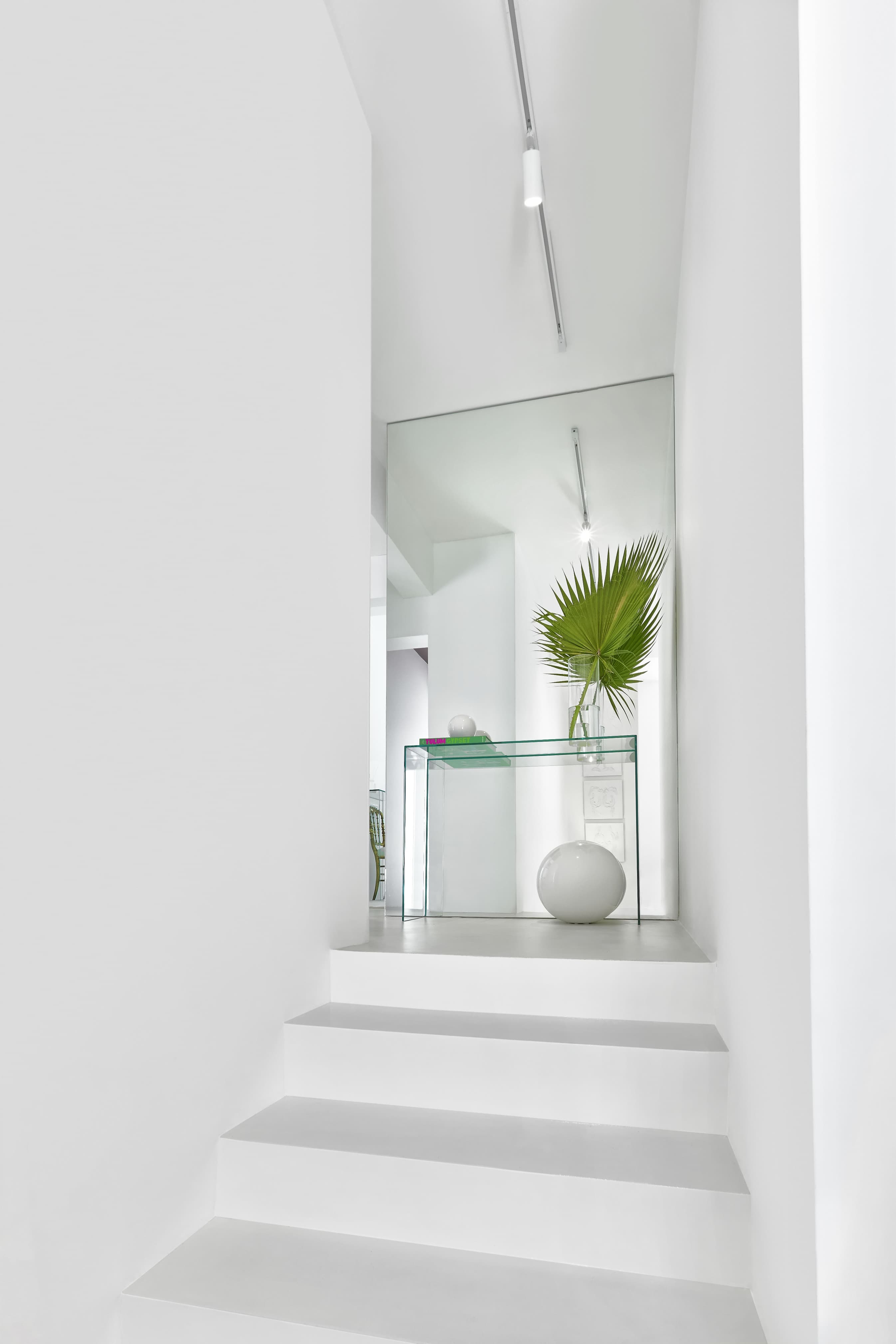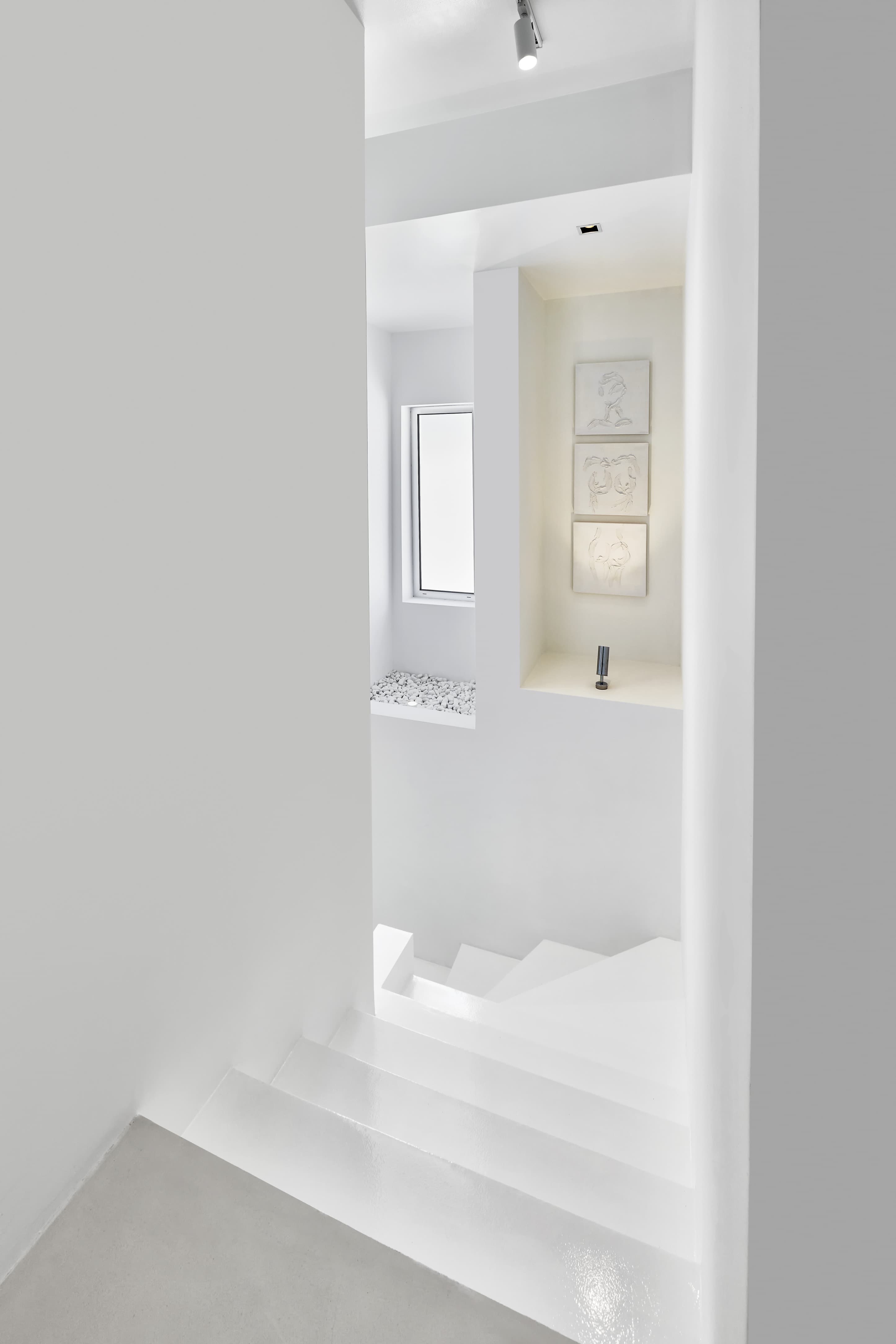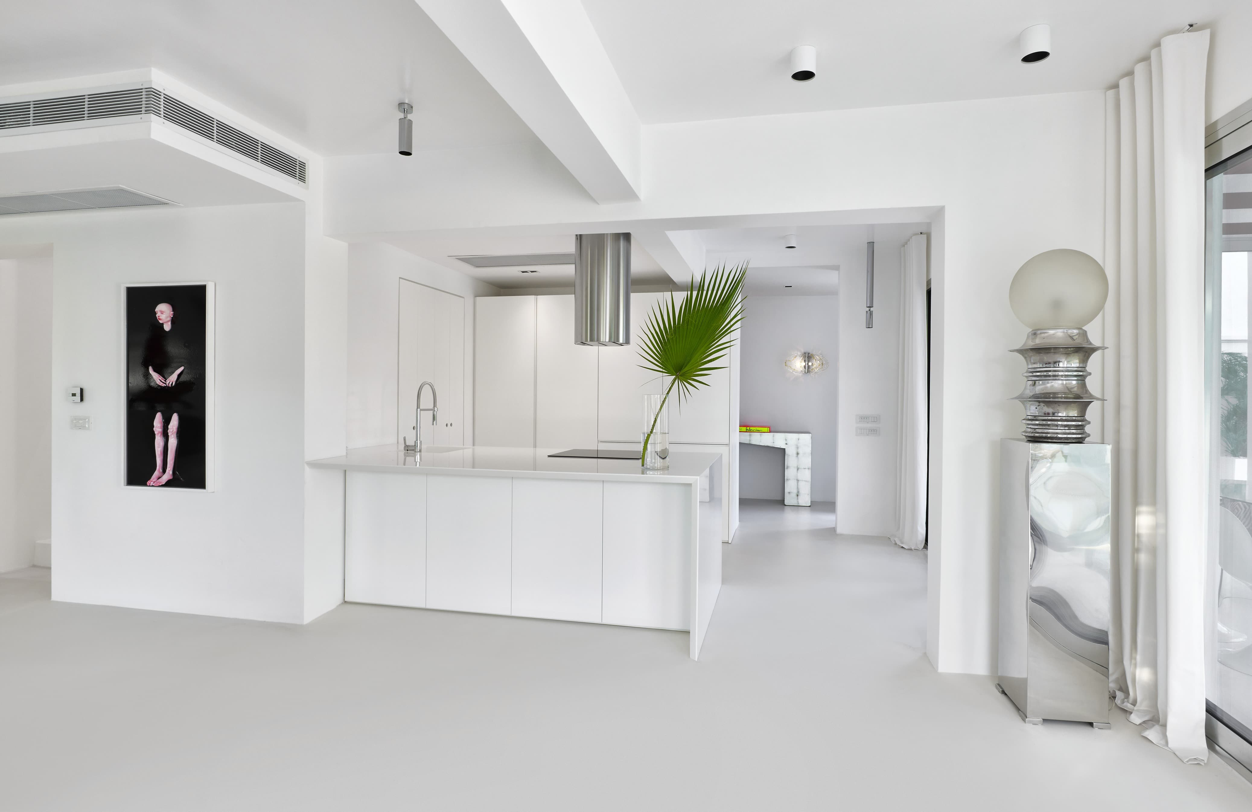 Основа интерьера – белая штукатурка, усиливающая ощущение простора. Белый здесь выступает в качестве архитектурного элемента: он поглощает и отражает интенсивный средиземноморский свет. Красные акценты придают пространству энергию: полосатые текстильные элементы, лакированные стулья и скульптурные детали.