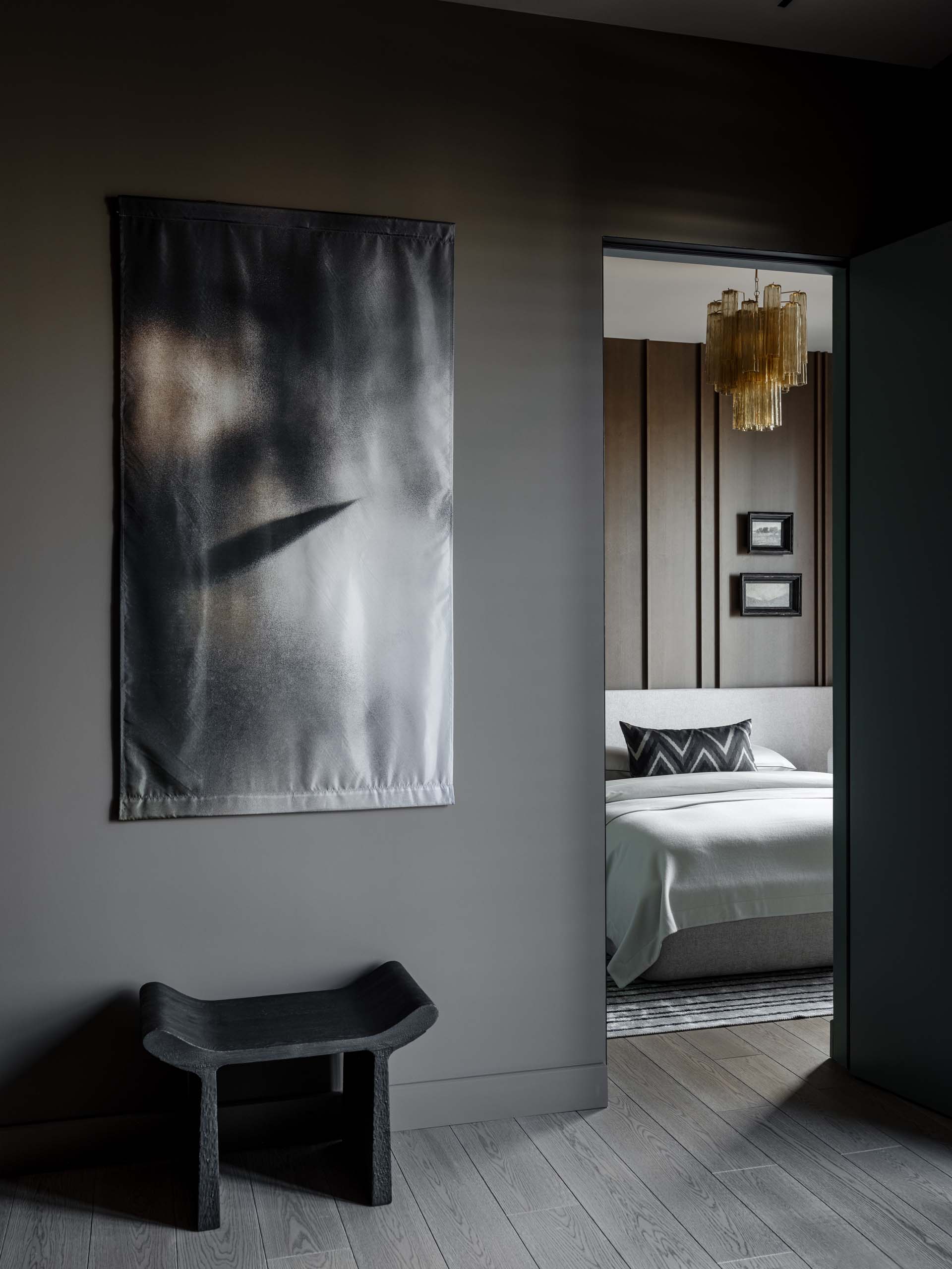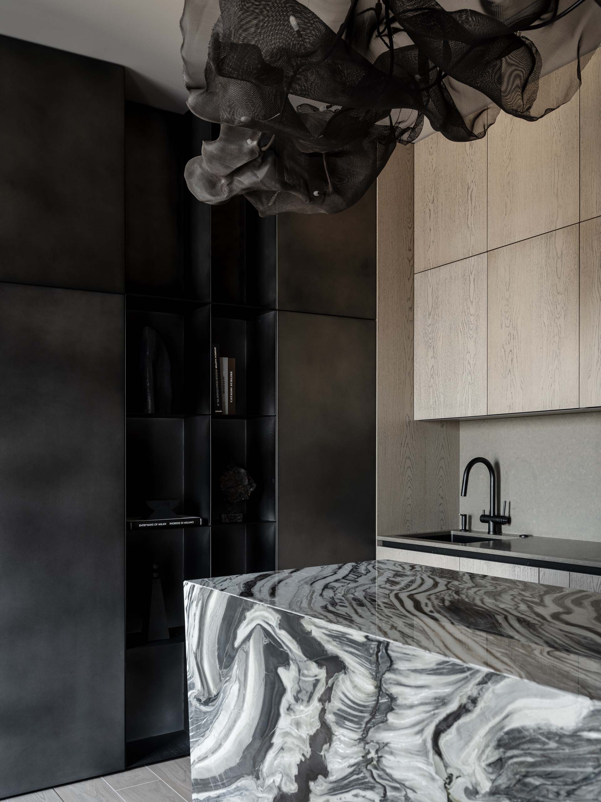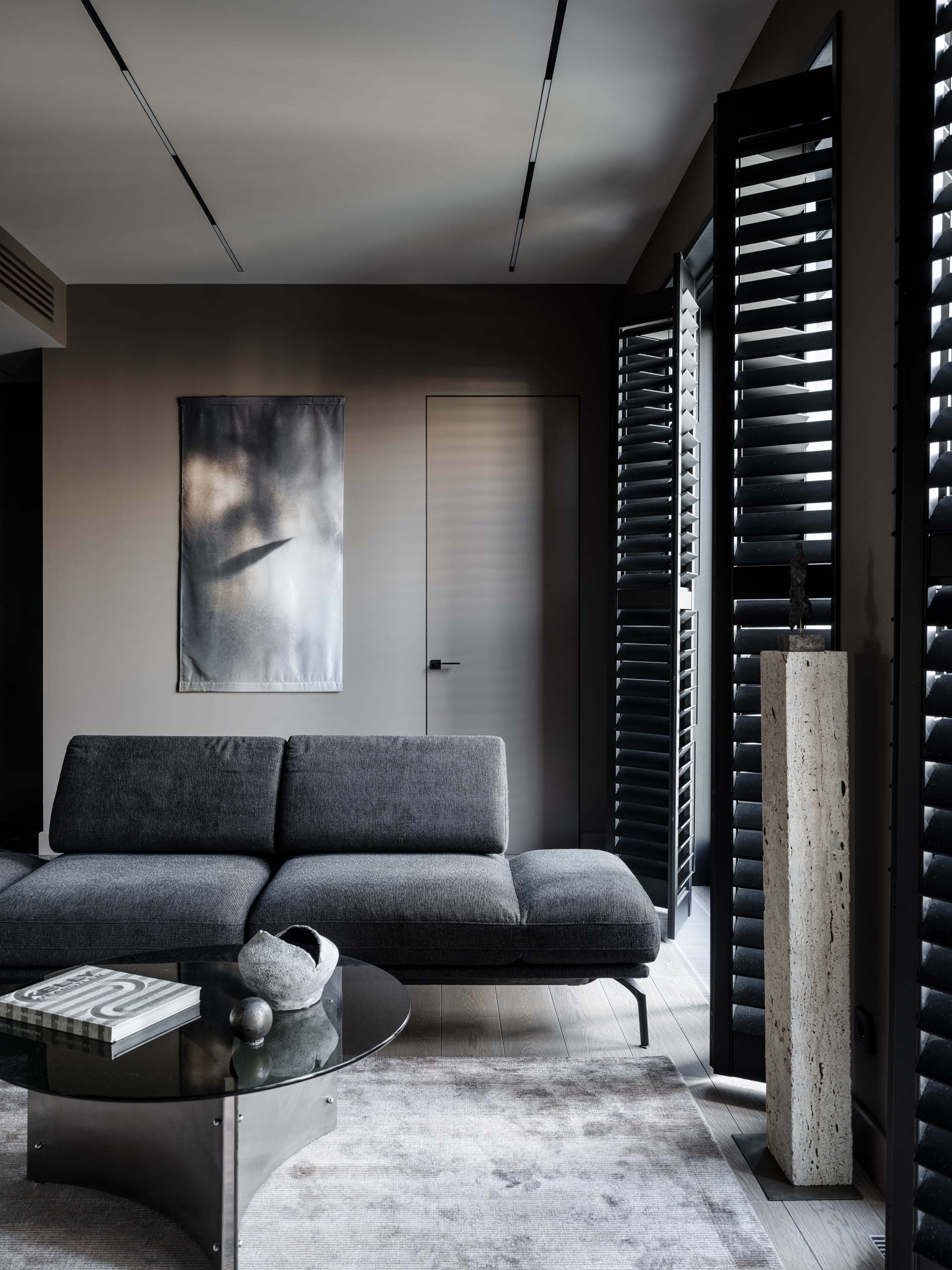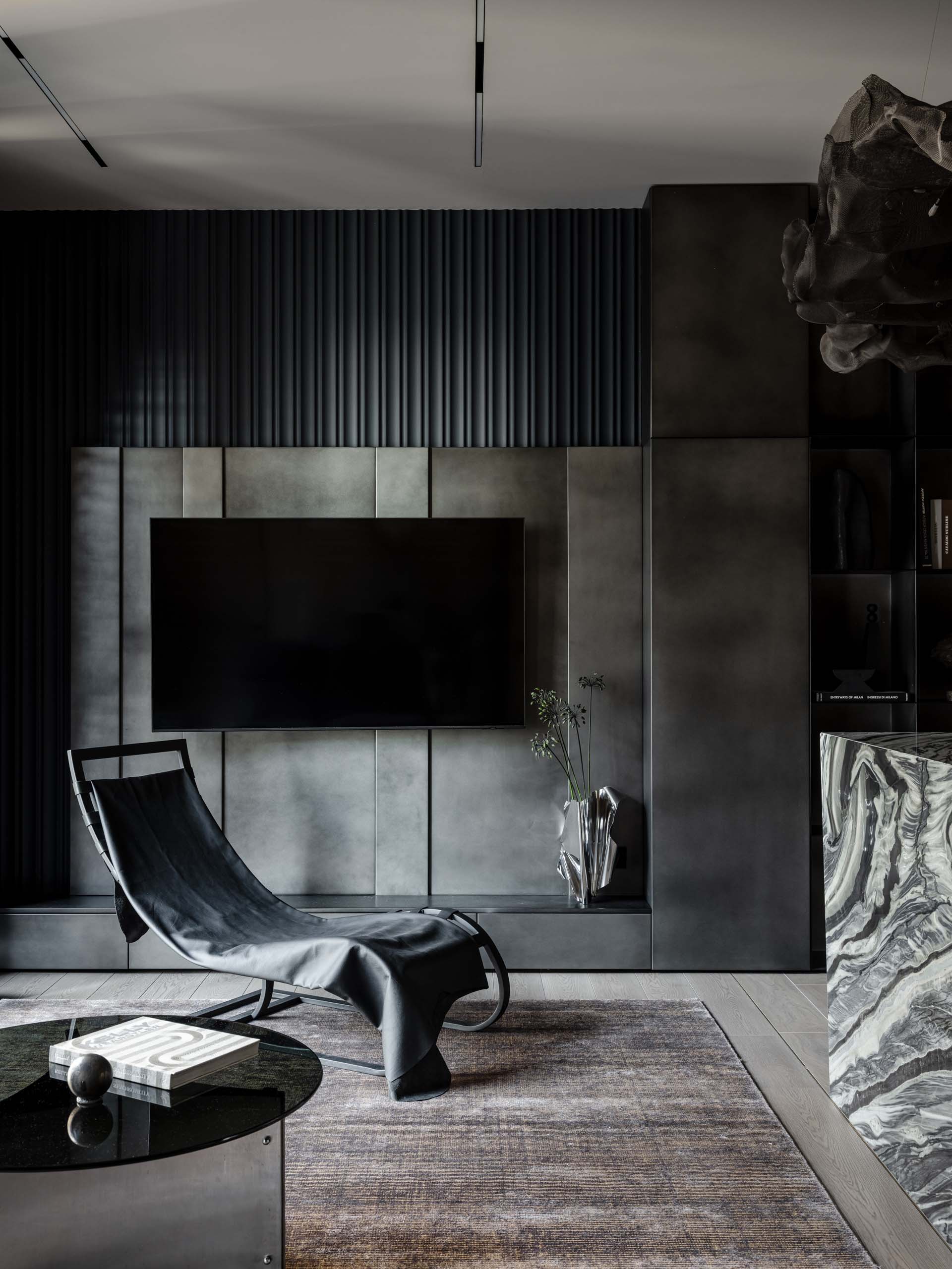 «Мой обычный клиент, который раньше всегда отдавал предпочтение классическим белым интерьерам, на этот раз обратился ко мне с очень неожиданной просьбой», — объясняет дизайнер. Марина Мирасова. «Она планирует жить в этой квартире одна и хочет создать для себя место тишины и покоя – темный интерьер в современном стиле без лишнего декора и украшений».