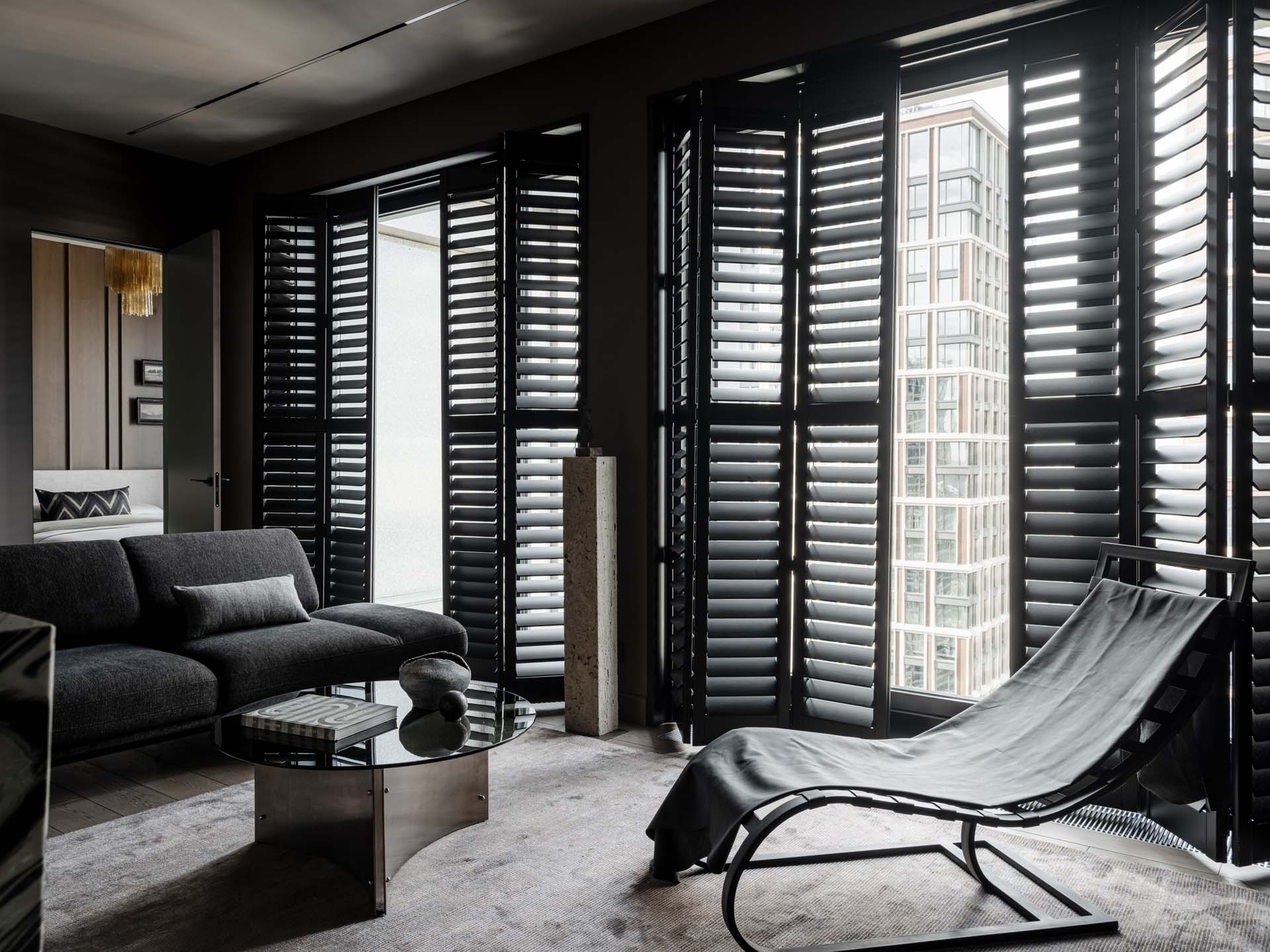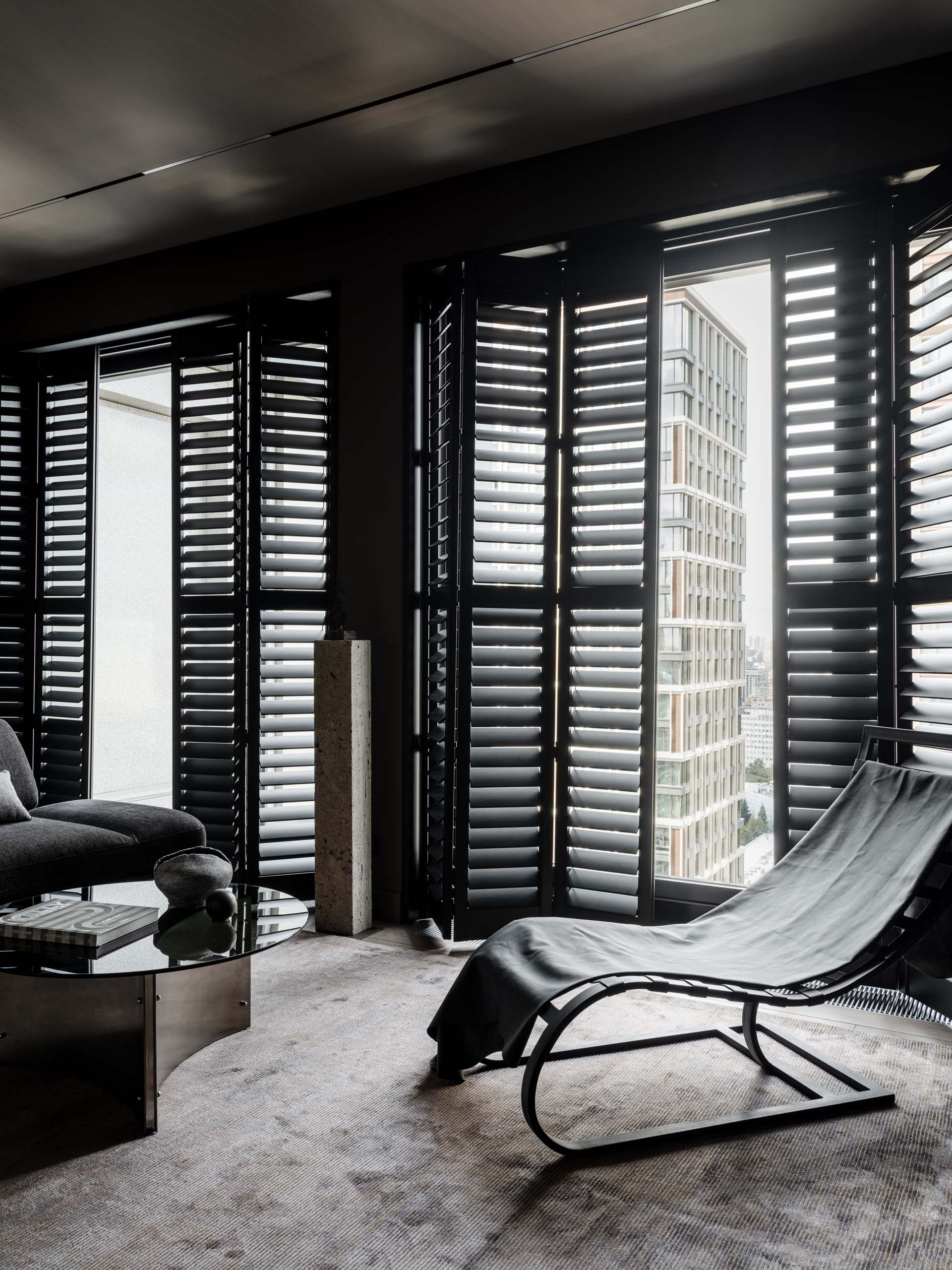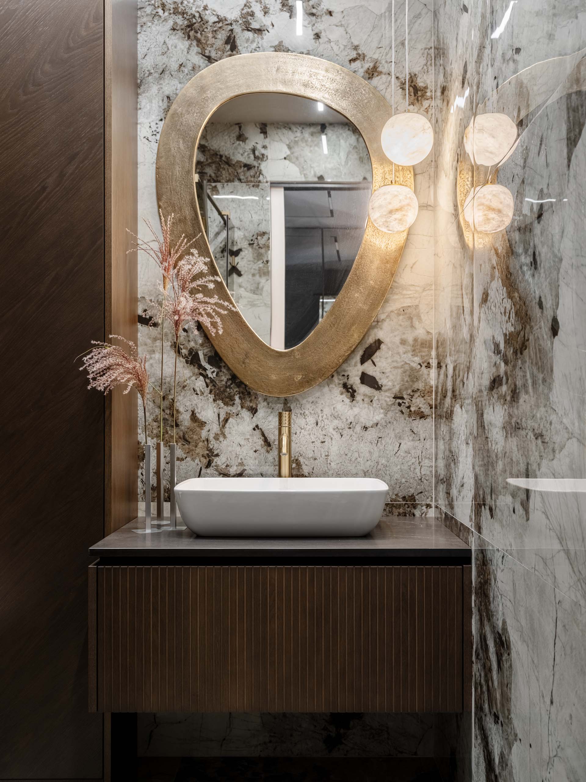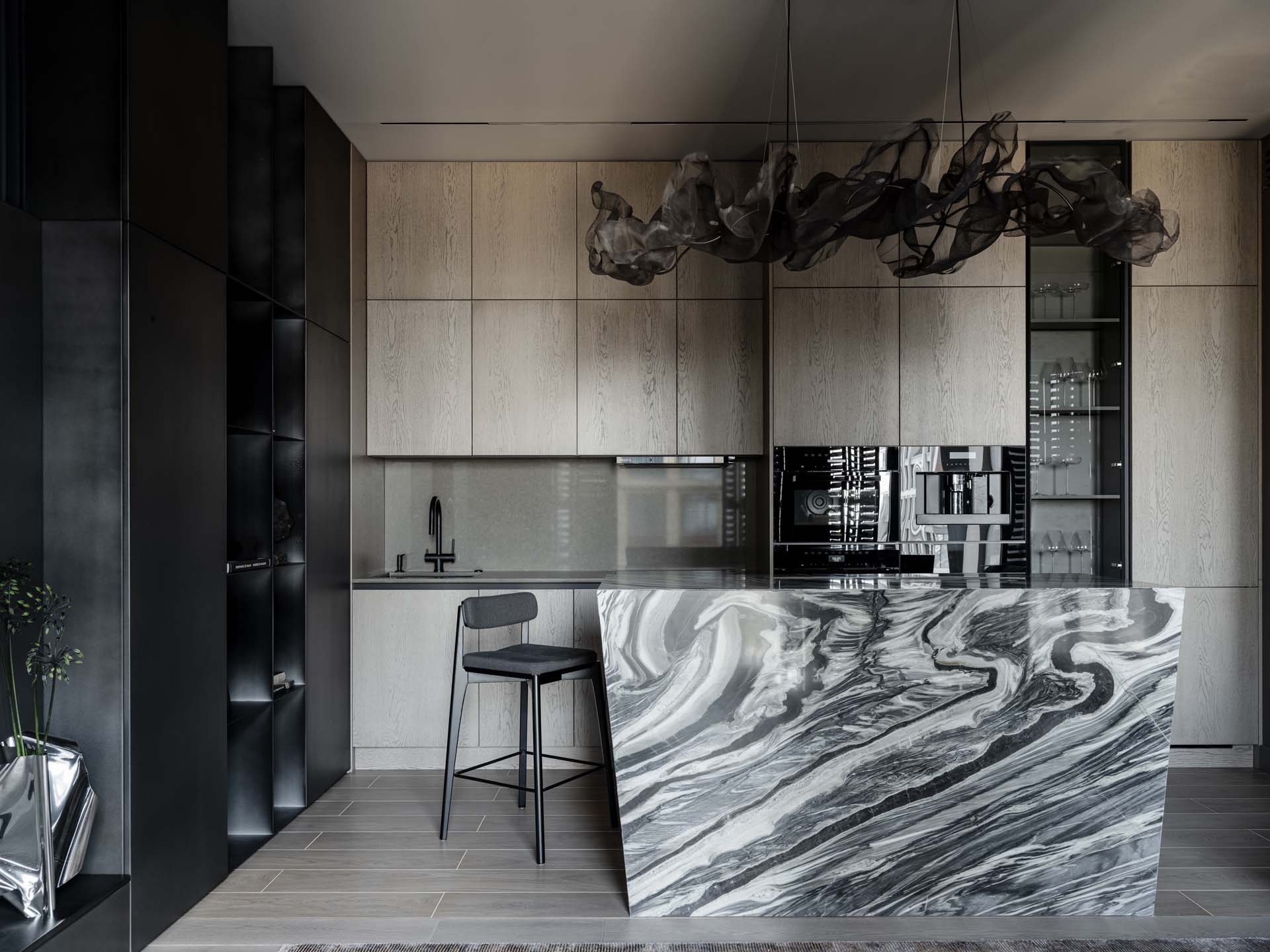 Металл в гостиной художественно патинирован; ее холодные тона уравновешиваются кухонными фасадами из натурального дубового шпона. Центром планировочной композиции стал остров, разделяющий кухонную зону и телевизионную зону. Он выполнен из мрамора с активным узором, которому перекликается люстра из металлической сетки, созданная по эскизам дизайнера. Окна украшены ставнями из натурального бука, создающими в пространстве красивый узор теней – это решение стало ключевым в построении образа.