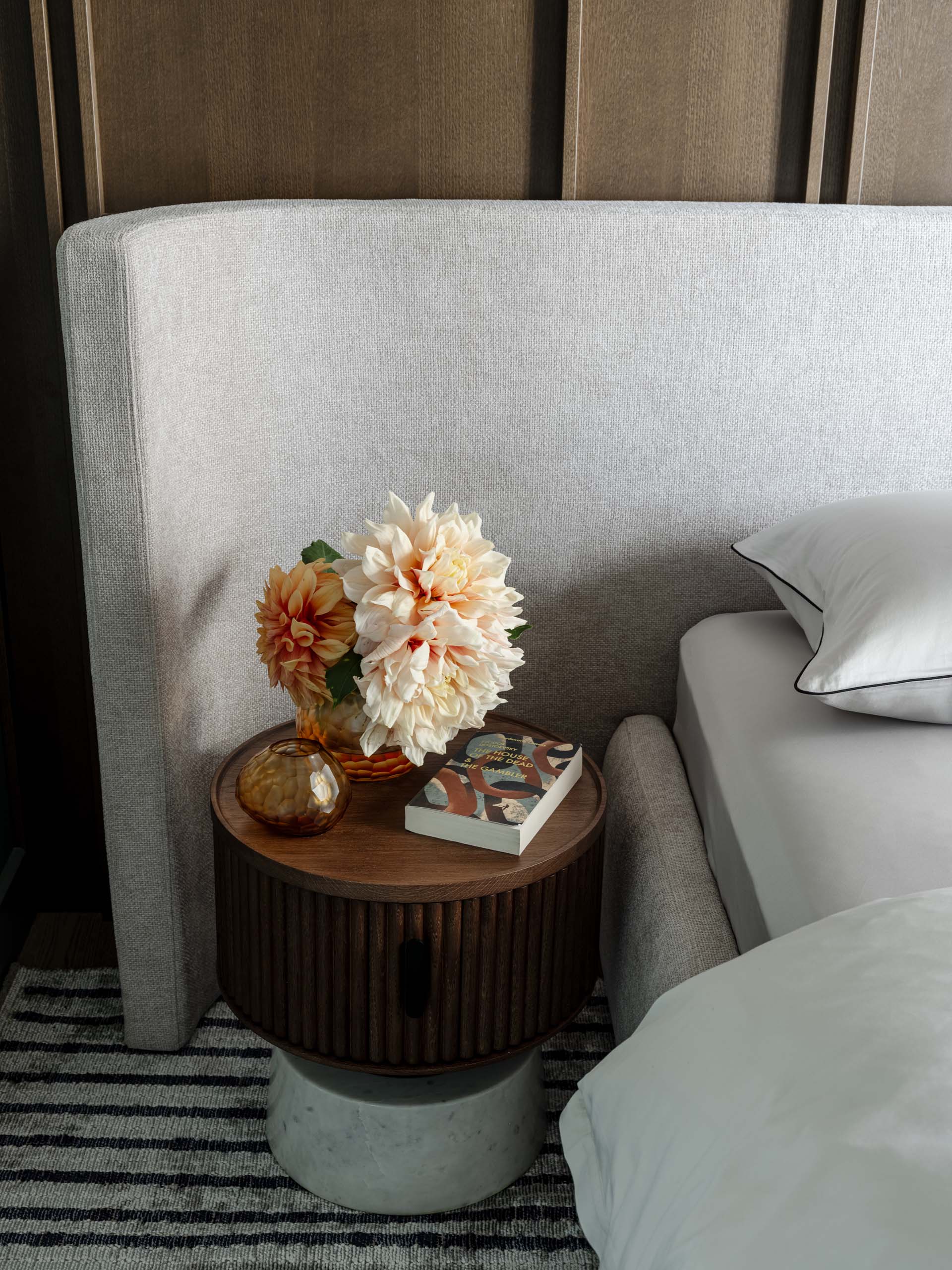 Вся мебель изготовлена столярной компанией по эскизам дизайнера. Туалетный столик, основа для скульптуры в гостиной и остров на кухне также созданы по дизайну Марины. Их дополнила винтажная люстра в спальне и винтажный журнальный столик.