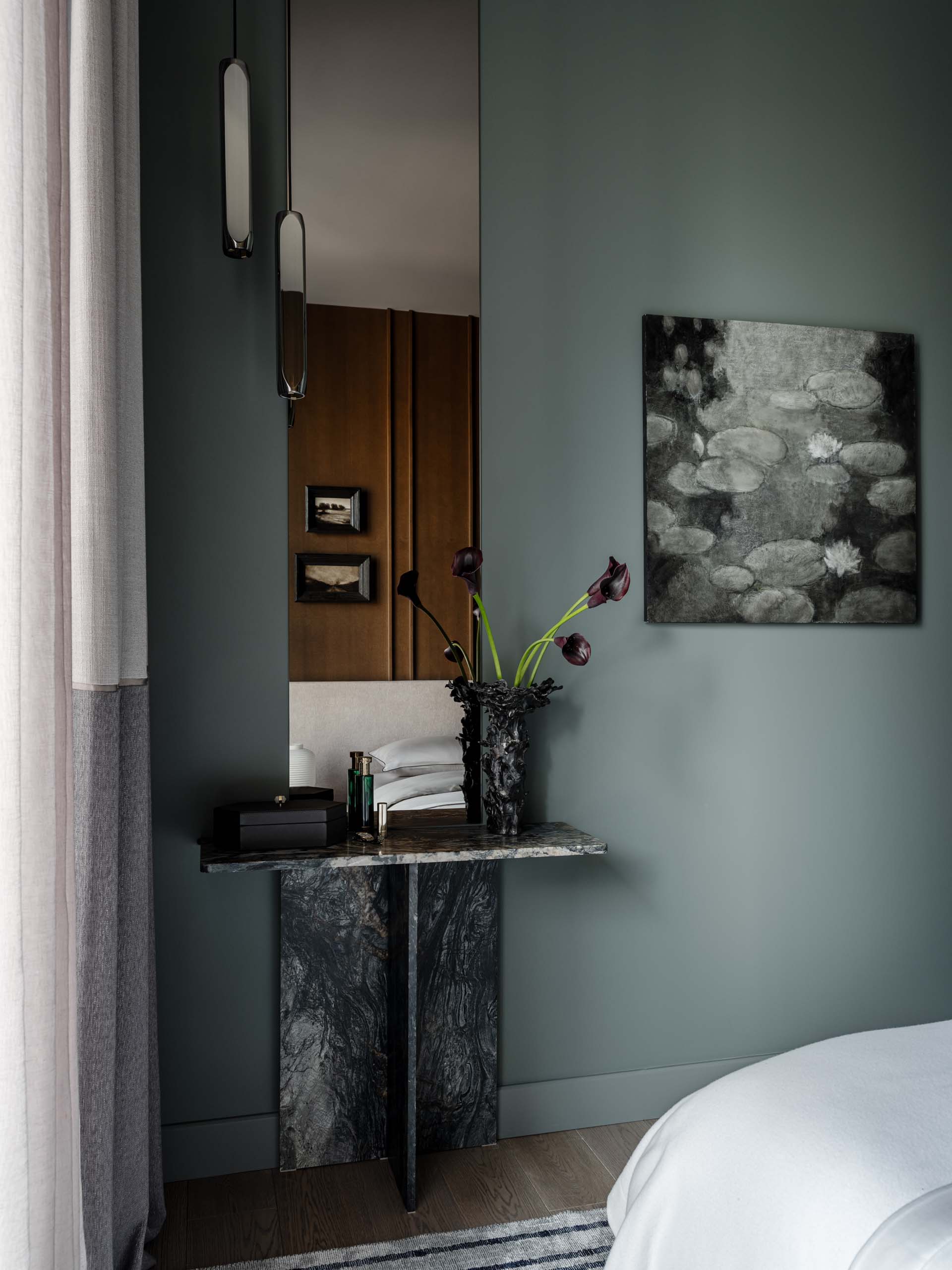 «Цветовая палитра интерьера включает преимущественно темные тона. Общее пространство я «одел» в единый цвет, используя так называемый «эффект коробки», чтобы маленькое пространство выглядело более просторным и целостным. Контрастные черные оттенки подчеркивают брутальность пространства. В спальне мы использовали оттенки туманного леса, придавая помещению дополнительную глубину».