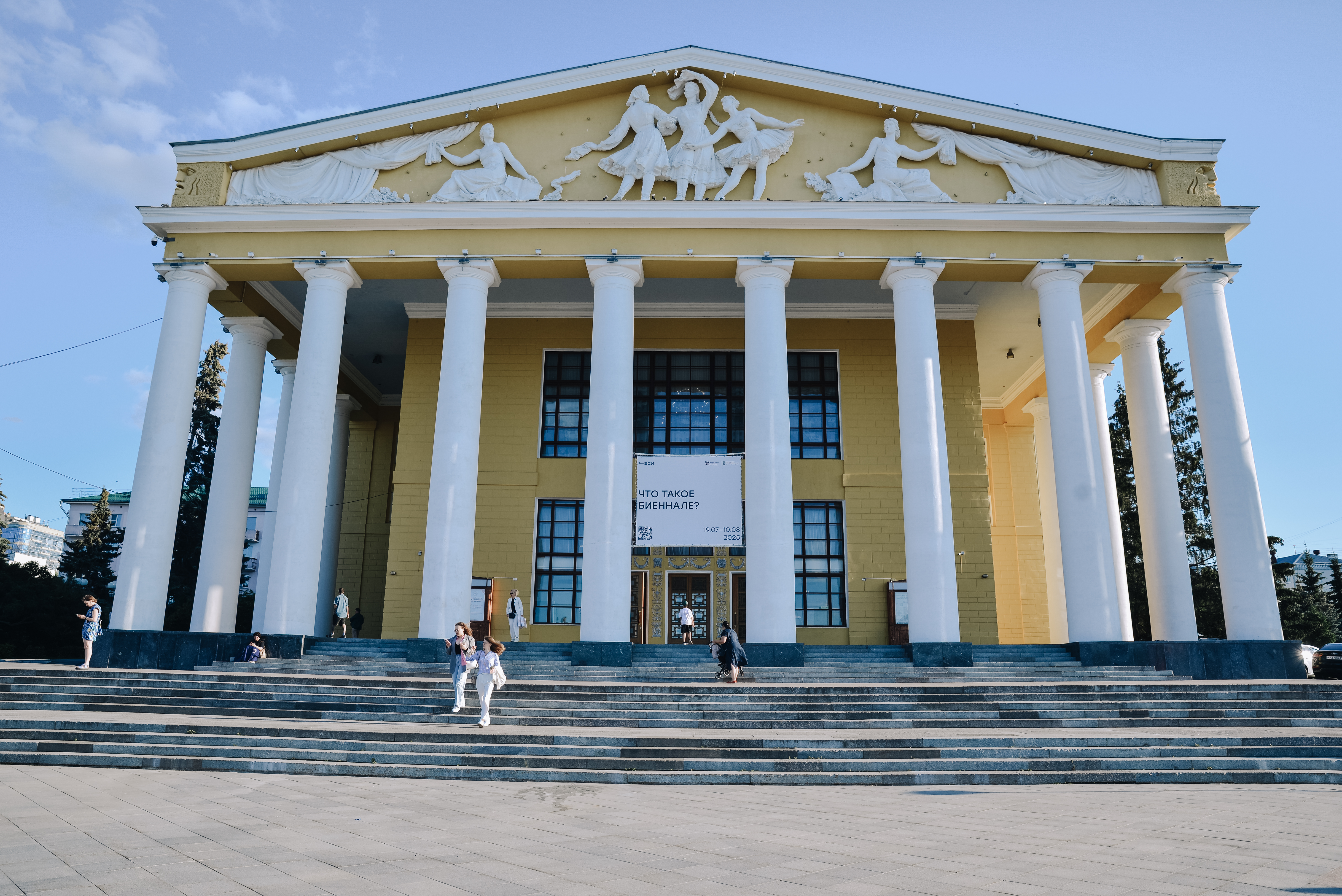 У входа в театр есть баннер с надписью «Что такое биеннале?» …