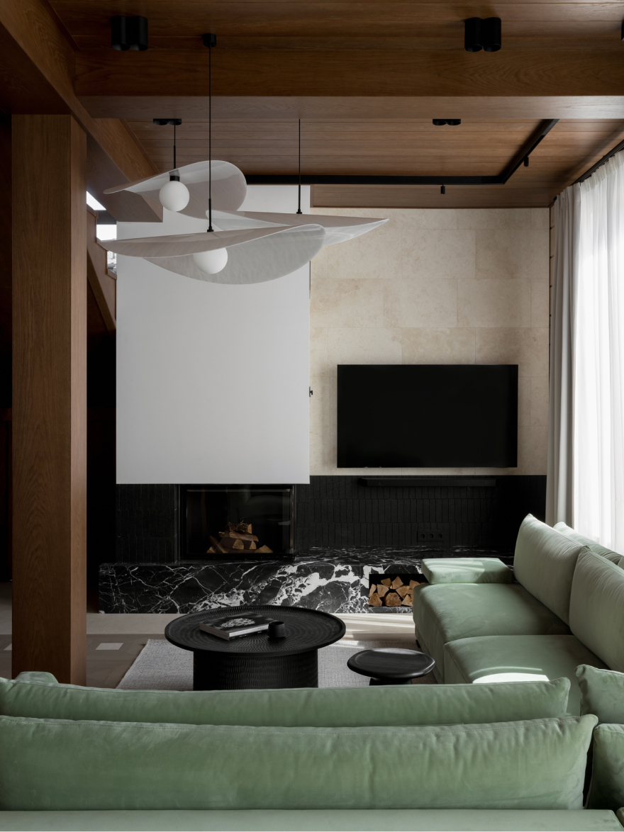 Для облегчения зрительного восприятия древесину максимально сохранили, но придали ей светлый оттенок. Для отделки использовано большое количество материалов с натуральной фактурой: керамогранит, напоминающий узоры камня, в напольных покрытиях, массив дерева в деталях лестниц, натуральные фактуры в текстиле. Центральным элементом гостиной стал угловой камин из трех видов камня: натурального мрамора, геометрически фрезерованного сланца и травертина.