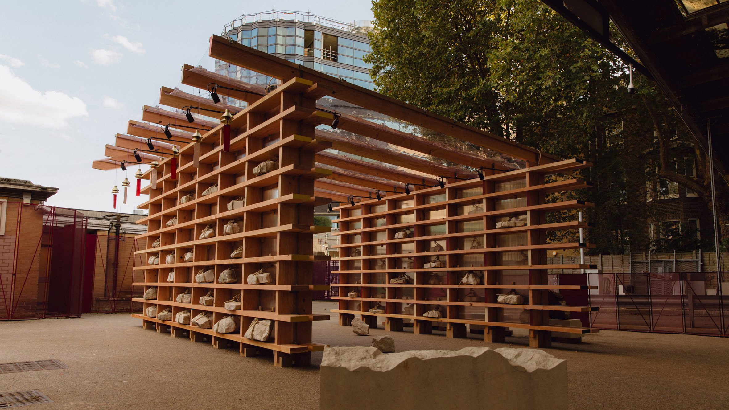 В рамках Лондонского фестиваля дизайна Рио Кобаяши в сотрудничестве с инженерной фирмой Webb Yates создал свой первый павильон — абстрактное изображение дома в Японии, где он жил в детстве. Как следует из названия, павильон Off The Shelf изготовлен из сборных материалов: стандартных досок из ели Дугласа, листов поликарбоната и ПВХ. Материалы оставались необработанными, чтобы их можно было вернуть производителям и повторно использовать после завершения установки.