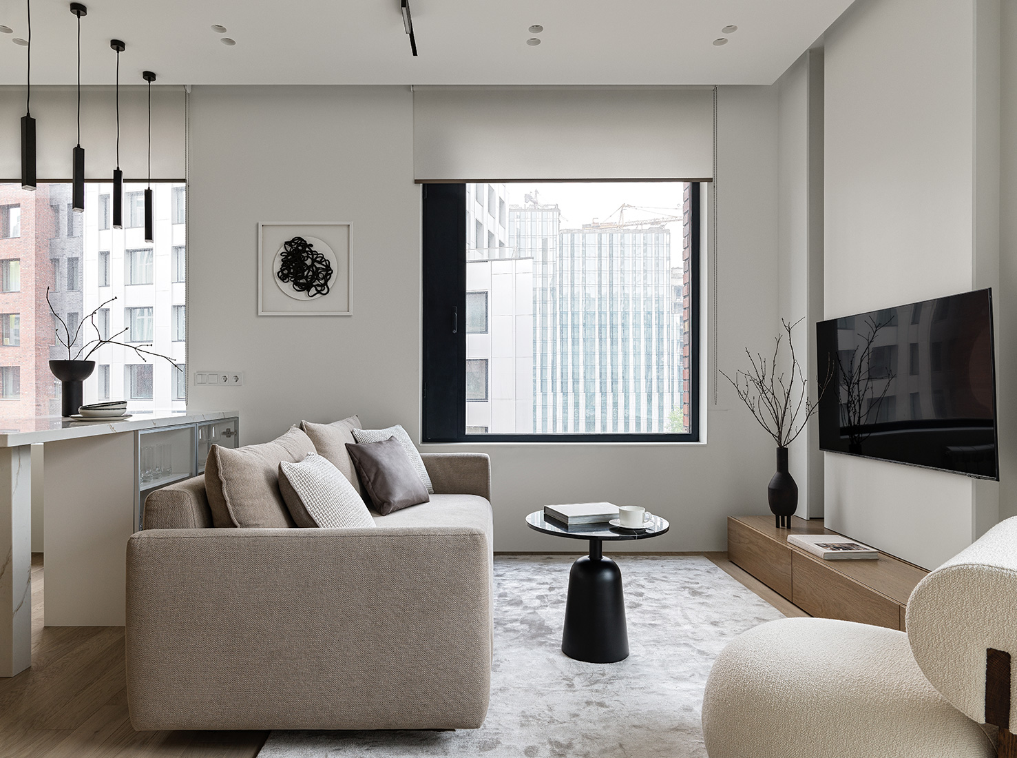 «Квартира с видом на реку. Мы не хотели загораживать обзор, поэтому в проекте были использованы только рольставни. В целом из-за количества окон здесь много естественного света, но это также создавало некоторые трудности при планировании», — добавляют в команде.