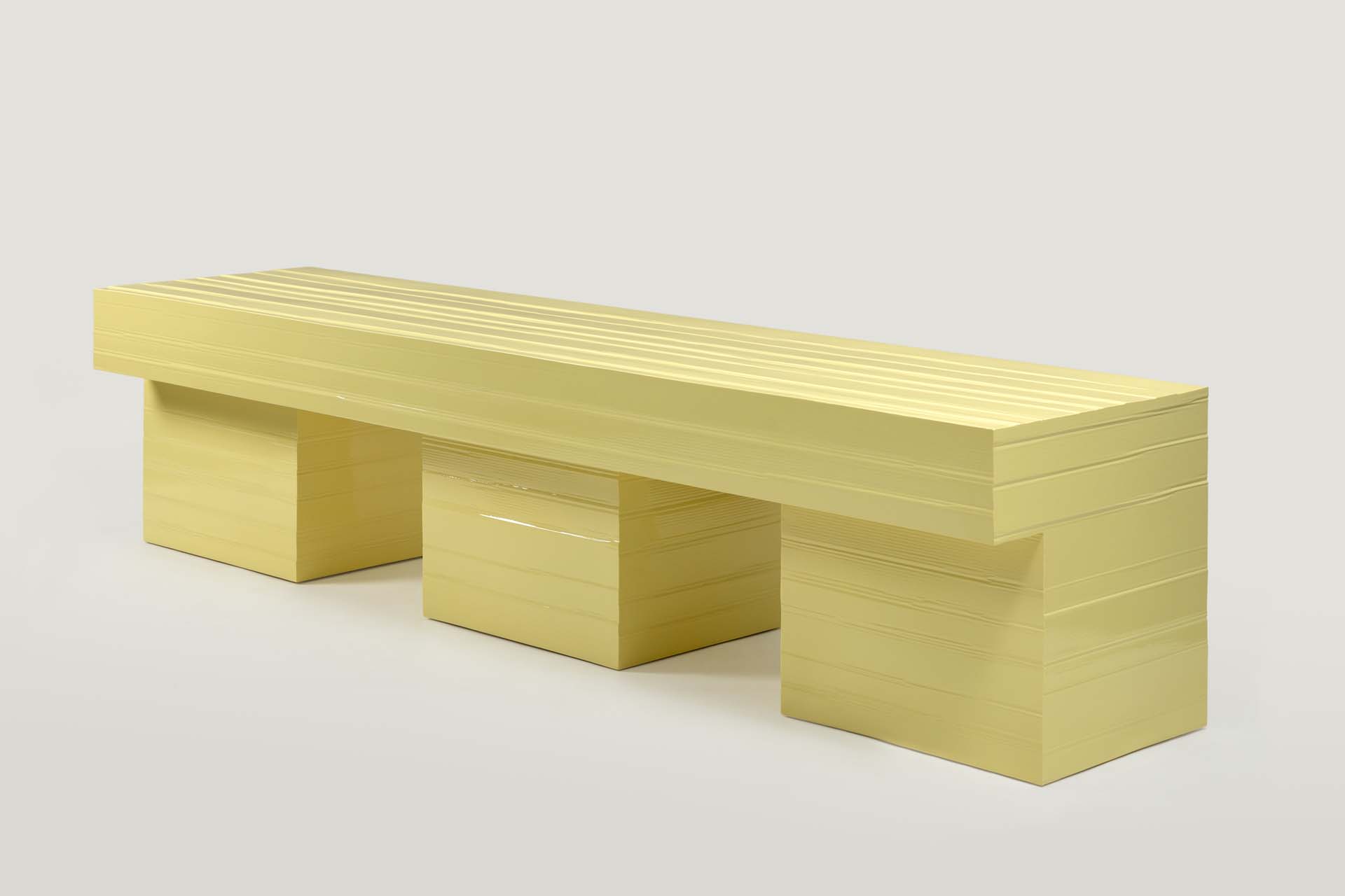 Скамейка Jello Марко Кампардо в мягких оттенках кремово-желтого цвета отражает экспериментальный подход художника: изготовленная из фигур из ламинированного картона, она сохраняет отпечаток их складок и линий. Эти современные предметы вступают в визуальный диалог с шедеврами французского и итальянского светодизайна ХХ века, в том числе с торшером. Джино Сафратти 1050/2 1951 г. Изготовлен из черного мрамора, латуни и лакированного металла, он создает драматический, но гармоничный контраст с консолью и скамьей, усиливая ритм выставки.
