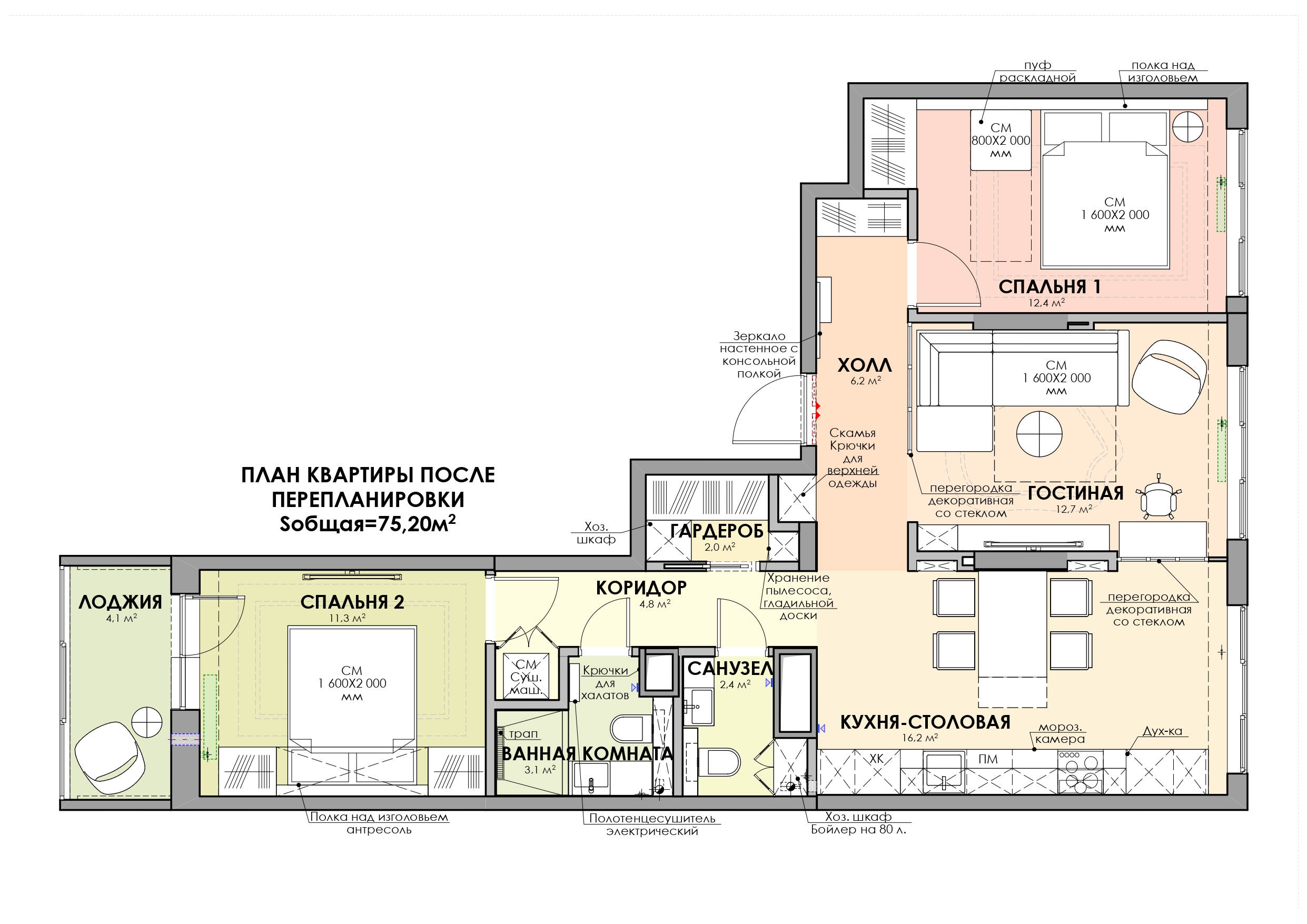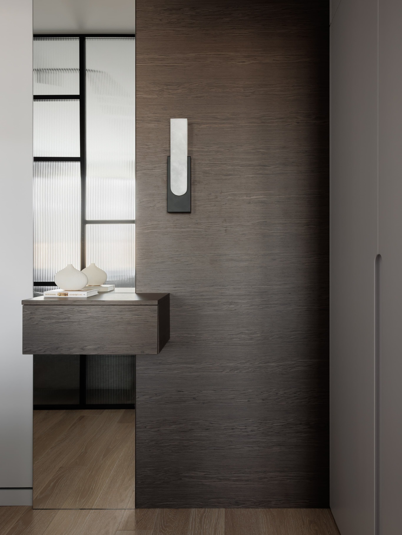 «Мы и раньше работали с такими клиентами, но в этот раз изъявили желание создать две отдельные спальни, одну для мужчин и одну для женщин. Первоначальная планировка в целом соответствовала запросу, и нам потребовалось лишь несколько незначительных корректировок. Мы демонтировали часть стены между кухней и гостиной и установили там перегородки из рифленого стекла. Нам не разрешили объединять комнаты, но мы создали иллюзию перетекающего пространства: свет свободно проходит сквозь стекло, что делает размытый силуэт соседней комнаты видимым и визуальным», увеличивает обе комнаты.
