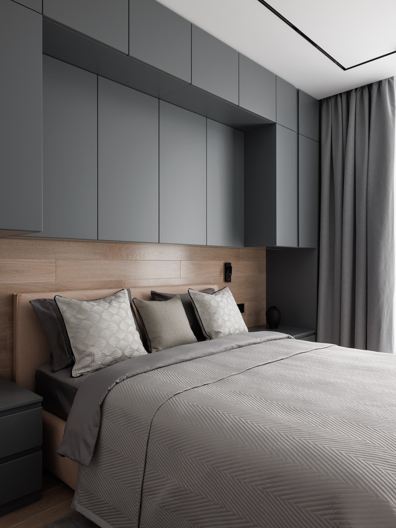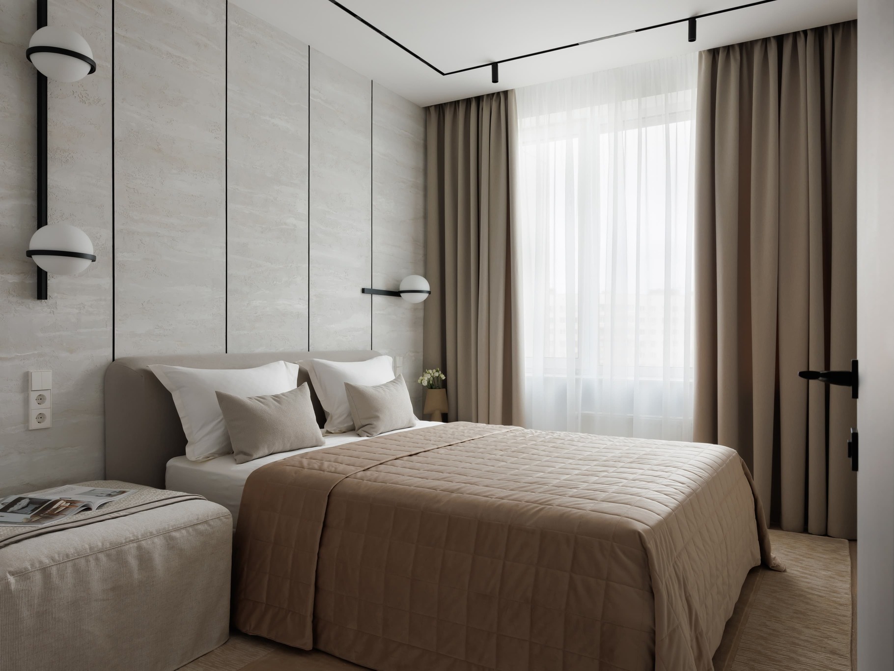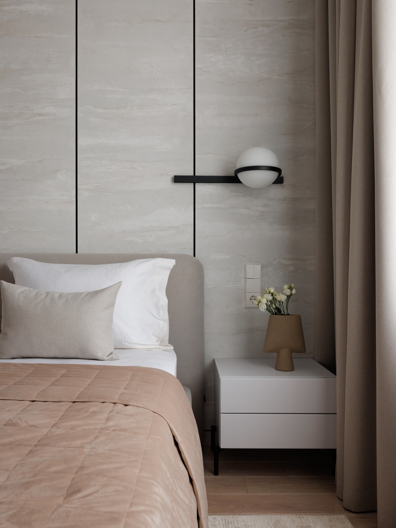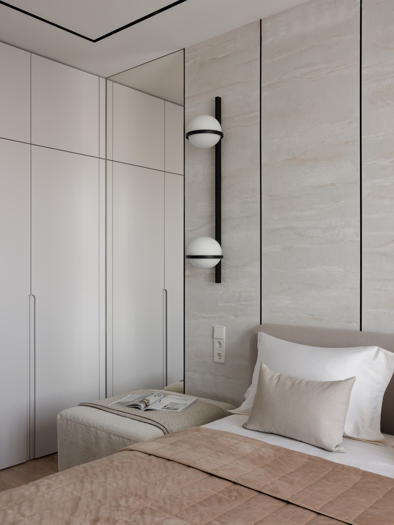 «Нашей главной целью было создать современное, светлое и воздушное пространство, не перегруженное мебелью и декором. Мы осознанно шли к этой цели, работая с материалами и светом. Например, в спальне использовали декоративную штукатурку травертин, но намеренно разделили полотна черными теневыми профилями, чтобы придать пространству современный ритм. По всему периметру квартиры были использованы теневые плинтусы, создающие эффект «парящих» стен, а в некоторых помещениях осовременили этот прием – оставили отпечаток в виде графического черного пространства.