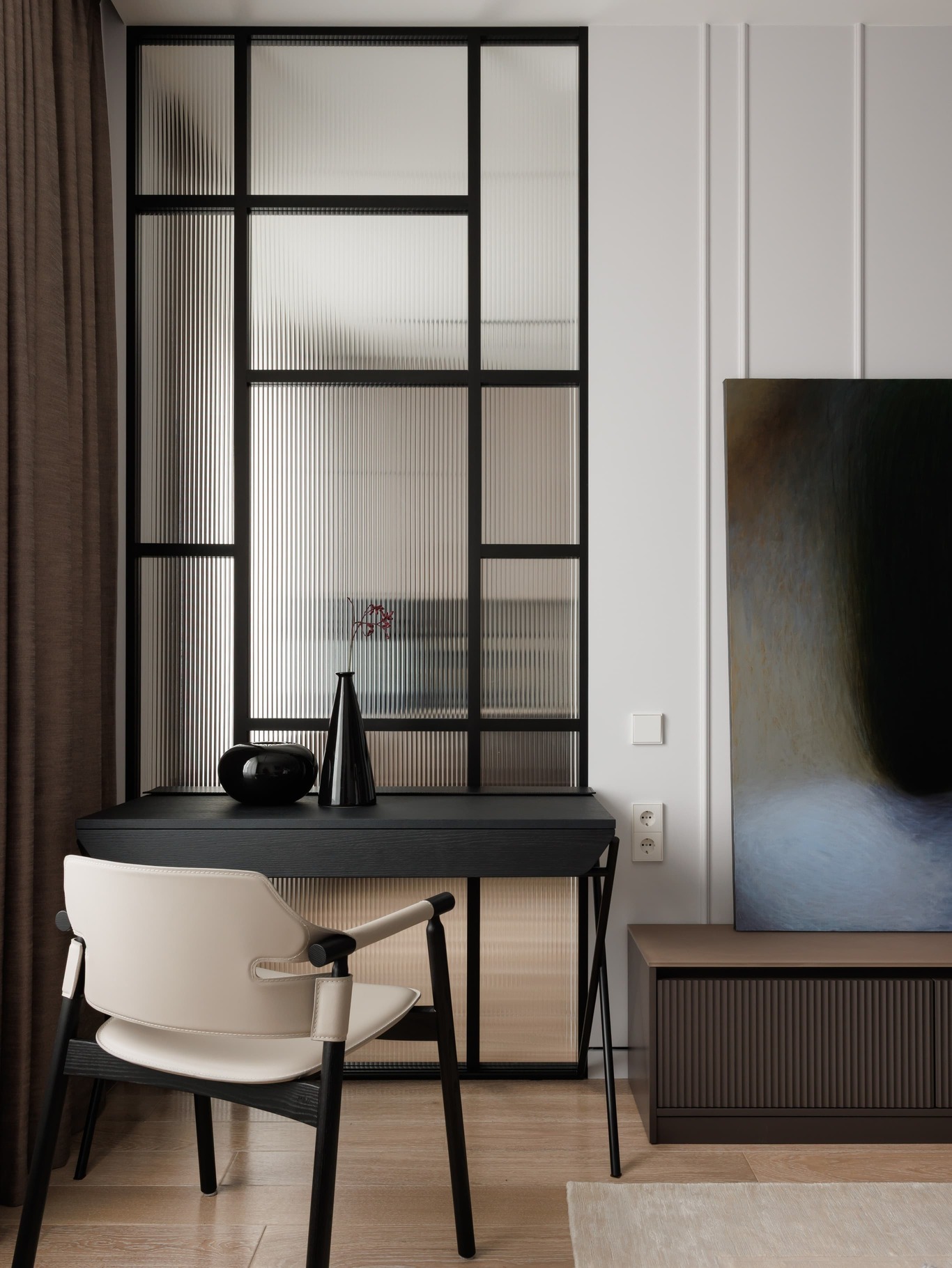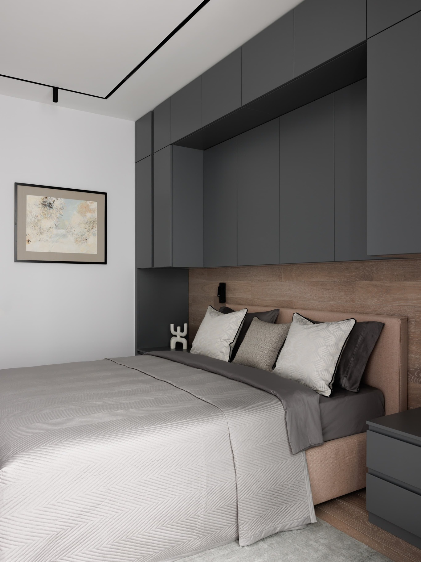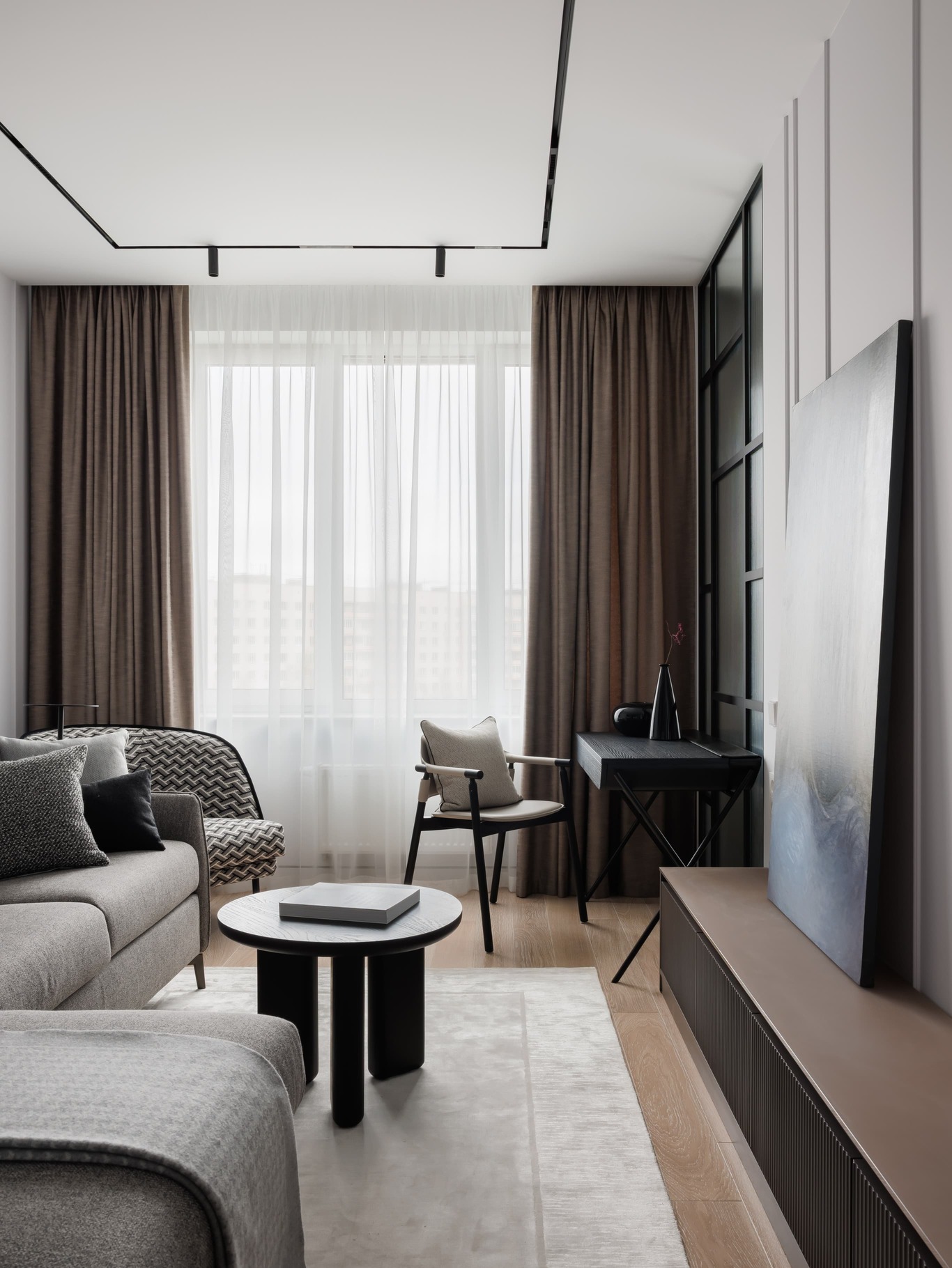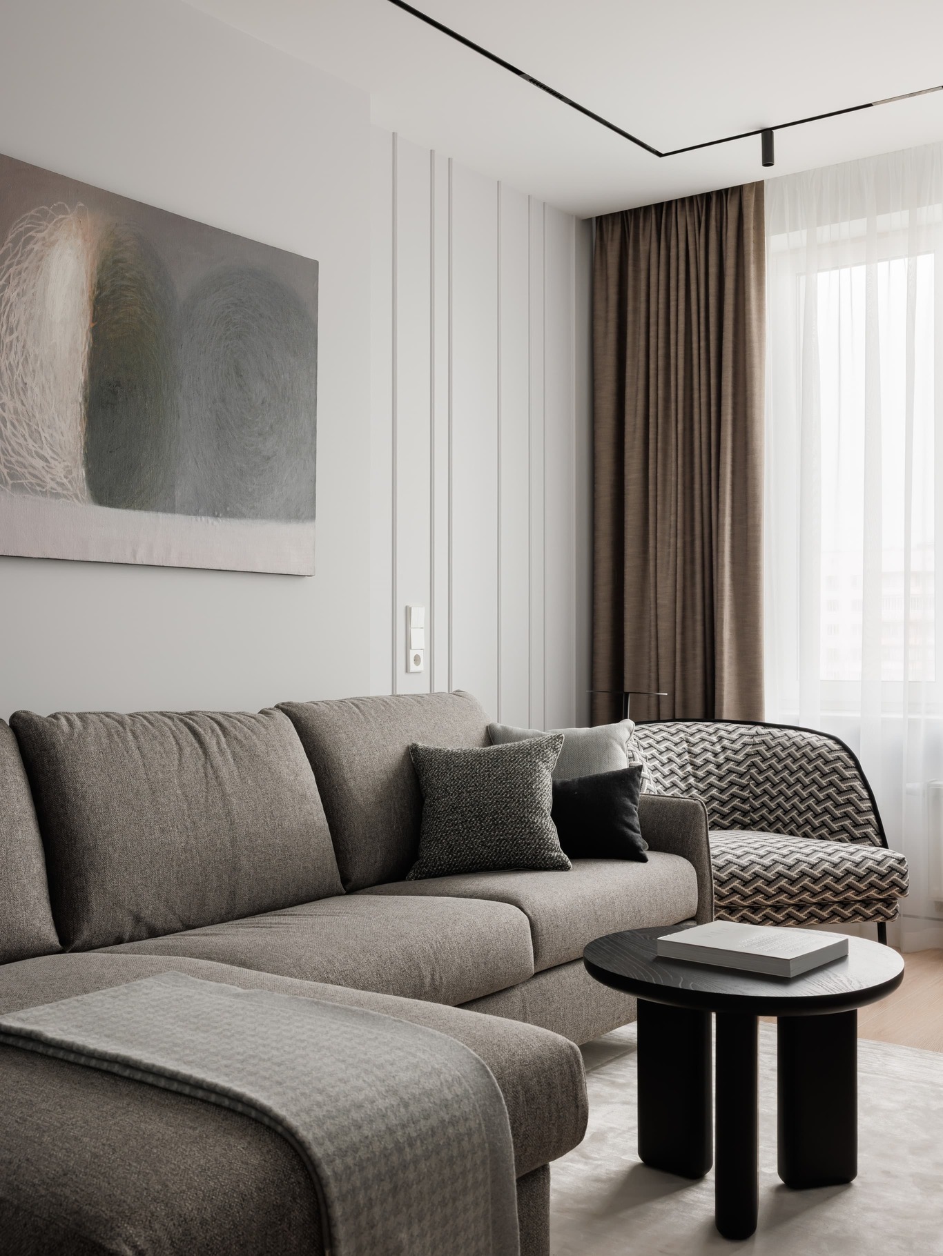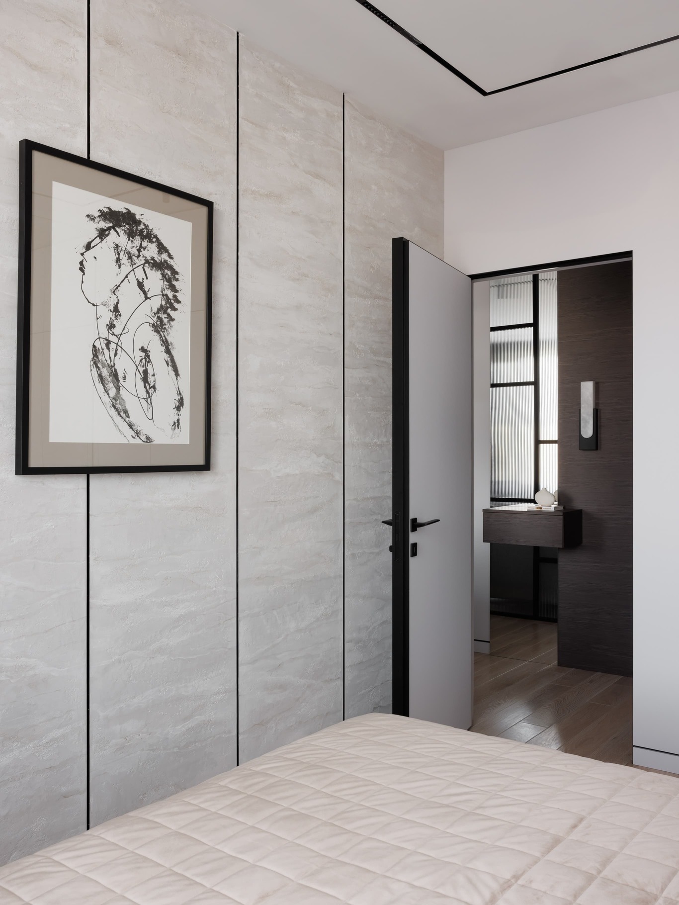 «Нашей главной целью было создать современное, светлое и воздушное пространство, не перегруженное мебелью и декором. Мы осознанно шли к этой цели, работая с материалами и светом. Например, в спальне использовали декоративную штукатурку травертин, но намеренно разделили полотна черными теневыми профилями, чтобы придать пространству современный ритм. По всему периметру квартиры были использованы теневые плинтусы, создающие эффект «парящих» стен, а в некоторых помещениях осовременили этот прием – оставили отпечаток в виде графического черного пространства.