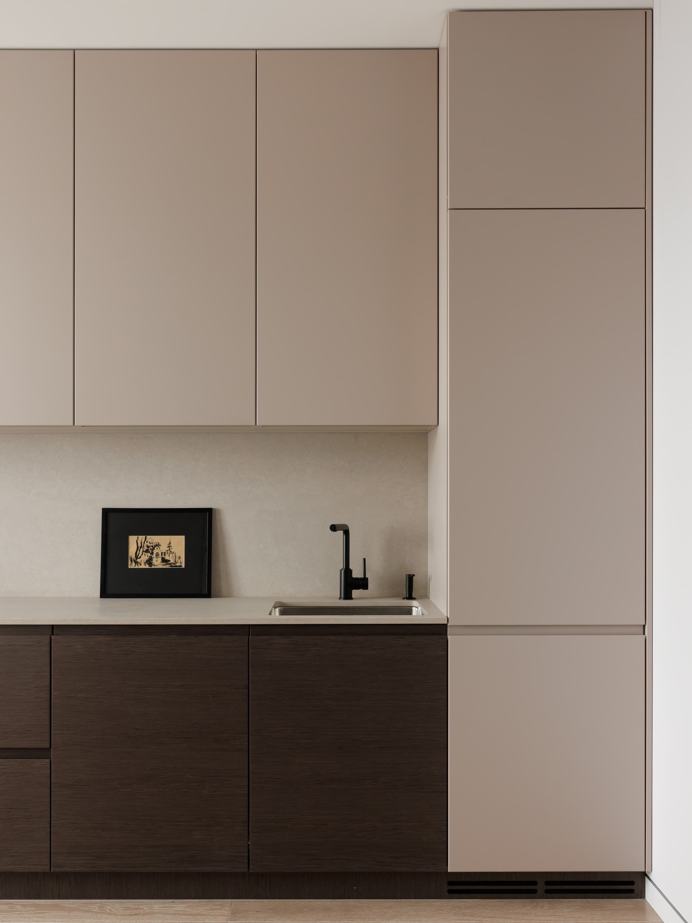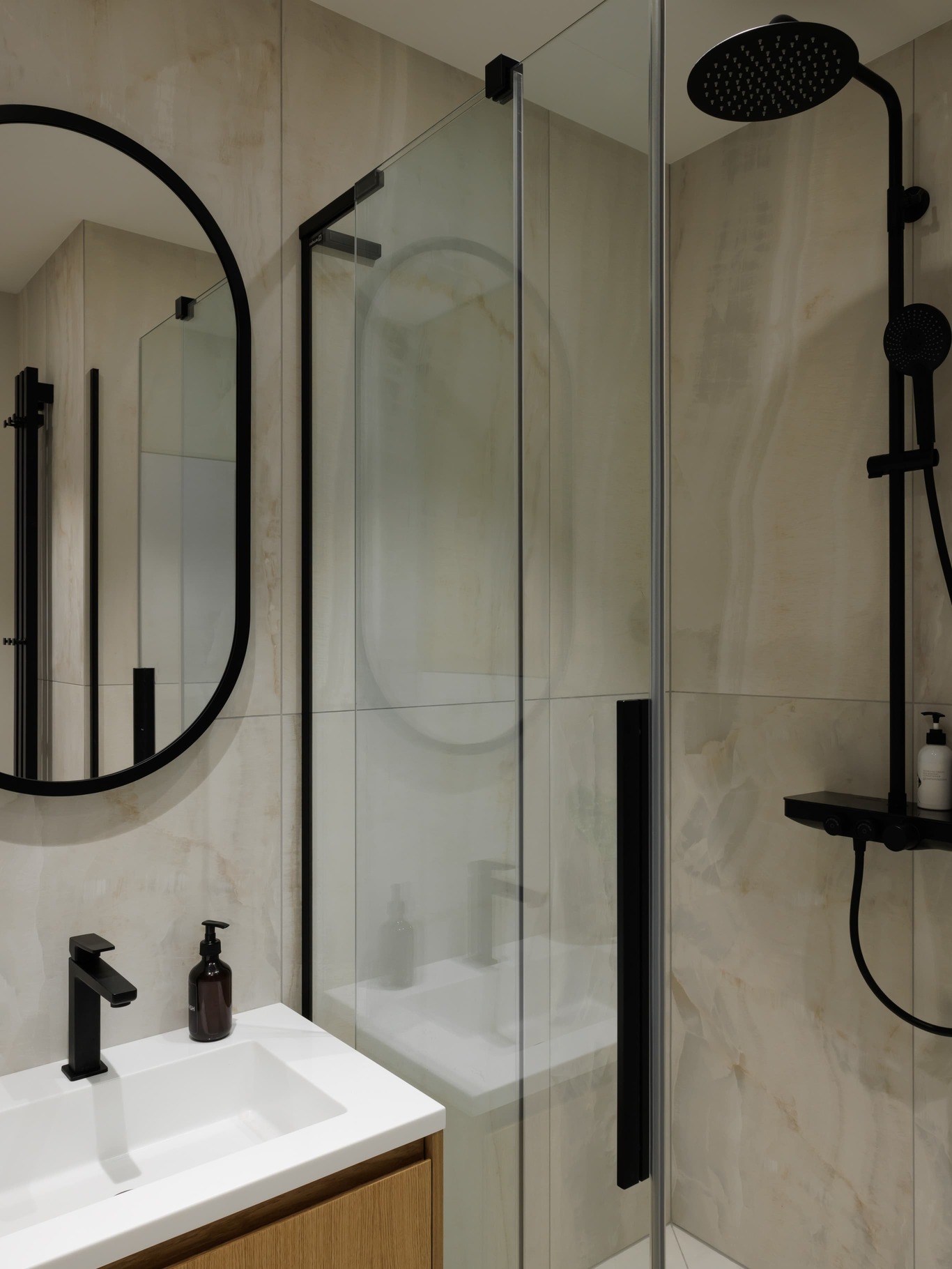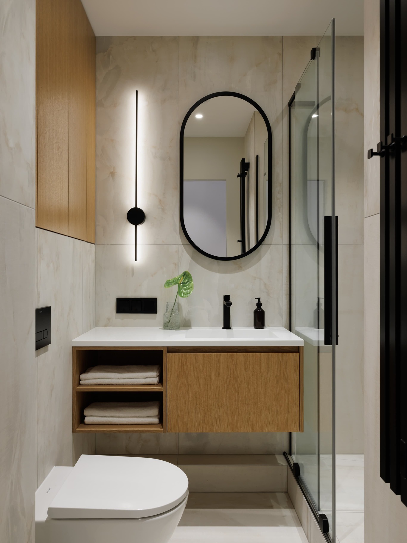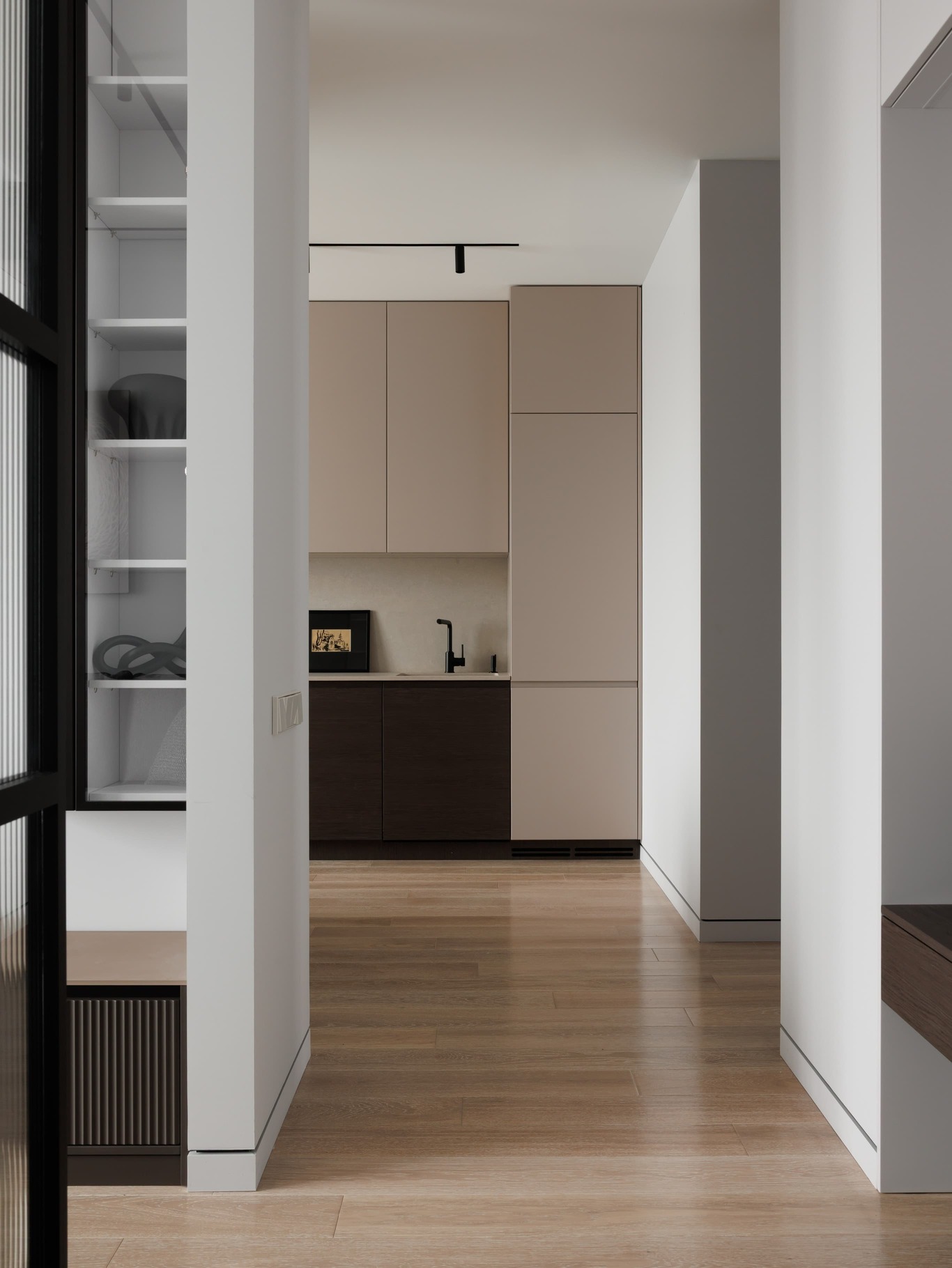 «Нашей главной целью было создать современное, светлое и воздушное пространство, не перегруженное мебелью и декором. Мы осознанно шли к этой цели, работая с материалами и светом. Например, в спальне использовали декоративную штукатурку травертин, но намеренно разделили полотна черными теневыми профилями, чтобы придать пространству современный ритм. По всему периметру квартиры были использованы теневые плинтусы, создающие эффект «парящих» стен, а в некоторых помещениях осовременили этот прием – оставили отпечаток в виде графического черного пространства.