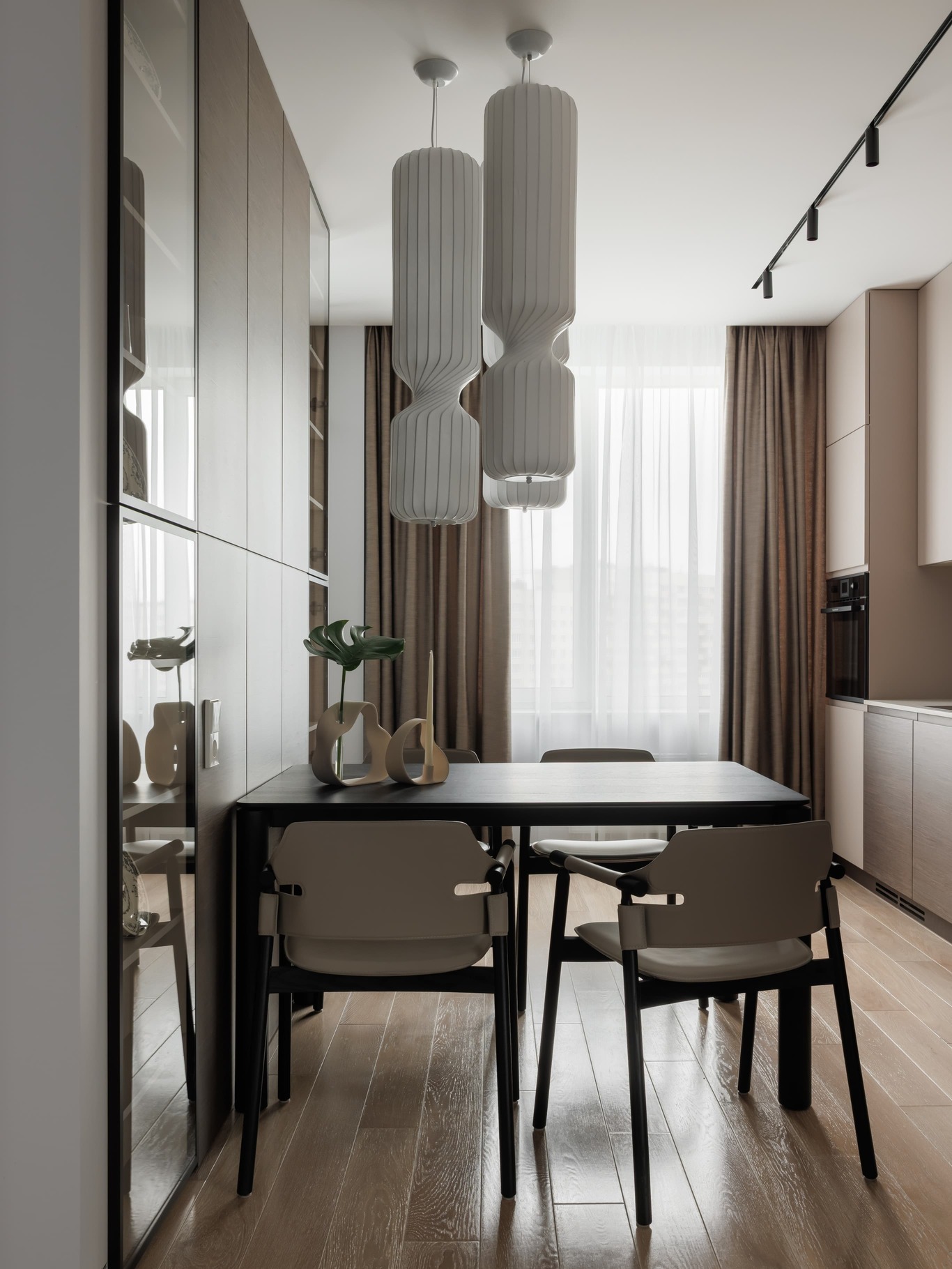 «Всю корпусную и кухонную мебель мы заказывали у проверенного российского производителя, с которым сотрудничаем уже много лет. Особенно ценно то, что он прекрасно реализовал сложную техническую задачу — скрытие вентиляционного гофра вытяжки внутри шкафов. Кровати, диван и элементы декора были выбраны от итальянских производителей — успешный опыт предыдущего проекта убедил клиентов снова обратиться к проверенной гостиной с ассортиментом. Европейский светильник в основном основан на функциональных треках с точечными светильниками; мы позволили себе только два декоративных акцента — люстру в обеденная зона и бра в женской спальне.