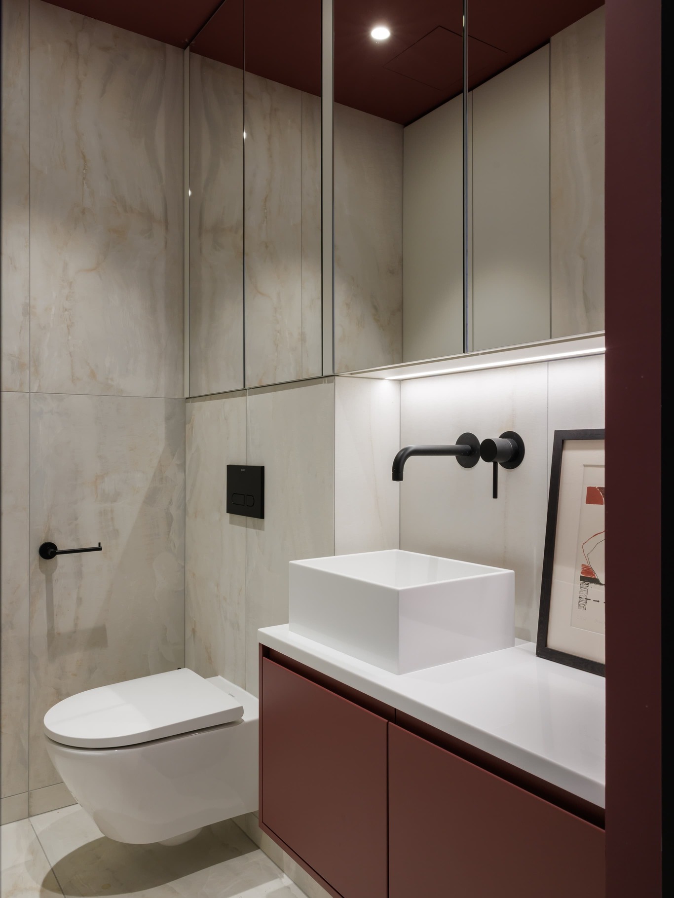 «Цветовая гамма основана на спокойных светло-серых оттенках, которые так любят наши клиенты. Единственным, но очень смелым акцентом стал гостевой санузел, целиком, включая потолок, выполненный в насыщенном бордовом цвете. Для стен мы выбрали качественную российскую краску с матовой текстурой и повышенной стойкостью – наш опыт показал, что ее свойства не уступают свойствам лучших европейских аналогов. Теплоты и комфорта добавил натуральный медовый шпон, используемый в отделке мебели ванной комнаты».