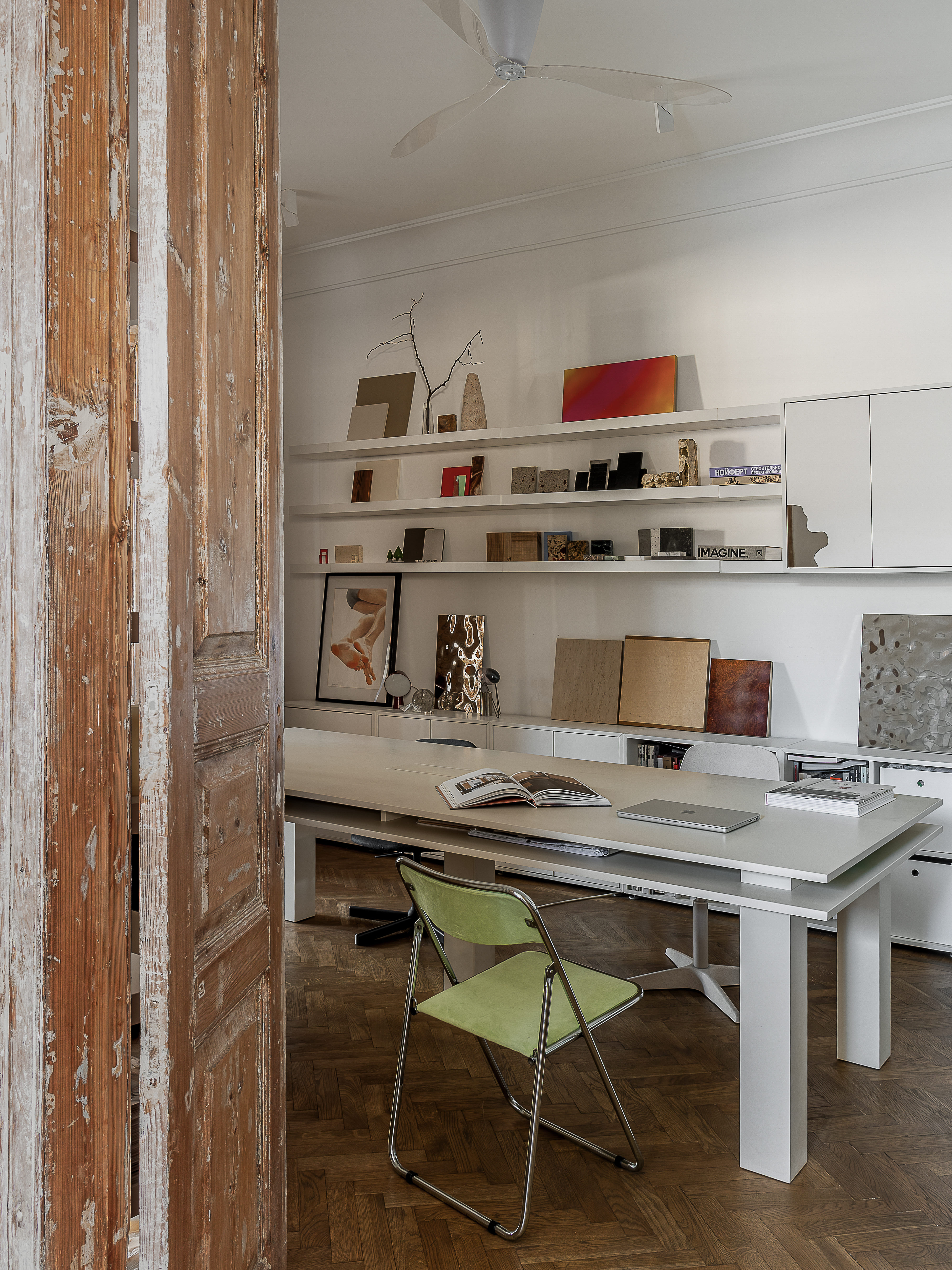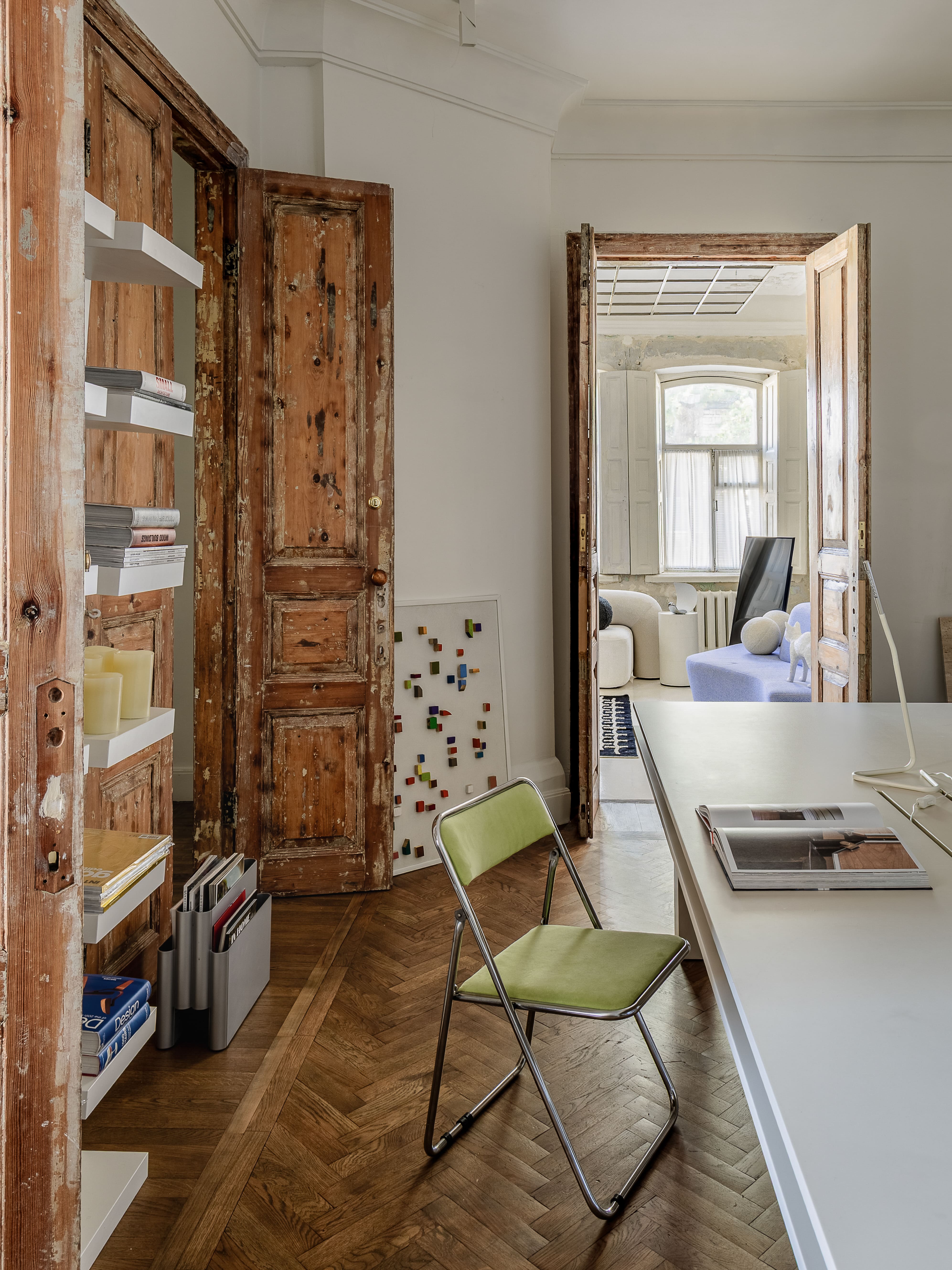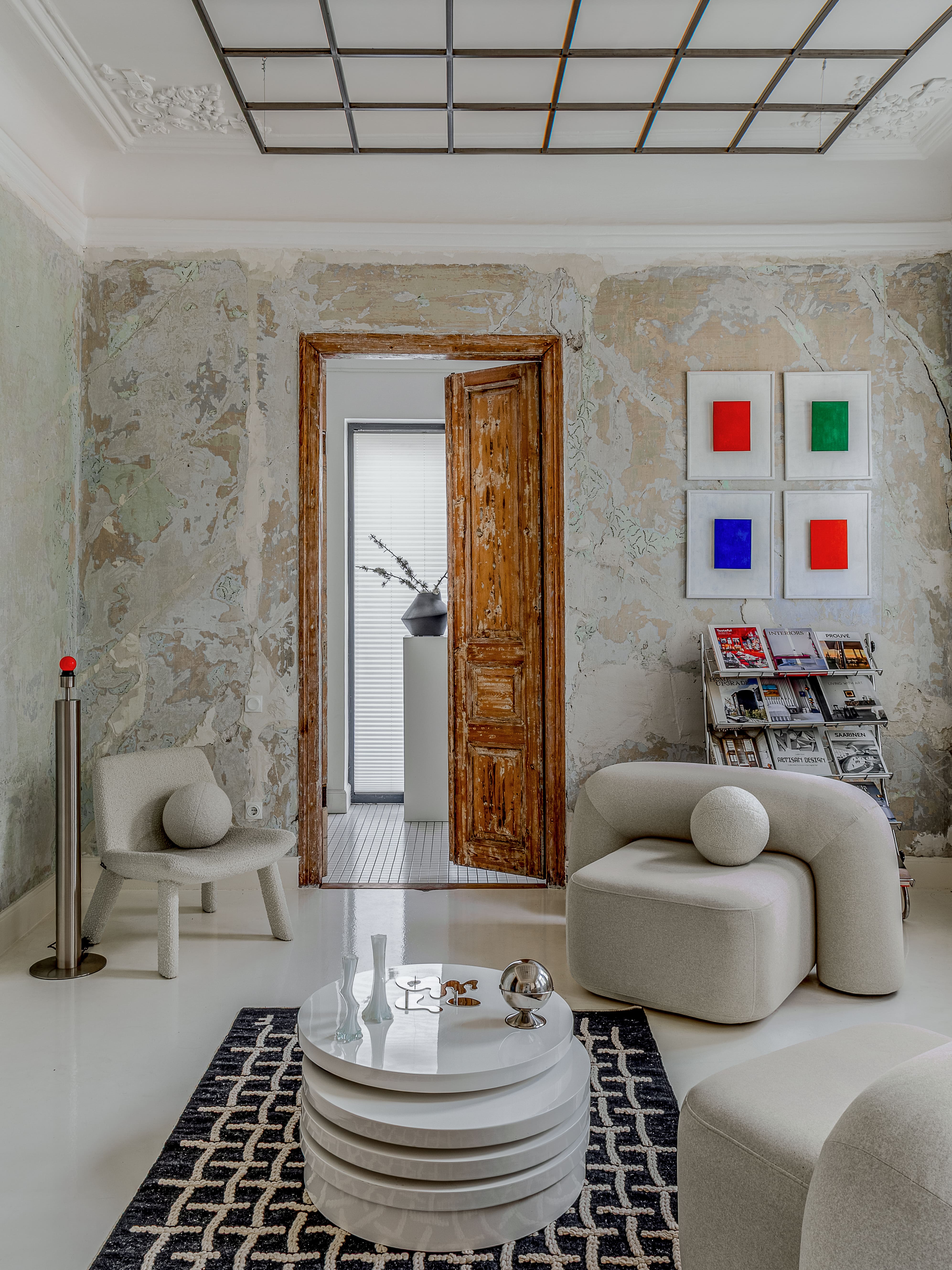 Интерьер создан без проекта. «Это было и легко, и сложно», — говорит Владимир. «Все сложилось спонтанно, в один момент, что сделало его еще более интересным». На первом этаже краска со стен была полностью удалена, обнажив следы времени; деревянные двери, плитка и лепнина потолка сохранили исторические детали. Последнюю дополнили молдинги со смайлами и знаками валют, ставшие своеобразным амулетом: в этом помещении команда обычно встречает клиентов.