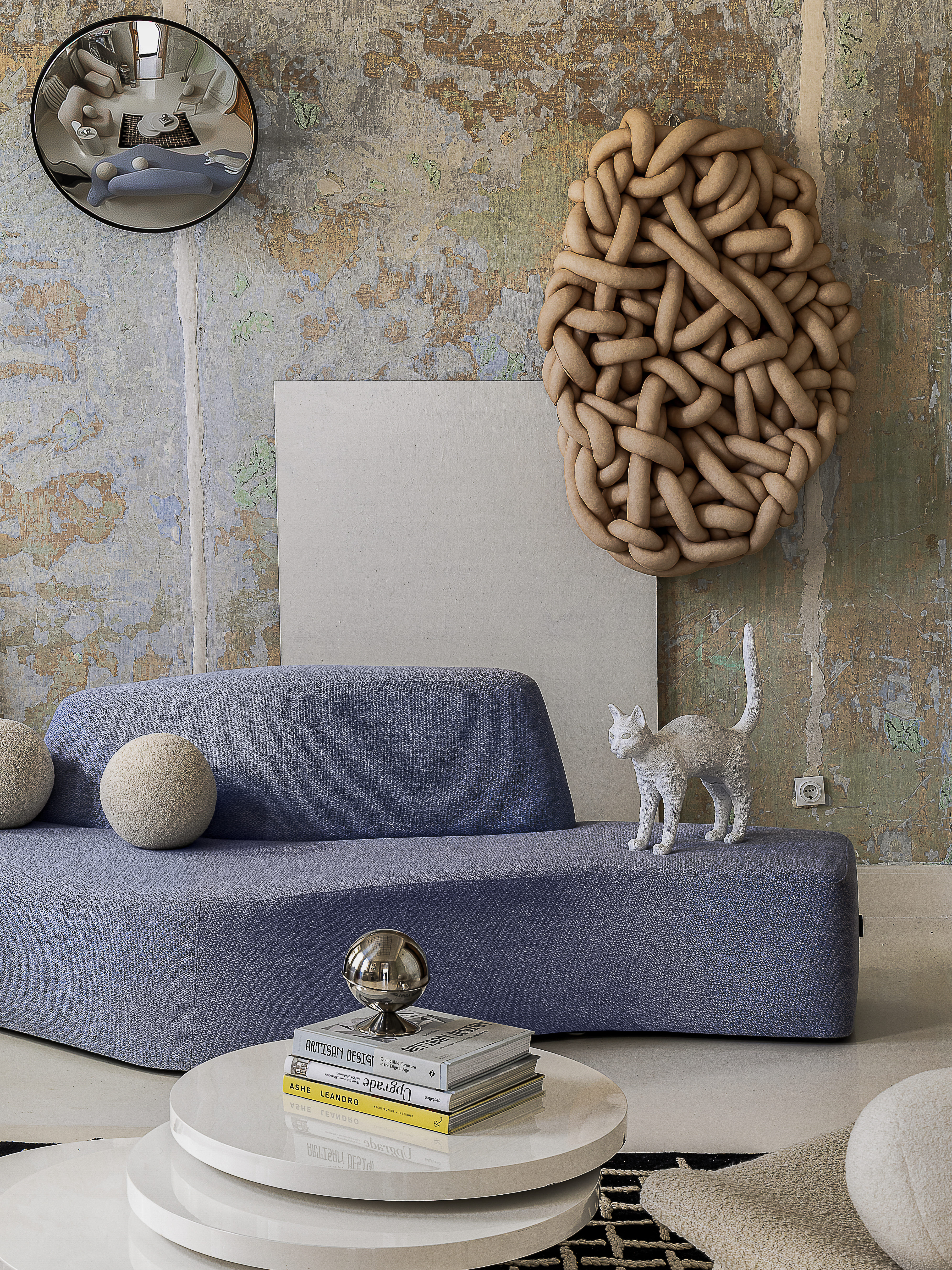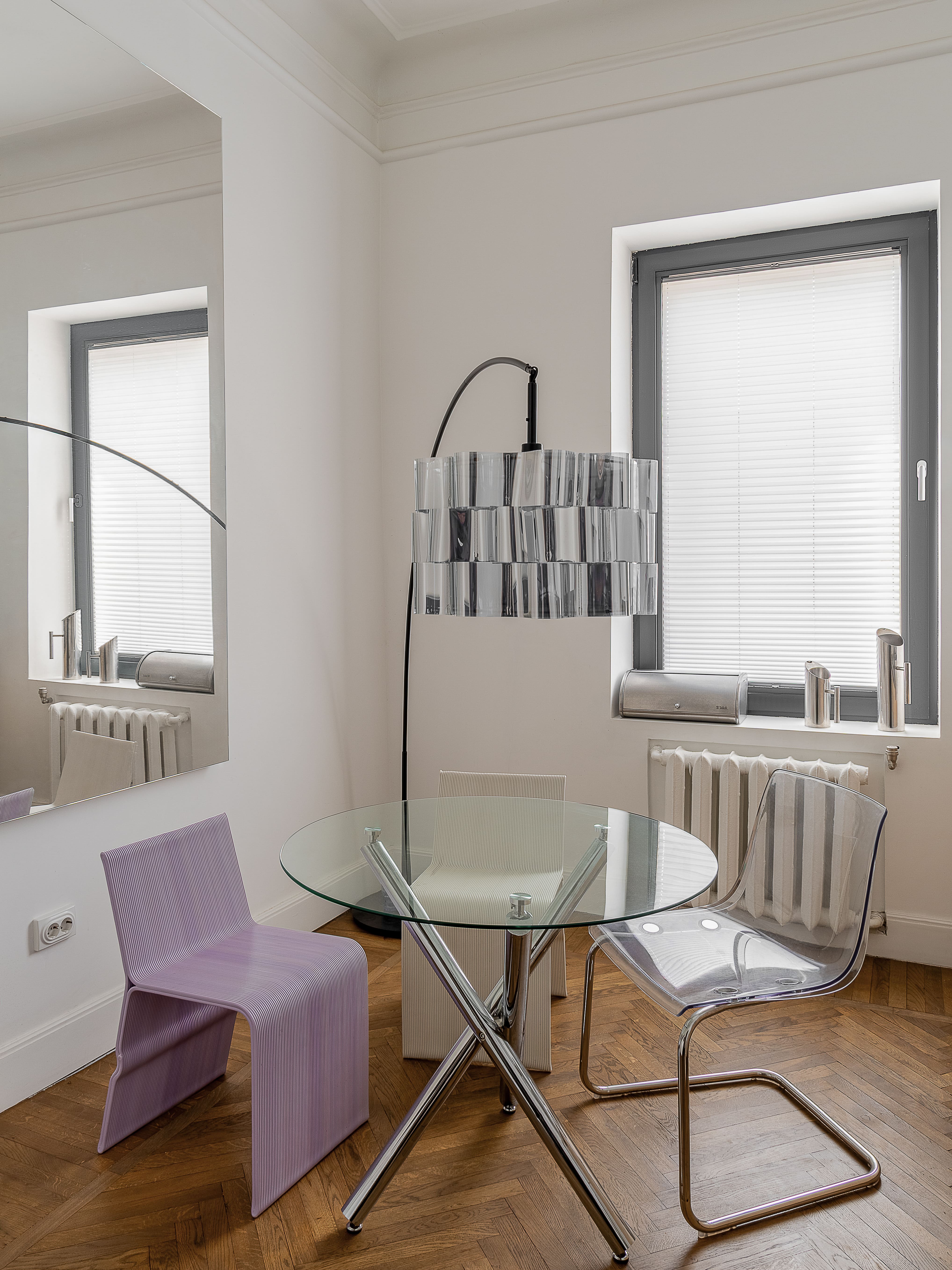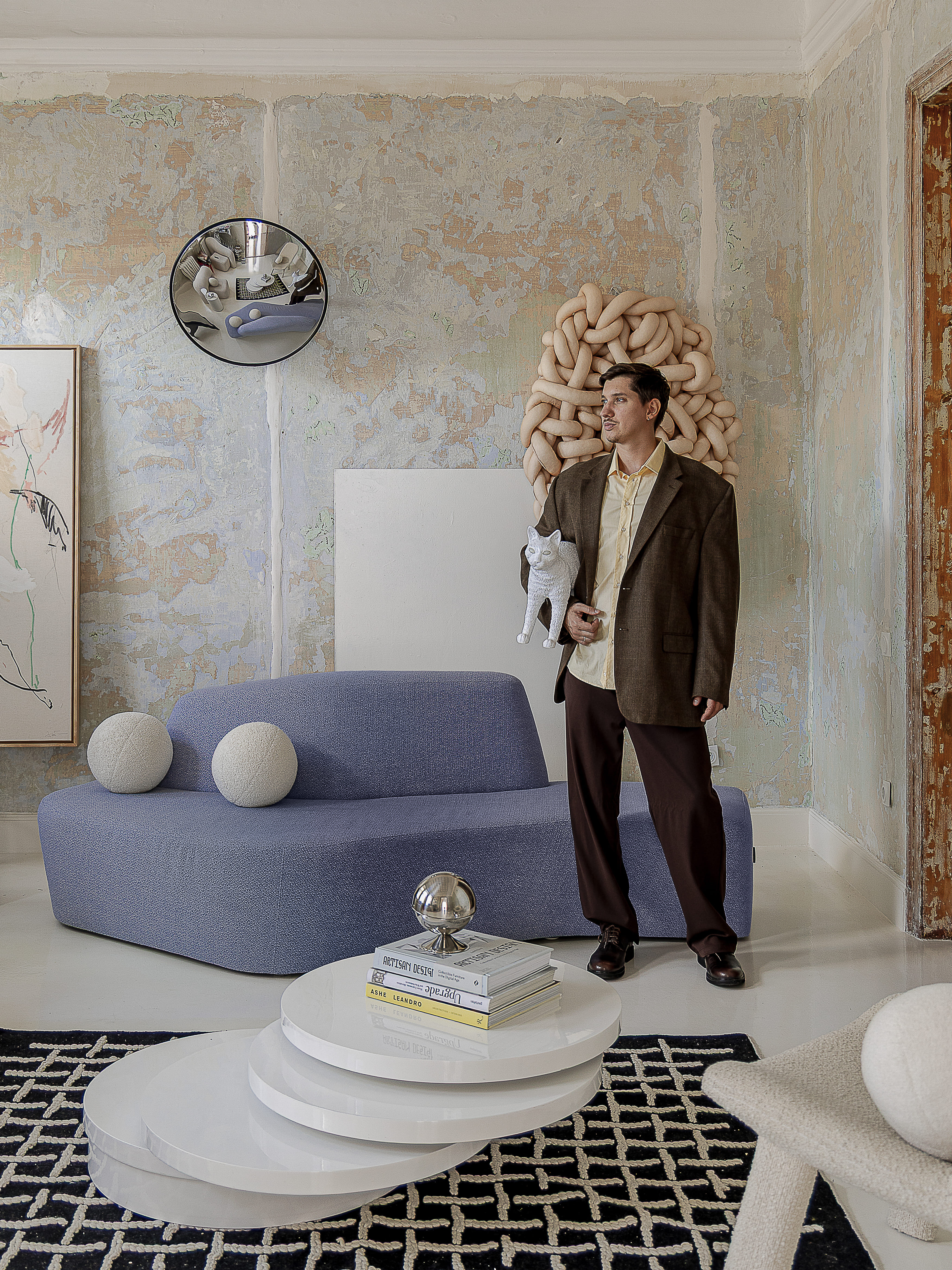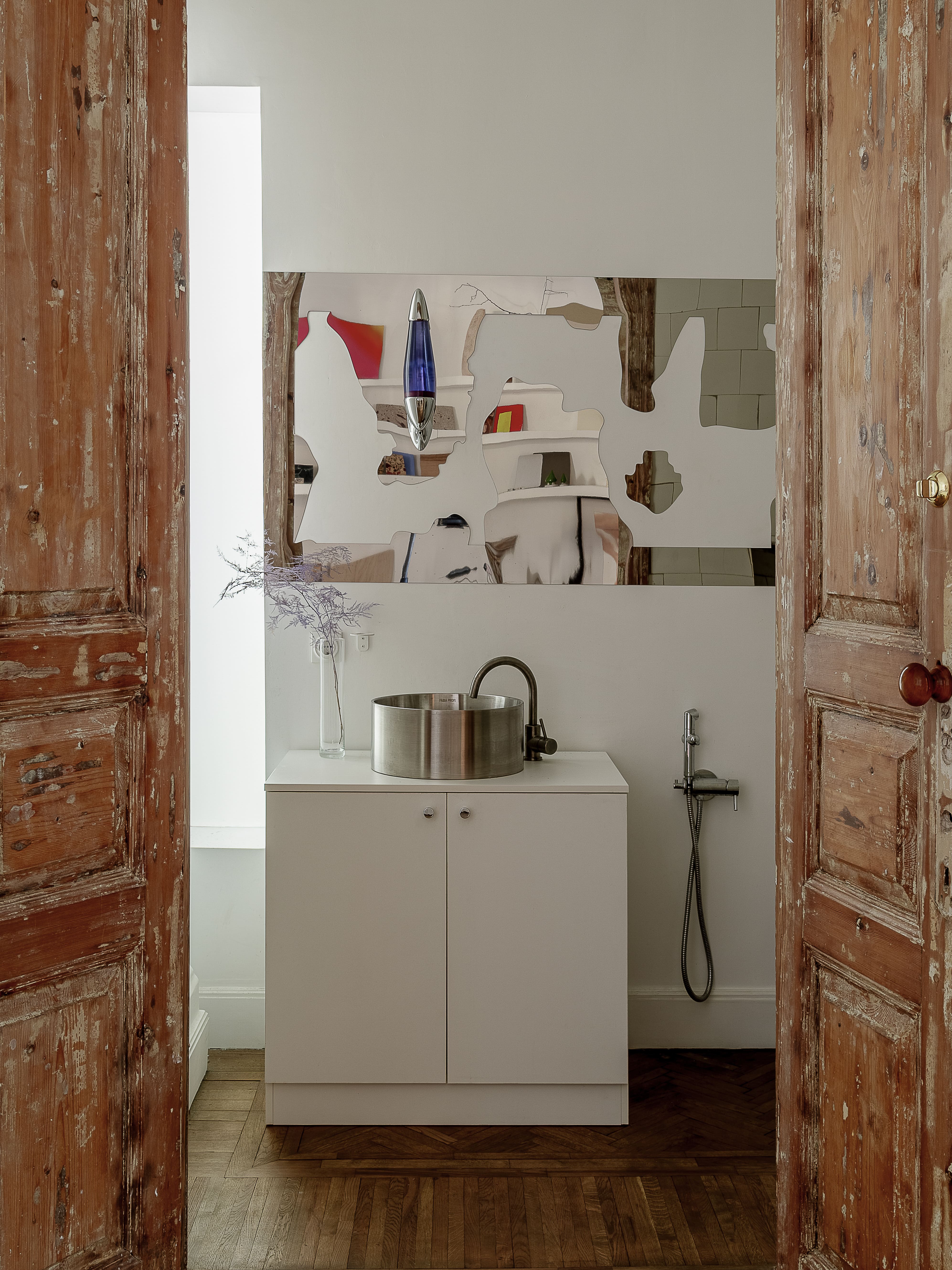 Интерьер создан без проекта. «Это было и легко, и сложно», — говорит Владимир. «Все сложилось спонтанно, в один момент, что сделало его еще более интересным». На первом этаже краска со стен была полностью удалена, обнажив следы времени; деревянные двери, плитка и лепнина потолка сохранили исторические детали. Последнюю дополнили молдинги со смайлами и знаками валют, ставшие своеобразным амулетом: в этом помещении команда обычно встречает клиентов.