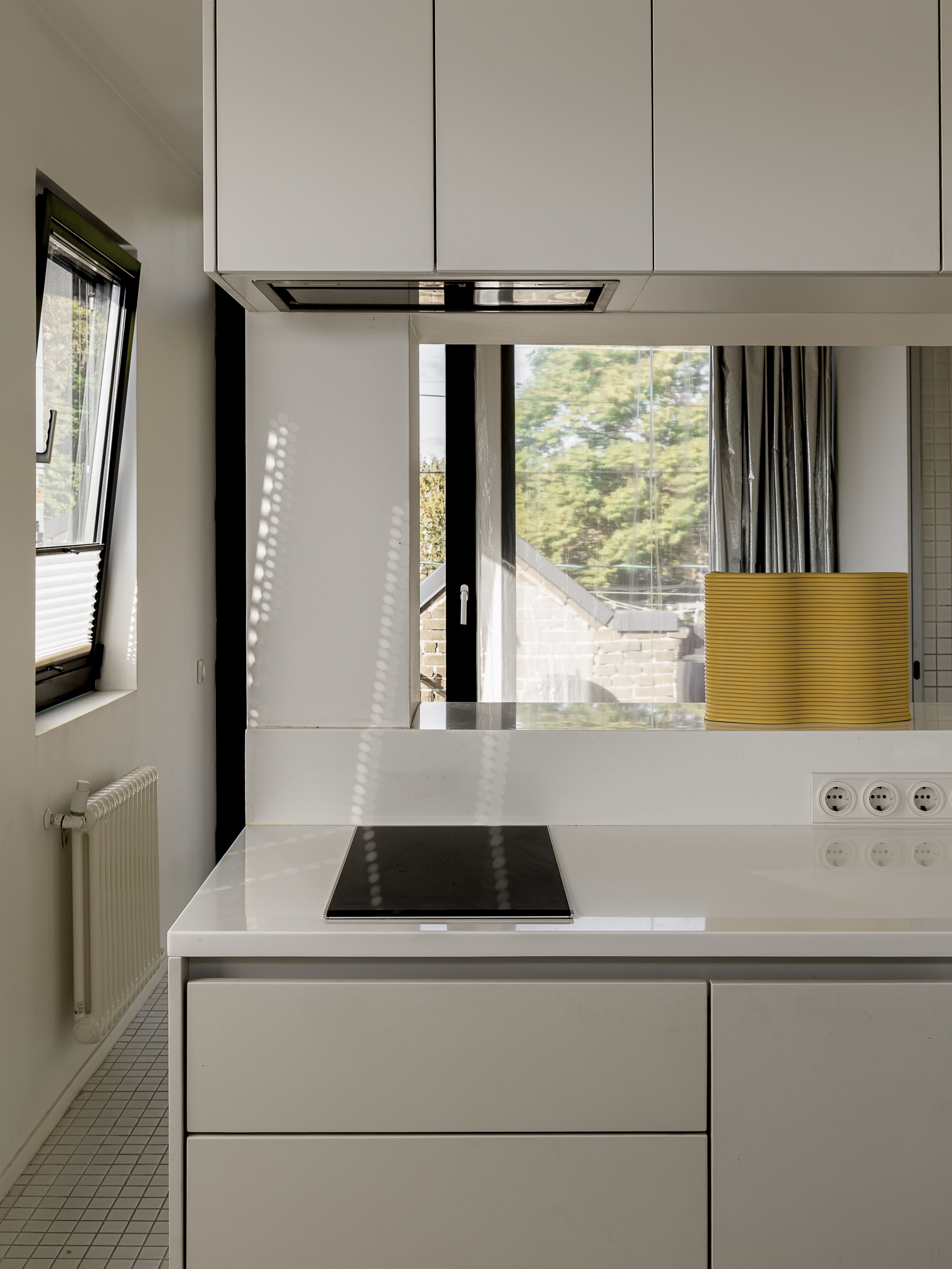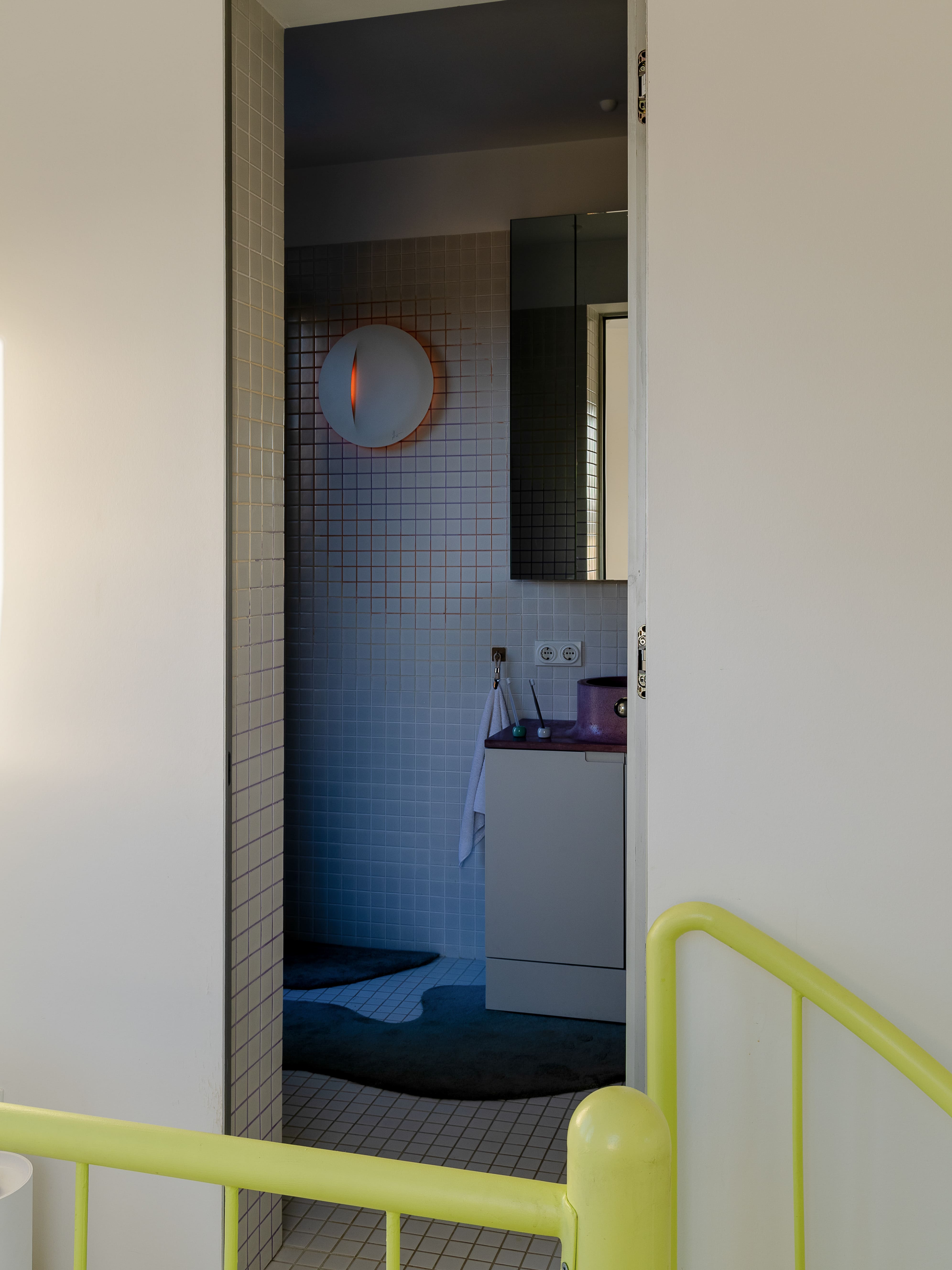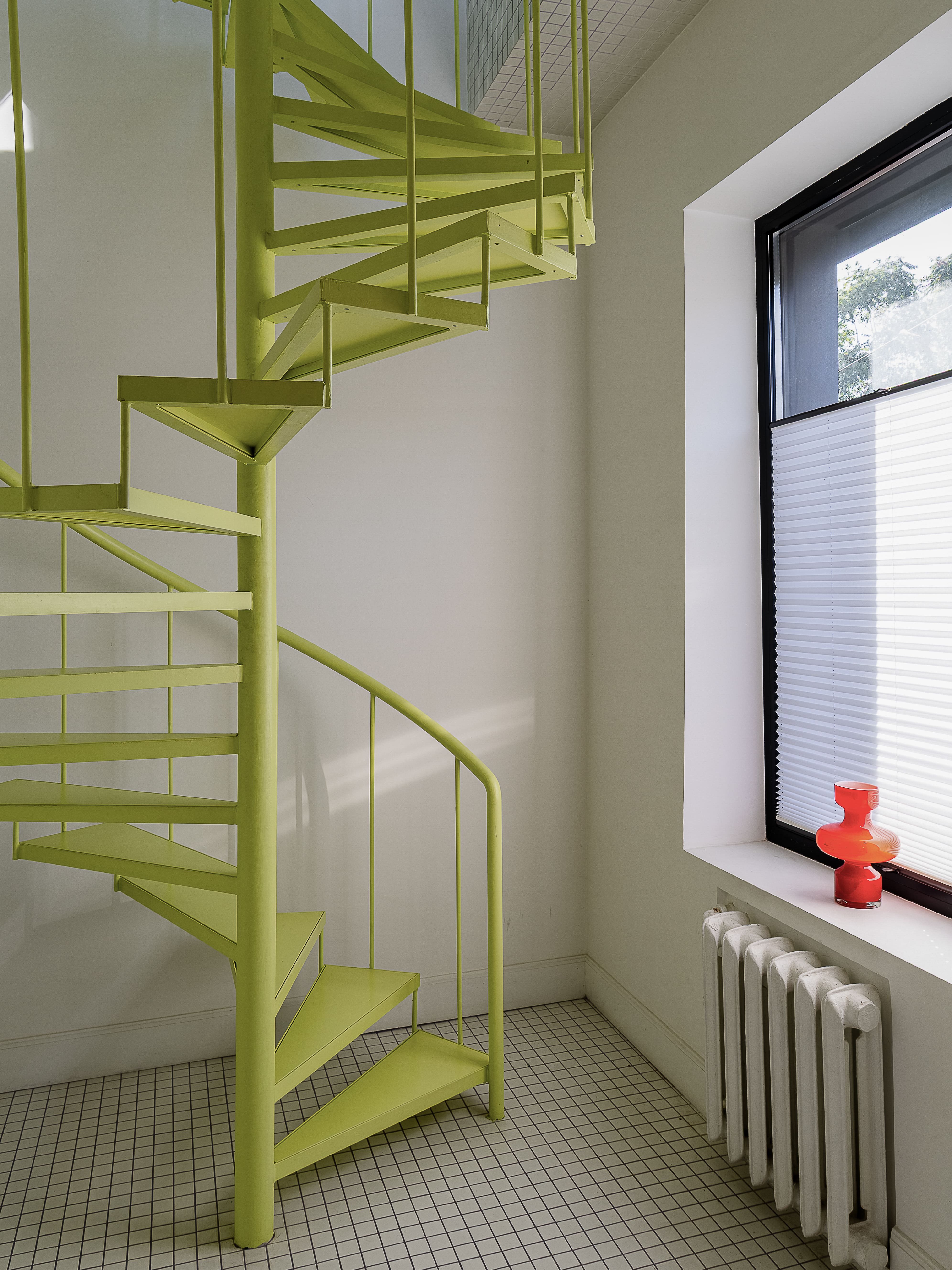 Дизайнер решил сделать второй этаж монохромным, чтобы можно было легко менять настроение пространства с помощью деталей. На фоне белых стен и плитки выделяется винтовая лестница в тени теннисного мяча, которая не только соединяет этажи, но и служит связующим звеном между памятью о прошлом и настоящем.
