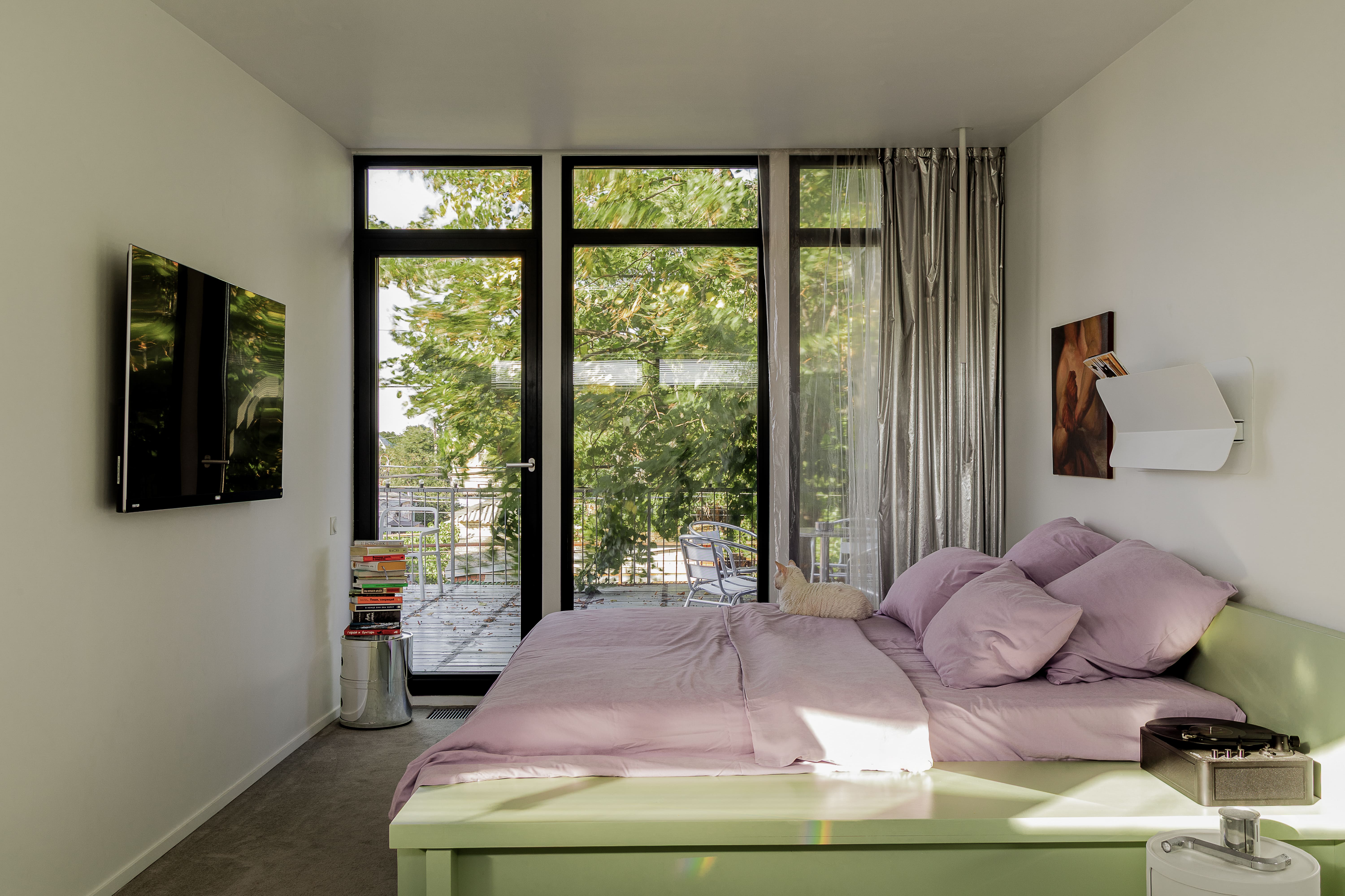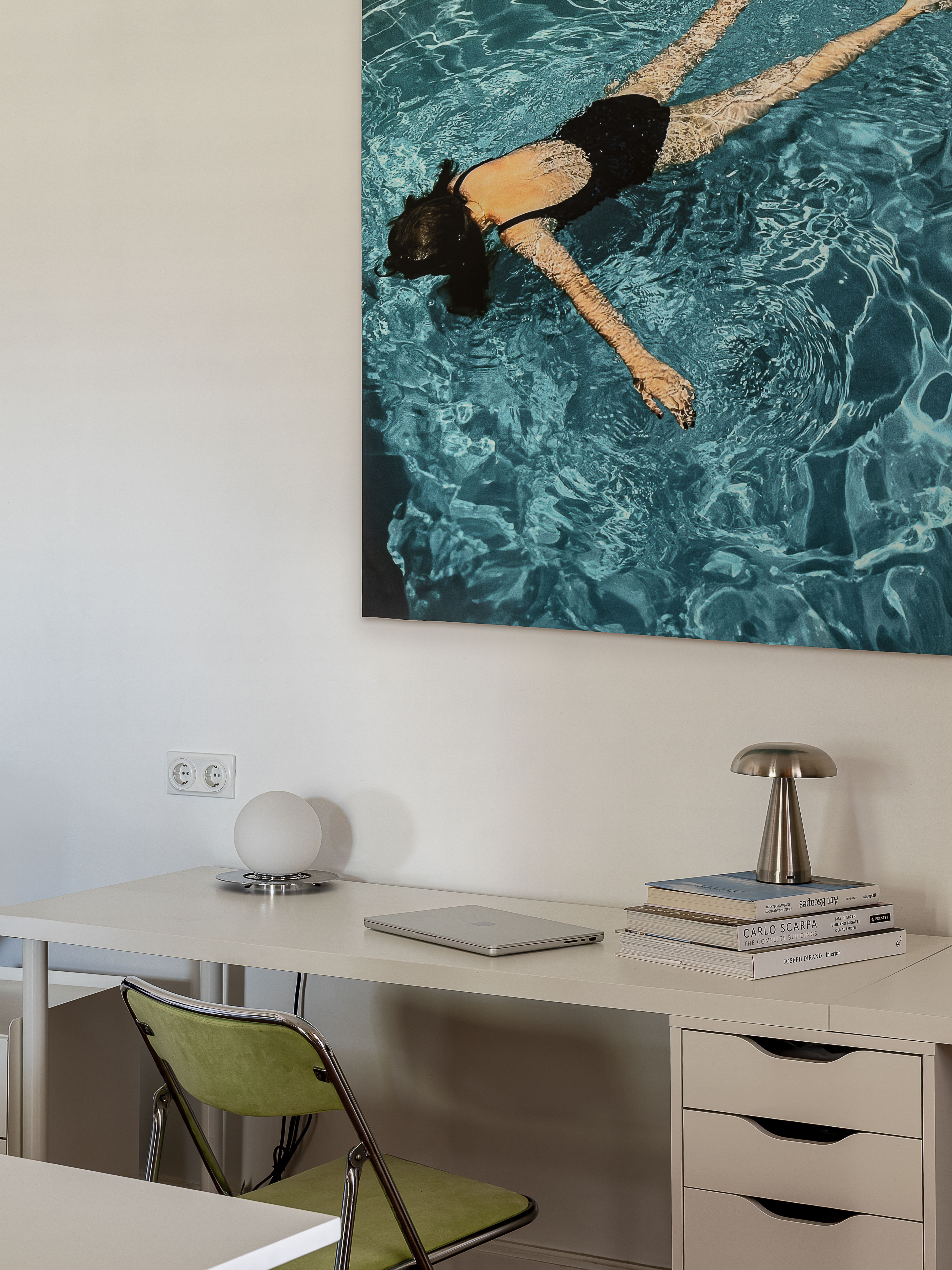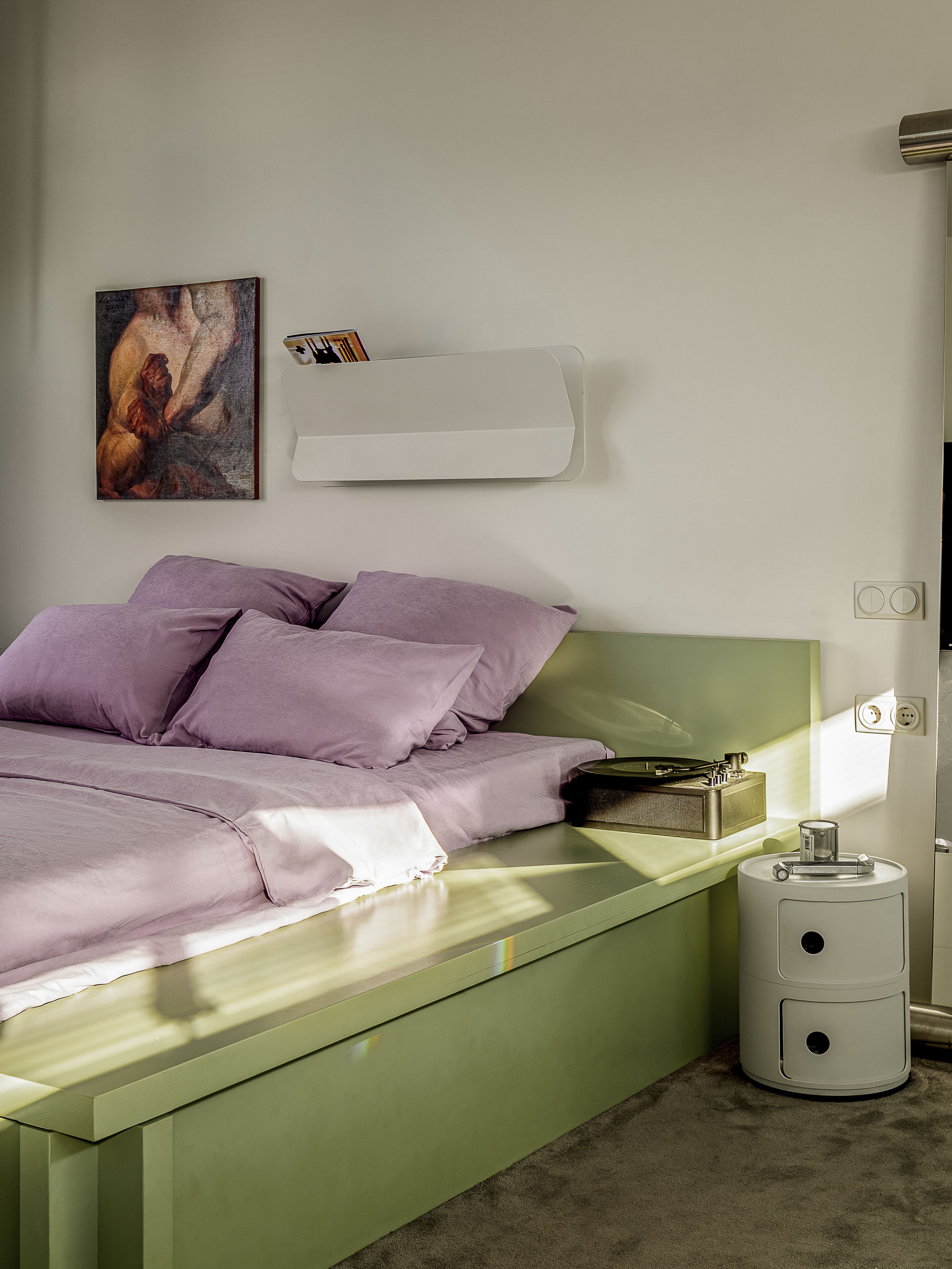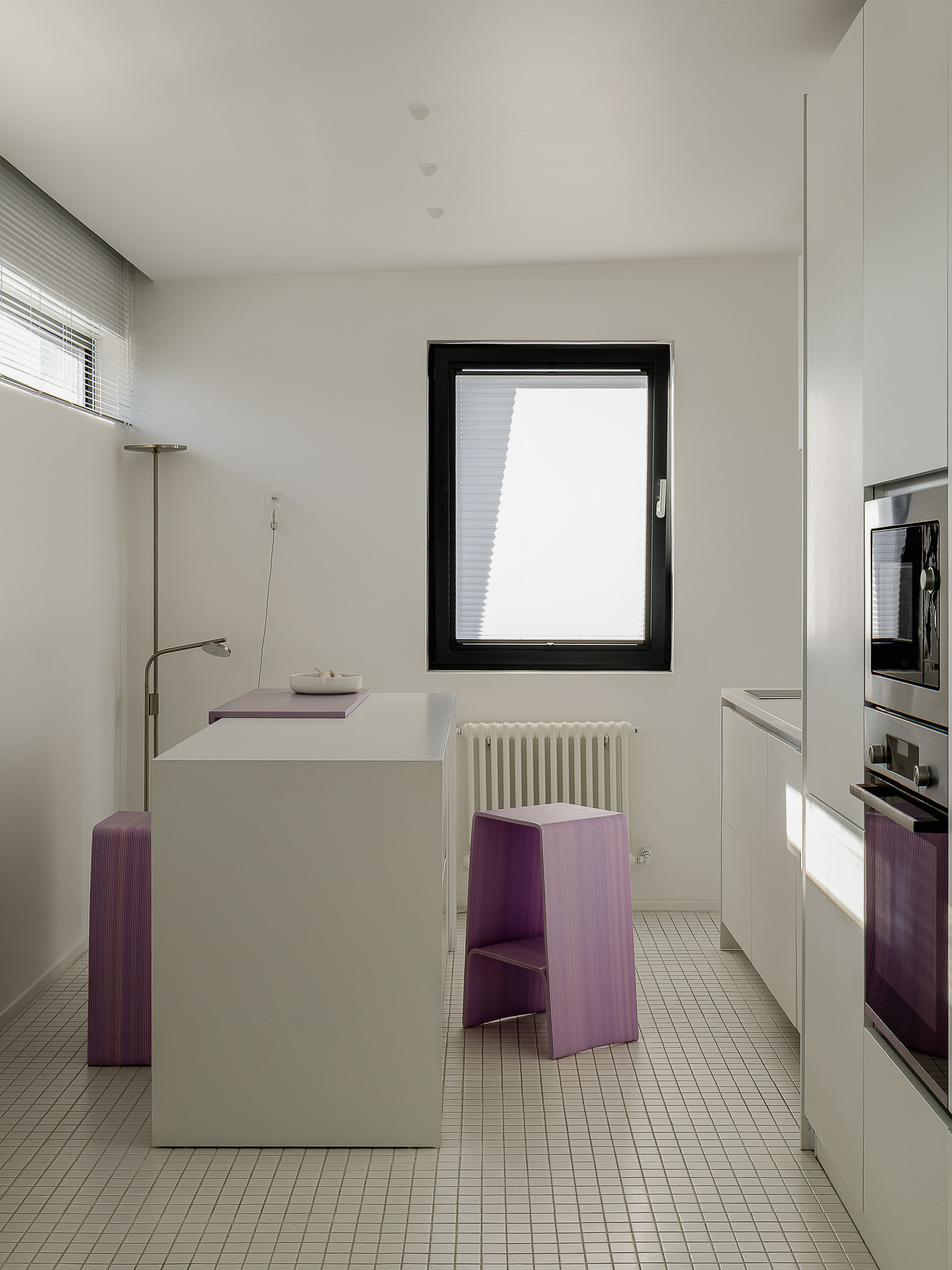 Дизайнер решил сделать второй этаж монохромным, чтобы можно было легко менять настроение пространства с помощью деталей. На фоне белых стен и плитки выделяется винтовая лестница в тени теннисного мяча, которая не только соединяет этажи, но и служит связующим звеном между памятью о прошлом и настоящем.