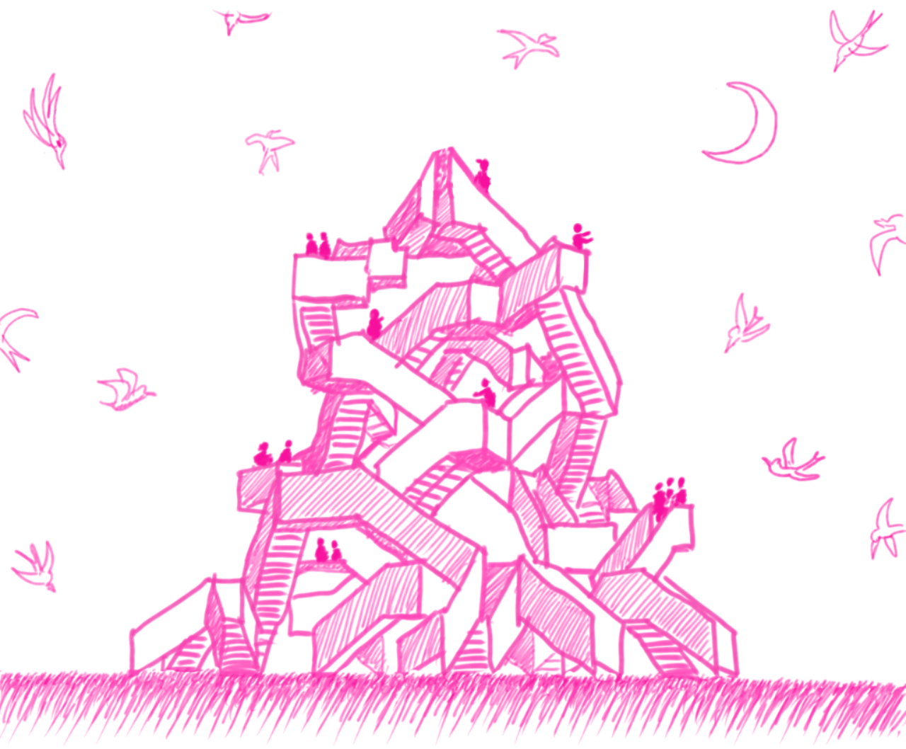 Также этим летом арт-парк представит «Розовую мечту» — лабиринт лестниц высотой 15 метров, на вершину которого ведут только два входа из 12. Объект Антона Кочуркина, куратора «Архстояния» и основателя офиса «8 линий», полон парадоксов: на первый взгляд он кажется простым, но в его основе лежит ломаная форма, похожая на структуру химических соединений. Противоречия подчеркнуты розовым цветом, цветом радостной наивности и детской открытости миру, с которым автор призывает нас приблизиться к сложной и непонятной среде.