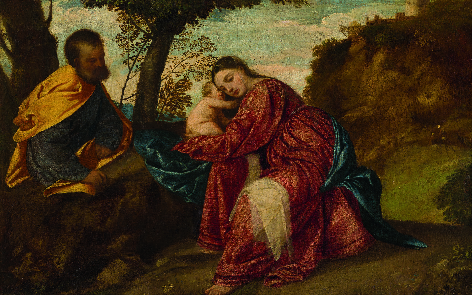 Картина размером 46,35 на 62,86 см — одно из последних религиозных произведений Тициана, сохранившихся в частной собственности. На нем изображены Мария, Иосиф и Иисус, отдыхающие во время пути в Египет в поисках убежища.
