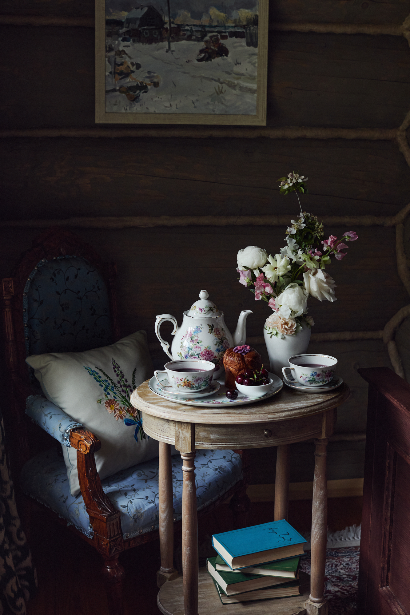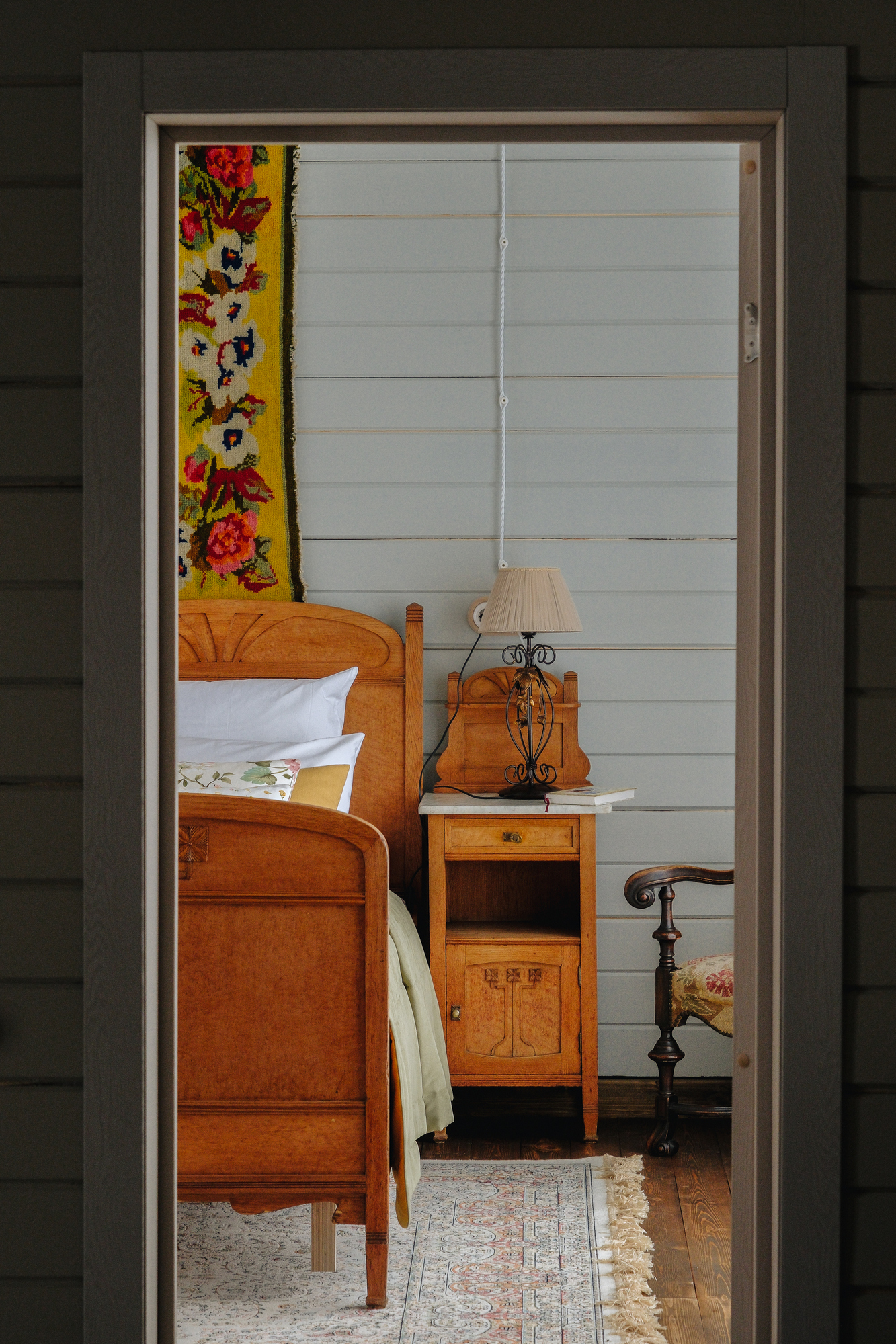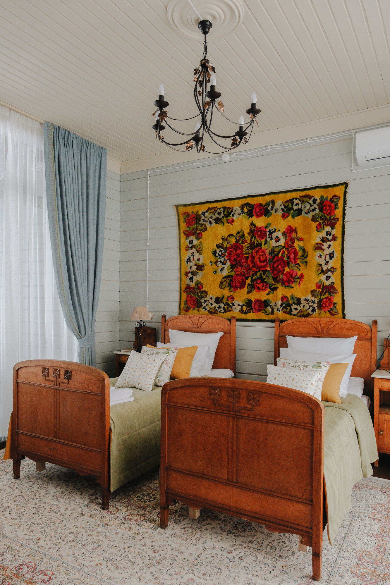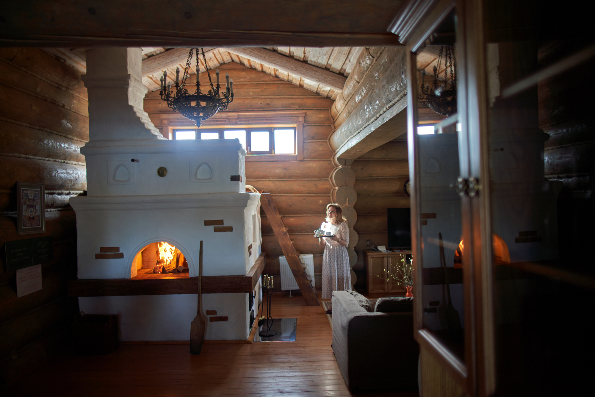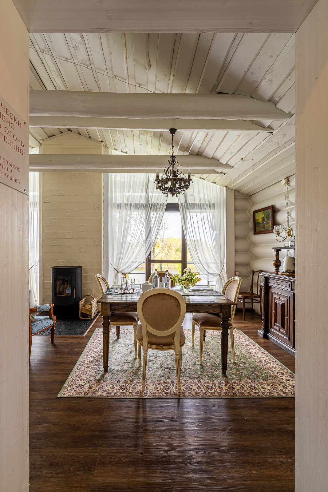 В отеле аутентичные предметы дореволюционной эпохи соседствуют с современными предметами, создавая гармоничный микс. Например, иллюстрации художника Ивана Билибина, ставшие одним из источников вдохновения во время работы над проектом, помогают отразить в интерьере русский визуальный код. «Мы позиционируем наш отель как «обитаемый музей», поэтому наиболее ценными предметами являются предметы антиквариата конца 19 — начала 20 веков, которые интегрированы в повседневную жизнь», — говорит Дарья. — Например, в каждом доме в столовой стоят серванты конца XIX века — это, можно сказать, коллекция. Есть у нас и предметы крестьянского быта, большая коллекция дореволюционных фотографий из Горской городской мастерской Торопца, будуарные кресла, гобелены – все это интегрировано в интерьеры. Небольшая коллекция, которую мы выставляем в витринах, состоит из личных вещей, принадлежавших Алексею Николаевичу Куропаткину. В будущем, когда имение генерала будет восстановлено, они переедут в свой дом.