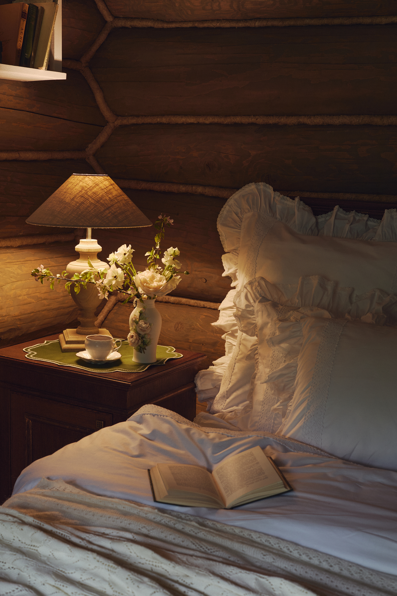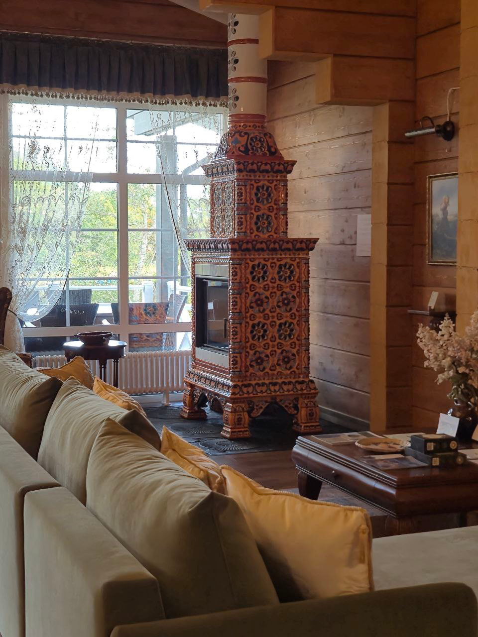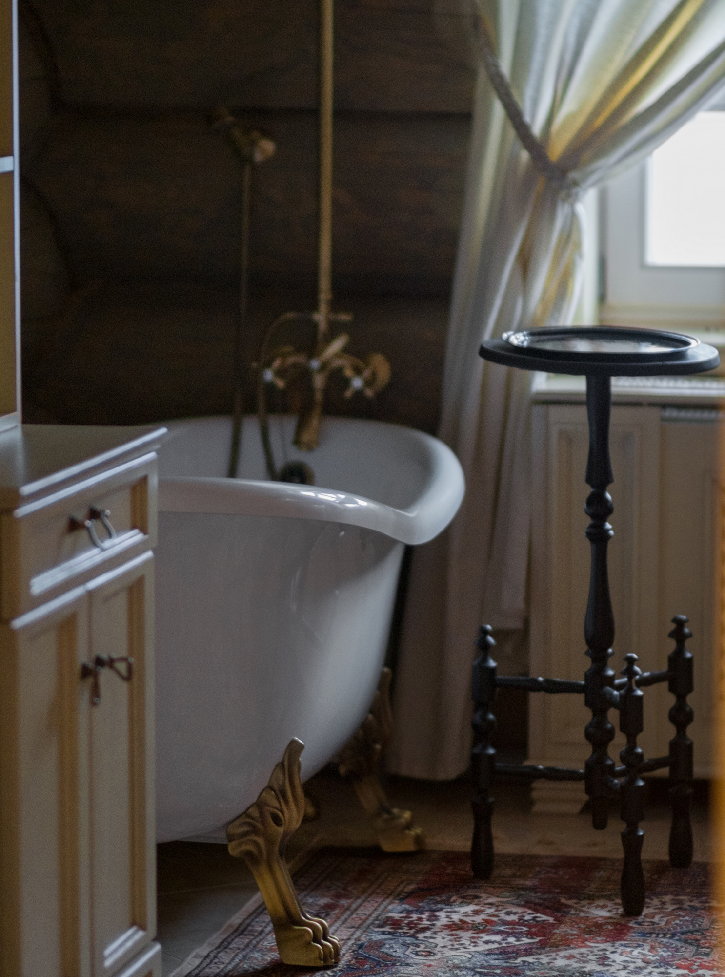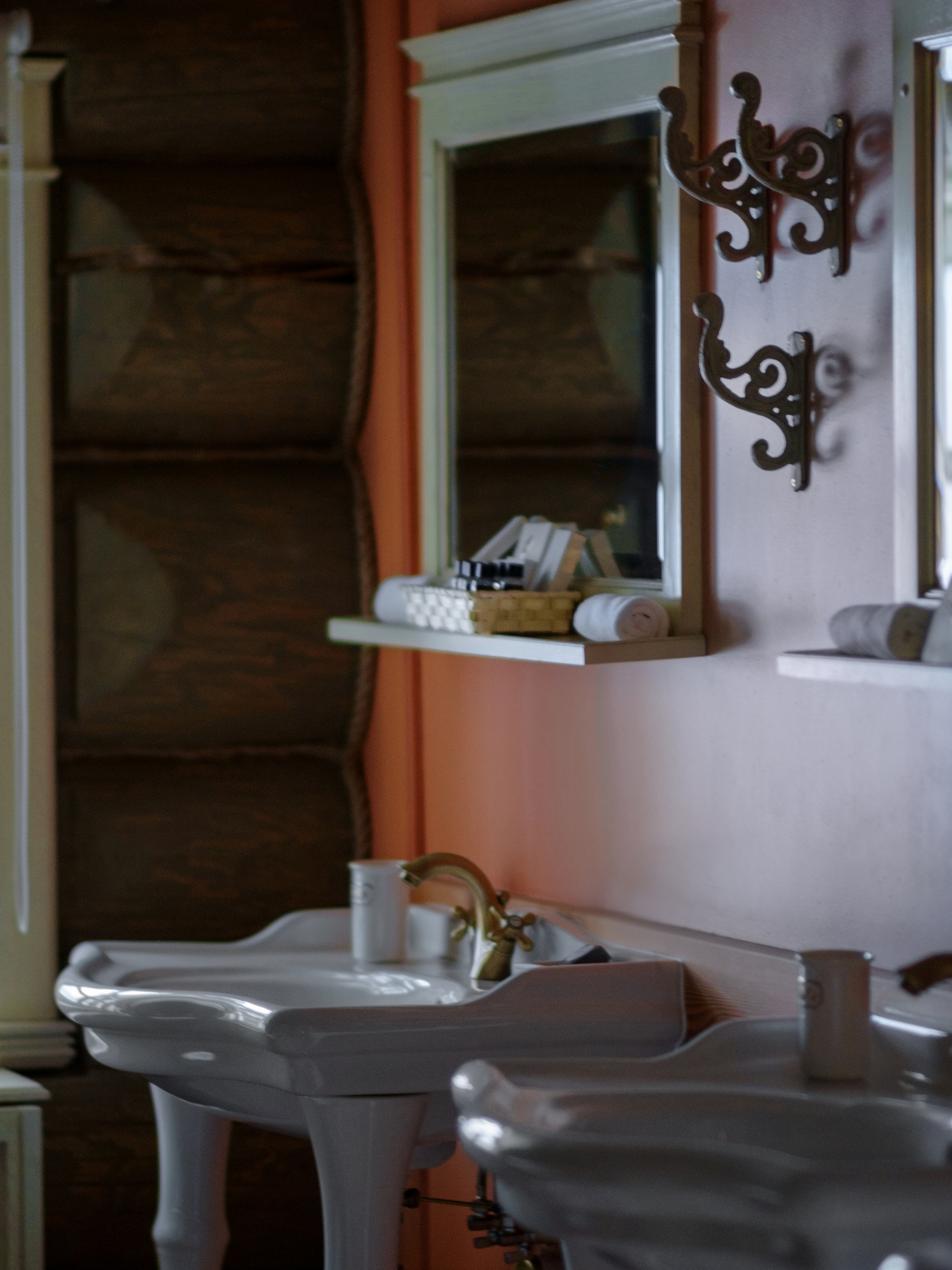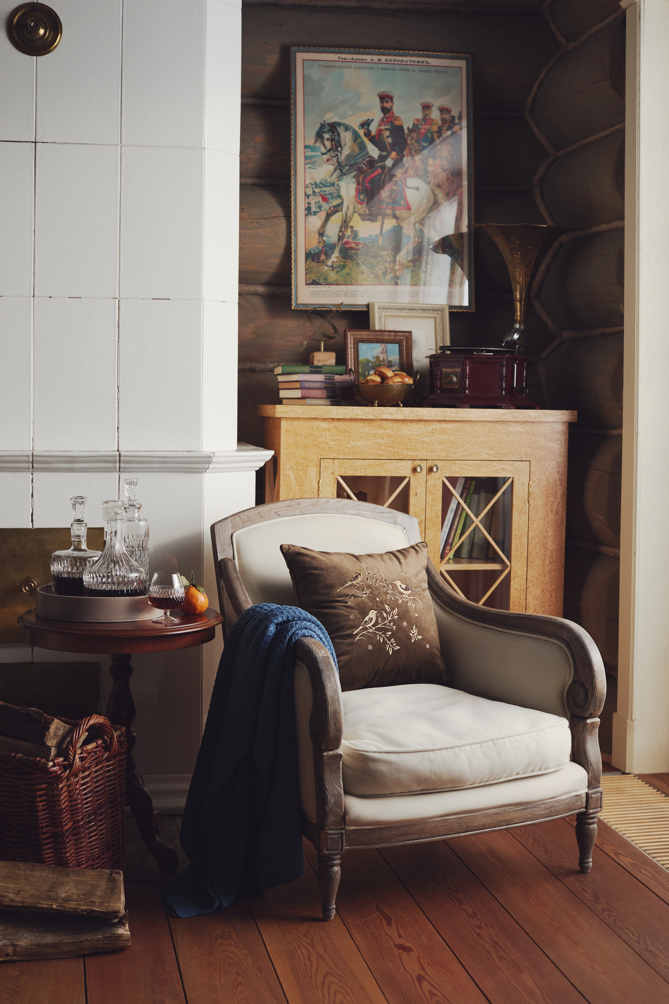 Убранство отеля – это больше, чем просто русская стилизация. Изучая архивы и дневники генерала Куропаткина, Дарья поняла, что через интерьеры необходимо рассказать о жизни провинциального дворянина. И эта проблема решается сразу на нескольких уровнях, включая выбор материалов, работу по освещению и взвешенный подход к наполнению. «Это обязательно теплые оттенки, мягкие контуры, участки, где свет подчеркивает текстуру дерева, текстиля и изделий ручной работы», — отмечает Дарья. «Декоративные предметы — это не украшения для удовольствия от украшения, а смысловые акценты: предметы, которые рассказывают часть истории пространства, но никоим образом не перегружают его».