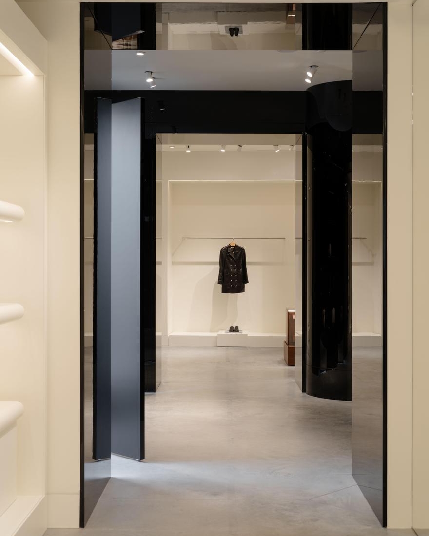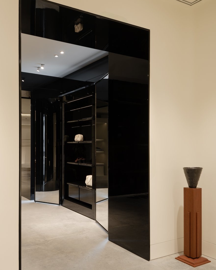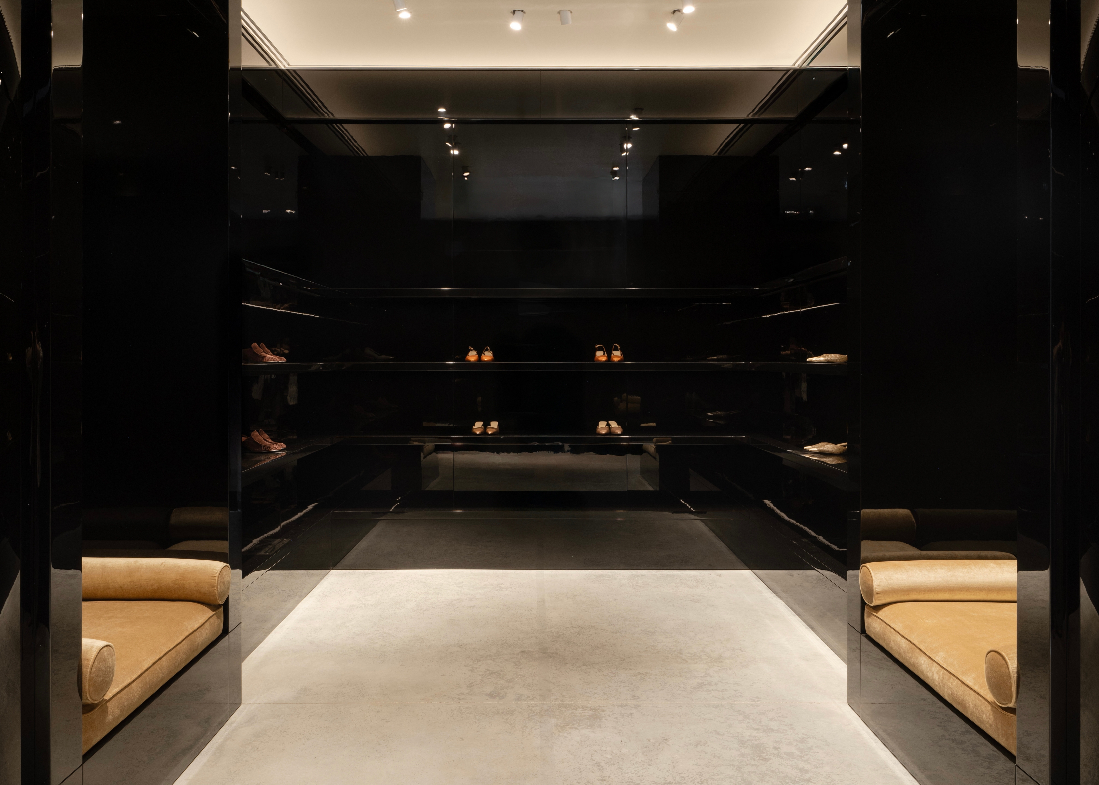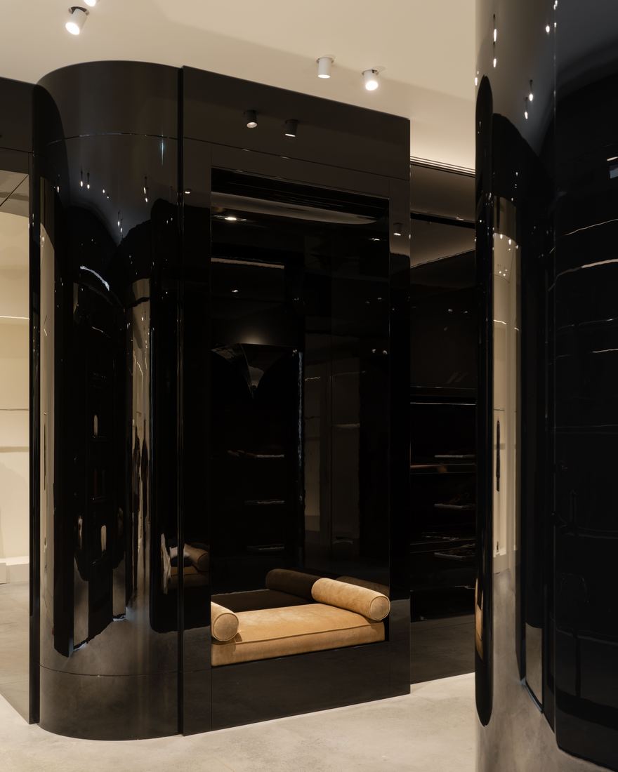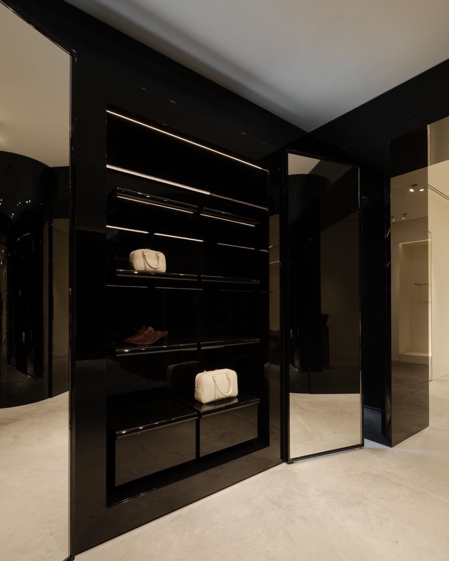 «В основу палитры легло сочетание благородных и натуральных оттенков: глянцевого черного, молочного и каменного тонов, теплых древесных оттенков, прозрачных и полупрозрачных материалов», — поясняет дизайнер. «Цвет действует не как украшение, а как архитектурный инструмент». Материалы выбраны соответствующие: преимущественно натуральные, с тактильной фактурой и благородным дизайном. В интерьере сочетаются мрамор, дерево, зеркальные поверхности, глянцевый лак и полированный металл. Полина особенно отмечает кассовый стол и витрины из оникса: «Его глубина и прозрачность создают романтический акцент и подчеркивают высокое качество бренда. » Наряду с глянцевой черной обувной комнатой это техническое решение, добавляющее драматизма пространству.