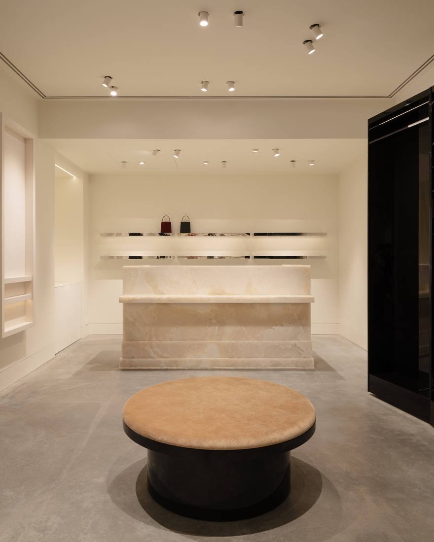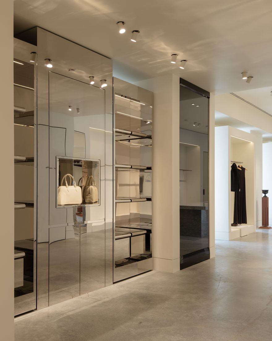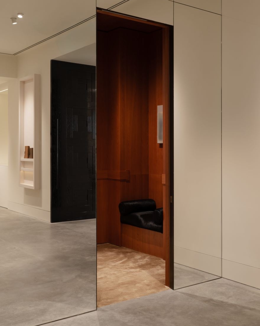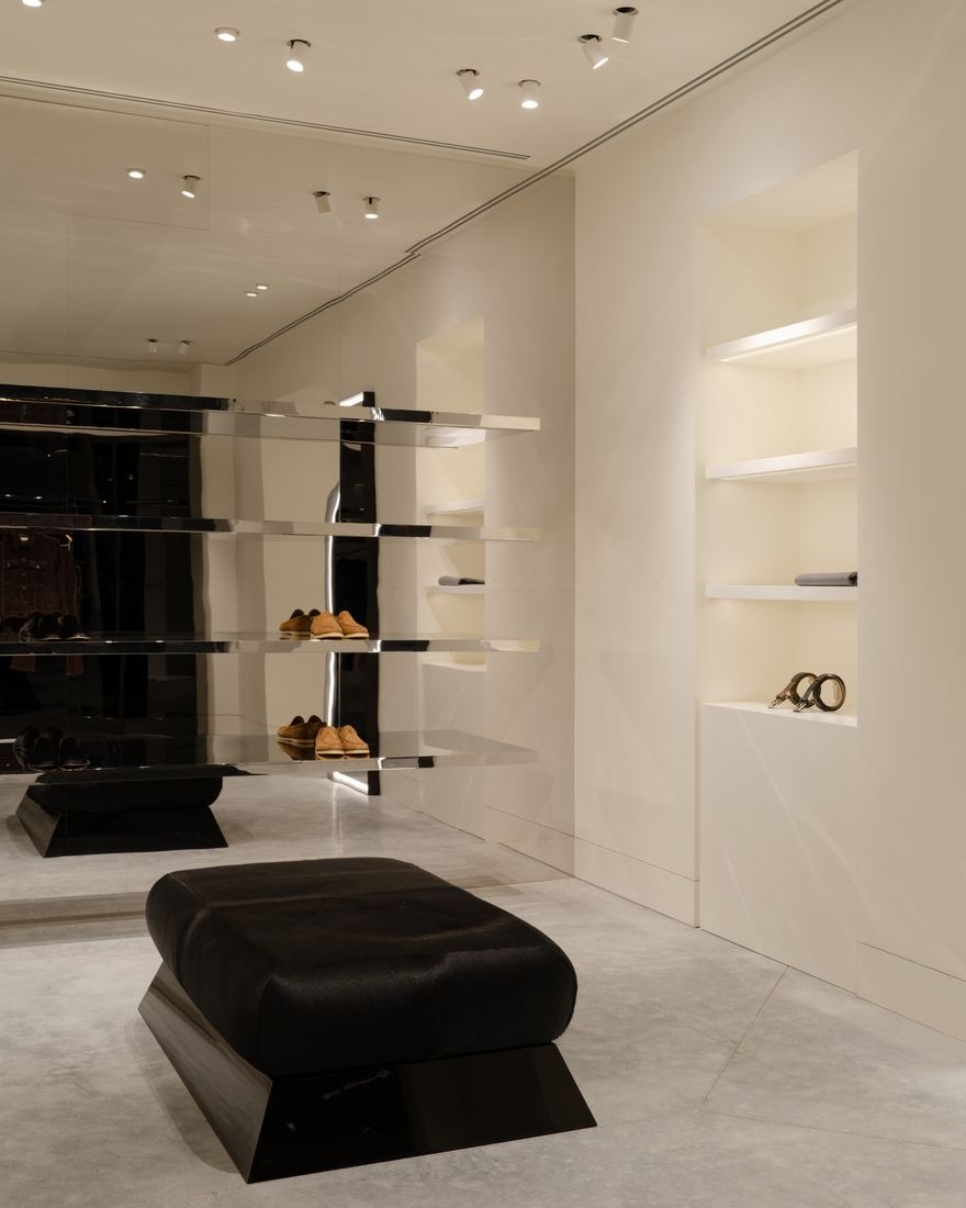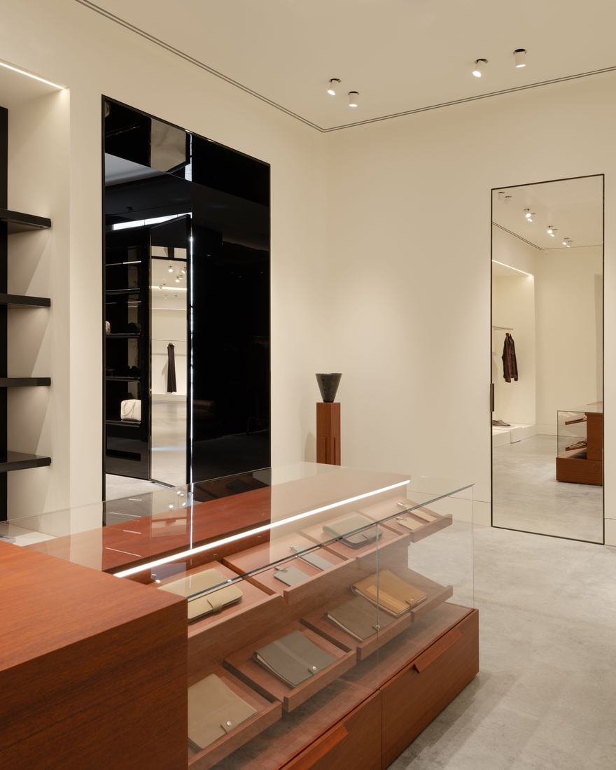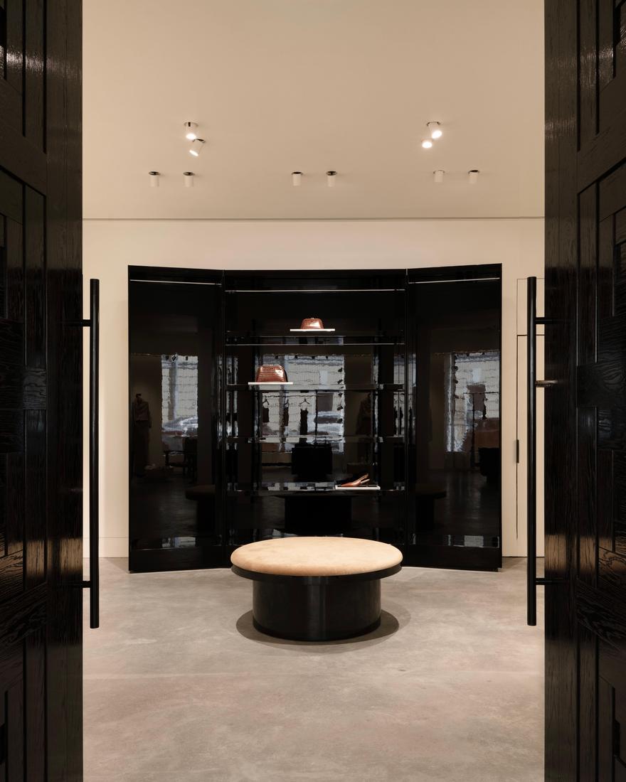 «В основу палитры легло сочетание благородных и натуральных оттенков: глянцевого черного, молочного и каменного тонов, теплых древесных оттенков, прозрачных и полупрозрачных материалов», — поясняет дизайнер. «Цвет действует не как украшение, а как архитектурный инструмент». Материалы выбраны соответствующие: преимущественно натуральные, с тактильной фактурой и благородным дизайном. В интерьере сочетаются мрамор, дерево, зеркальные поверхности, глянцевый лак и полированный металл. Полина особенно отмечает кассовый стол и витрины из оникса: «Его глубина и прозрачность создают романтический акцент и подчеркивают высокое качество бренда. » Наряду с глянцевой черной обувной комнатой это техническое решение, добавляющее драматизма пространству.