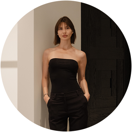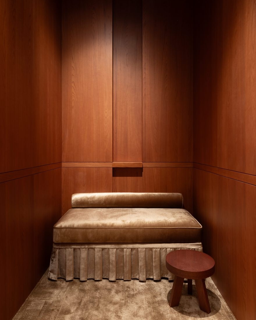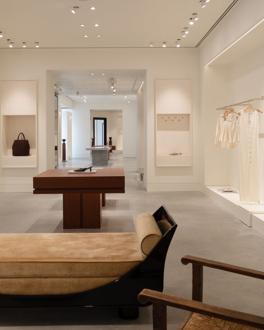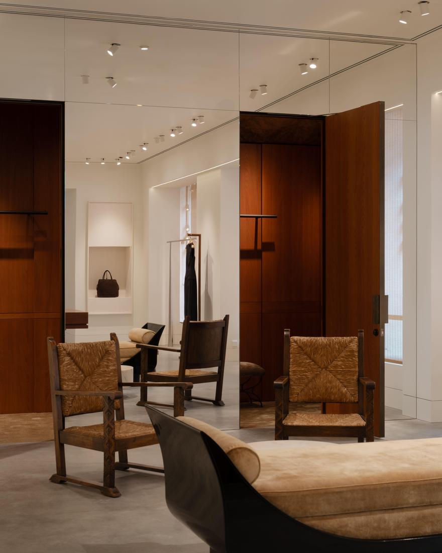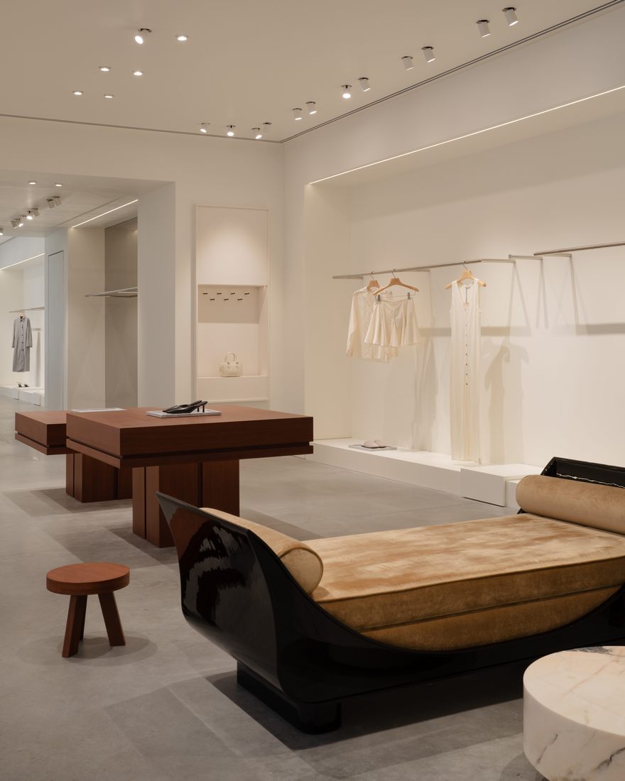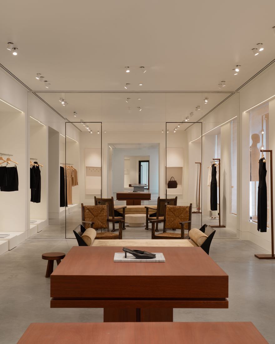 «В основу палитры легло сочетание благородных и натуральных оттенков: глянцевого черного, молочного и каменного тонов, теплых древесных оттенков, прозрачных и полупрозрачных материалов», — поясняет дизайнер. «Цвет действует не как украшение, а как архитектурный инструмент». Материалы выбраны соответствующие: преимущественно натуральные, с тактильной фактурой и благородным дизайном. В интерьере сочетаются мрамор, дерево, зеркальные поверхности, глянцевый лак и полированный металл. Полина особенно отмечает кассовый стол и витрины из оникса: «Его глубина и прозрачность создают романтический акцент и подчеркивают высокое качество бренда. » Наряду с глянцевой черной обувной комнатой это техническое решение, добавляющее драматизма пространству.