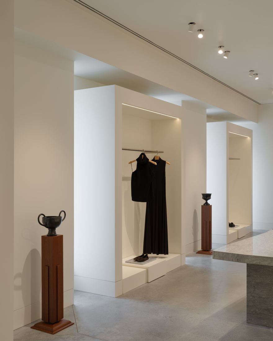 Видение Полины отражало, прежде всего, архитектурный подход к работе с пространством: все, от дверей и ниш до крупных предметов мебели, построено на осях: «Каждый элемент занимает свое место, взаимодействует с другими, что придает интерьеру ясность и гармонию». Благодаря тому, что проект был передан студии как «чистая страница» и без жестких ограничений на визуальный язык, удалось построить концепцию полностью с нуля и реализовать все задуманное. Планировка получилась максимально функциональной: сформировались женское и мужское крыло, центральная ось с кассовой зоной, отдельные холлы, примерочные, вспомогательные зоны, а также отделанная глянцевым лаком «черная обувная» как самостоятельное архитектурное пространство.