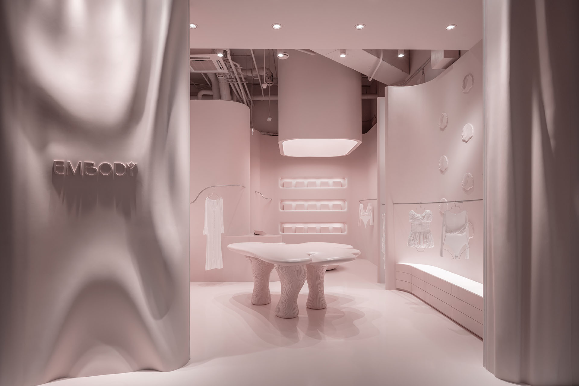 Ракушки на стенах и в отделке, символ бренда, придают помещению романтический шарм. Изогнутые направляющие из нержавеющей стали, которые проходят по всему пространству изогнутыми линиями, продолжают общую концепцию, а встроенные ниши и полки обеспечивают функциональность для демонстрации новых коллекций. Словно нарисованный искусственным интеллектом или придуманный для декораций научно-фантастического фильма, проект точно воплотил характер Embody. «Наше сотрудничество с Региной превратилось в настоящий художественный проект», — объясняет Яна. «Мы надеемся, что это продолжится!» »