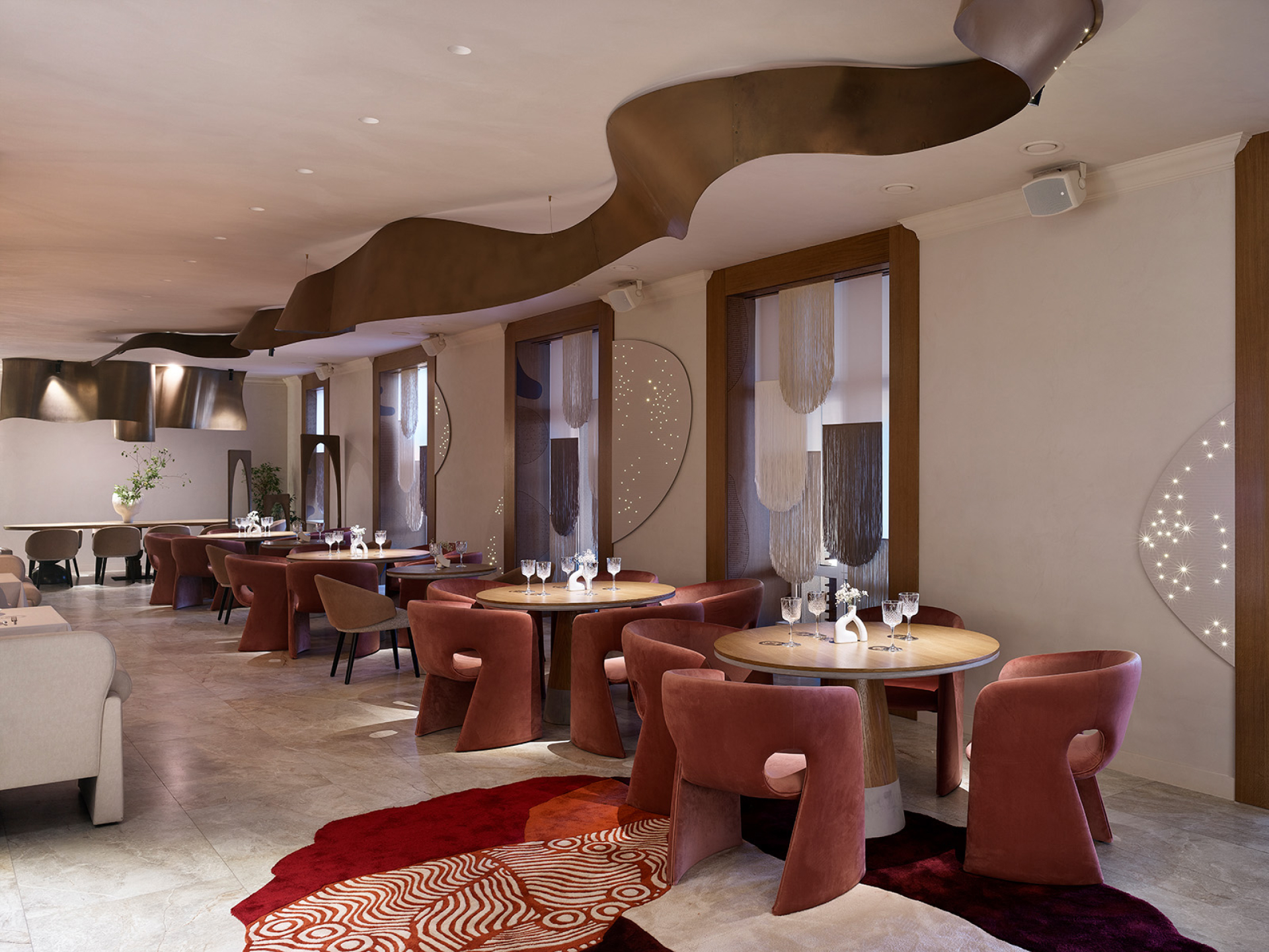 Но больше всего впечатляет дизайн над большим столом. «Свет из окна падает лучше; Вечером выгодно работает направленный свет, а лучи металлических листов и их узор завораживают. Он не кажется тяжелым даже при своих внушительных размерах: высота конструкции около полутора метров, а длина – почти три. В результате две конструкции обвивают стол и бар и напоминают воронки, возникающие на воде. На окнах добавлены панно с рельефами, которые отсылают к культурному наследию региона – языческим сказкам.