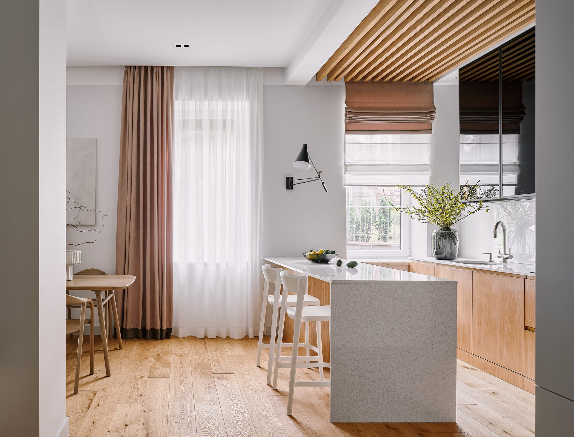 «Стены теплого светло-серого оттенка служат фоном для элементов из натурального дуба, таких как инженерные доски, кухонные тумбочки, балки и шкафы. В качестве акцентов используется декор из черного стекла, зеленый стол, пуфики и края штор. Ванная комната отделана керамогранитом, самым практичным на сегодняшний день материалом для влажных помещений.