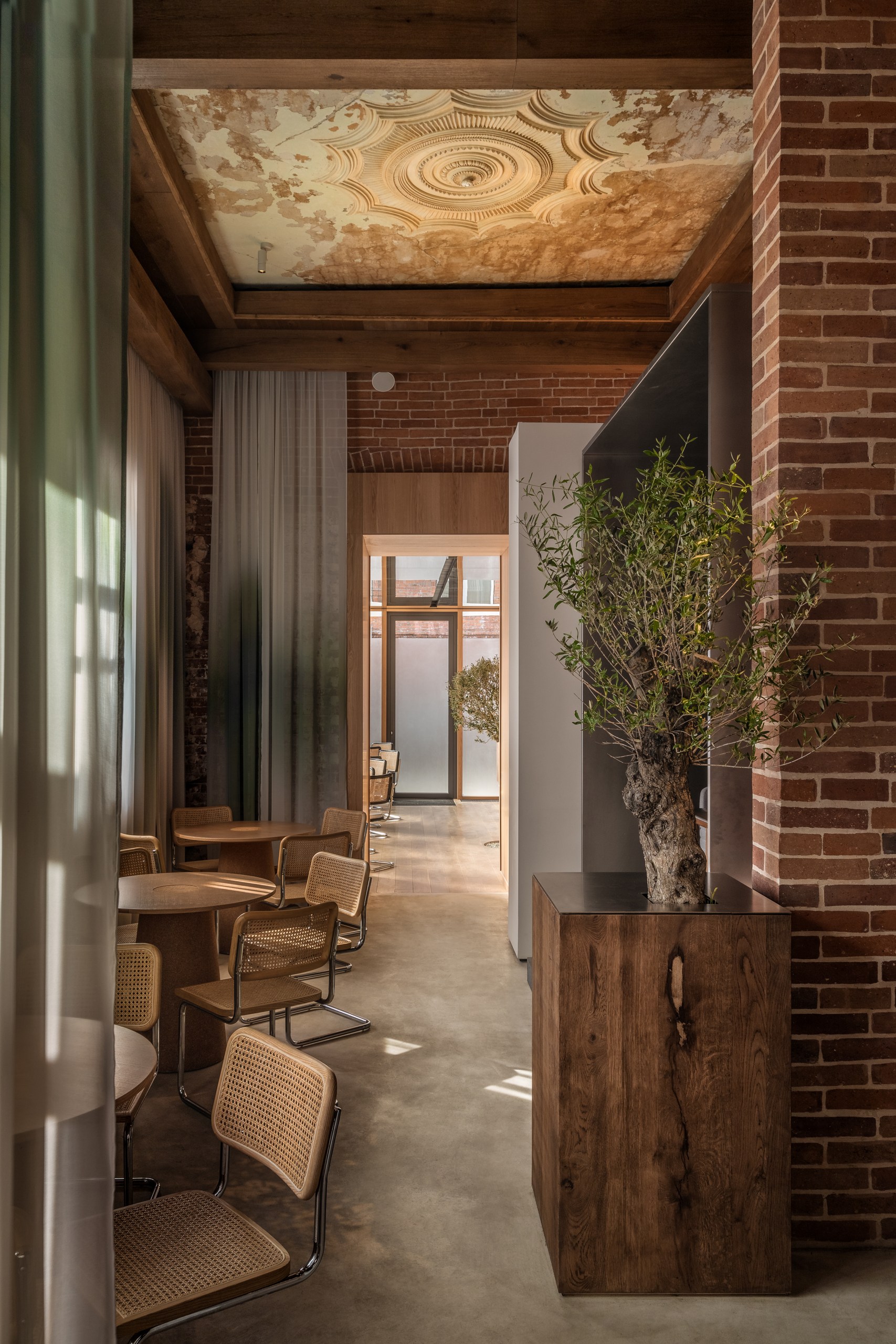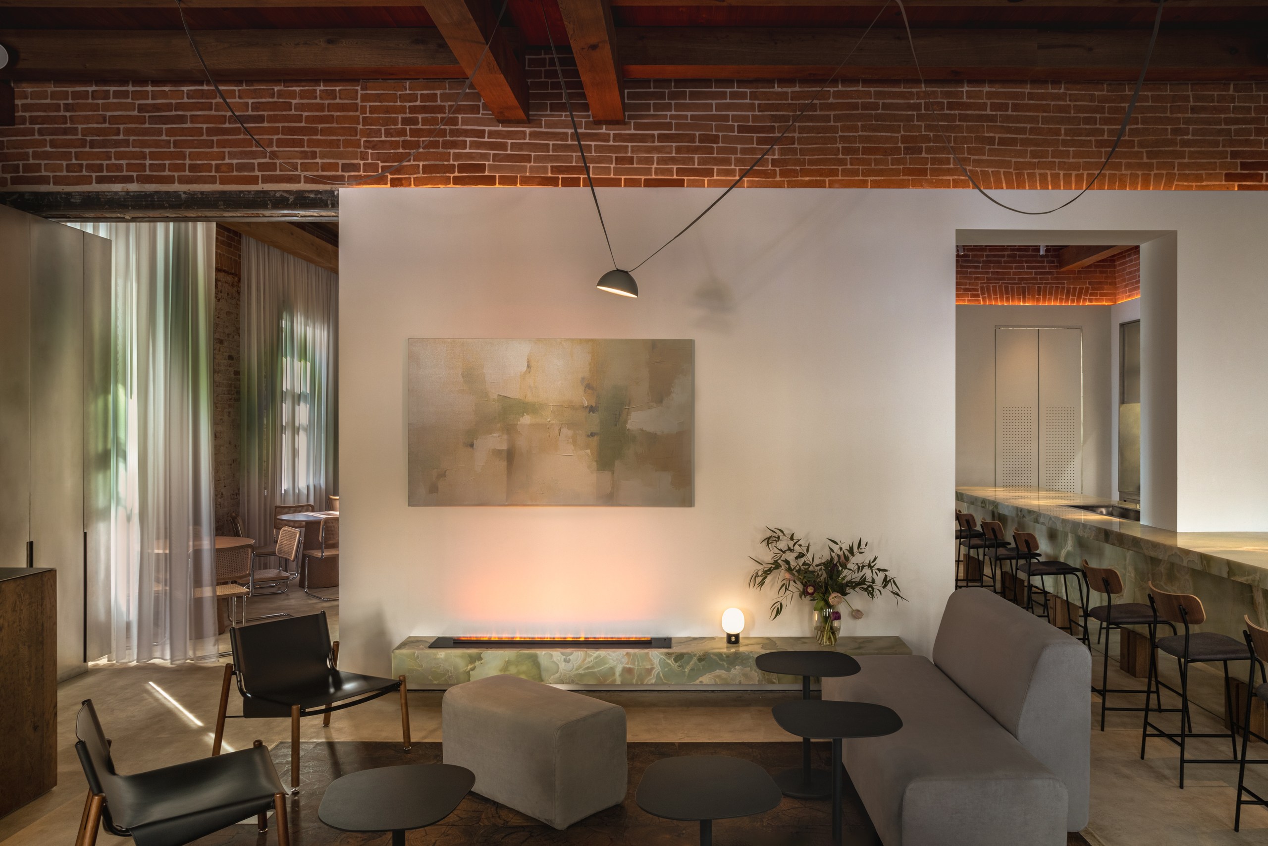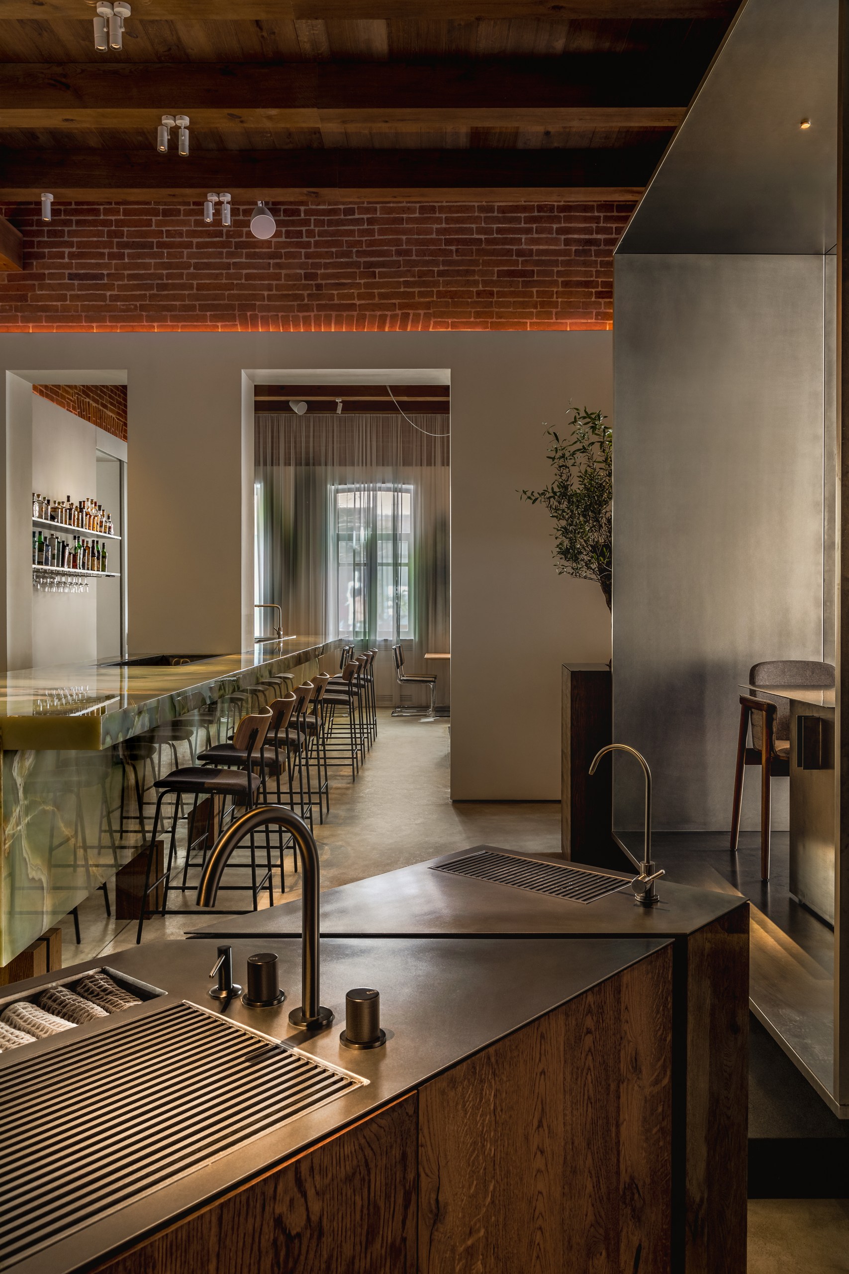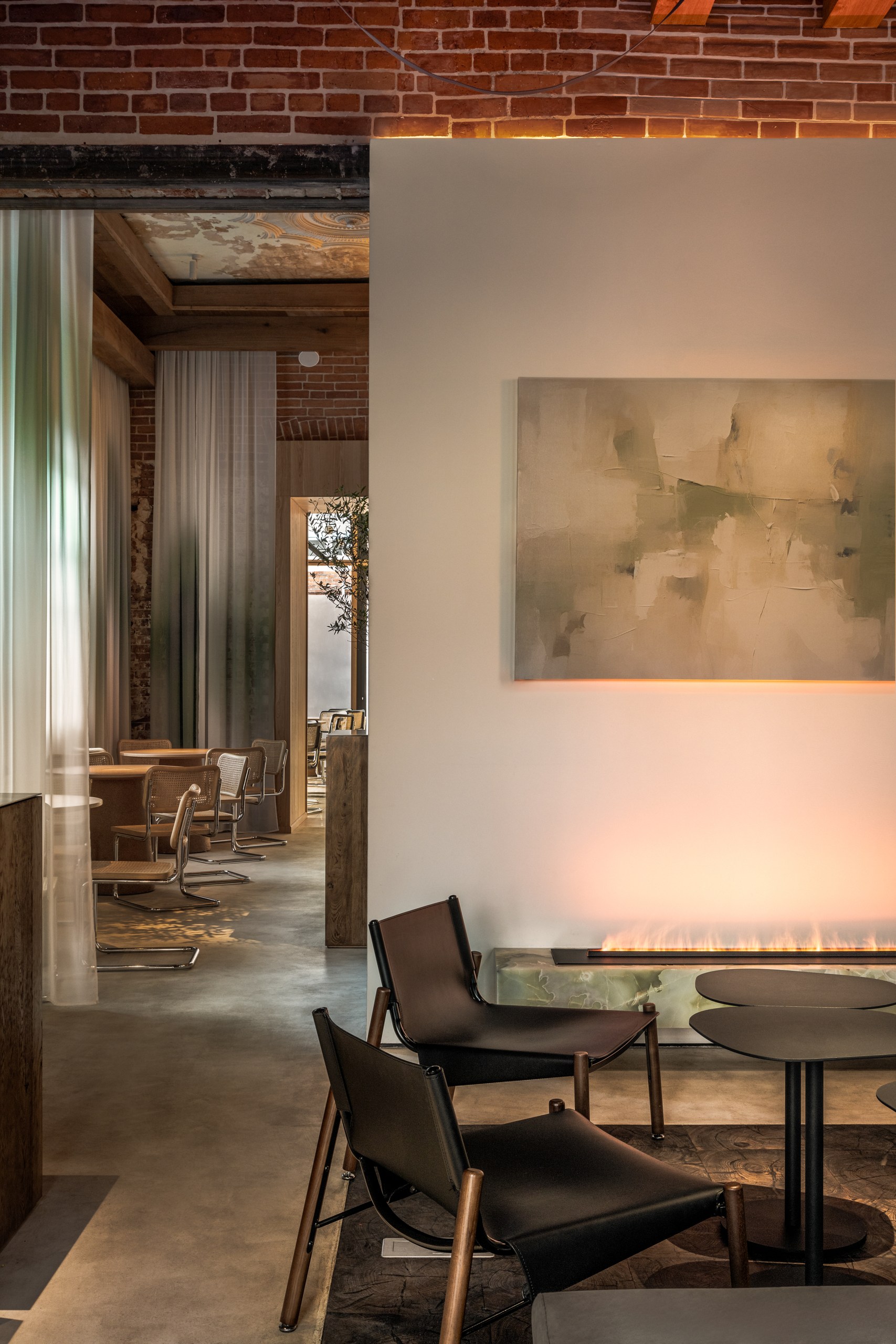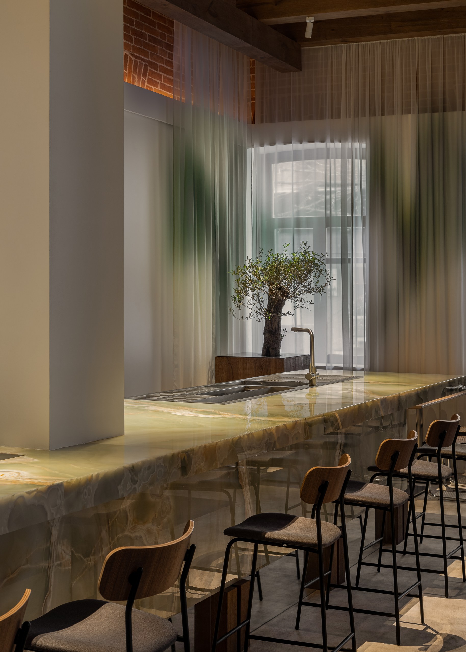 «Нашей главной задачей было соединить историческое и современное, интегрировать новые смыслы, но с уважением к наследию. Мы сохранили и отреставрировали кирпичные и лепные стены, воссоздали деревянный потолок с балками. Новые объемы выполнены из современных, чистых материалов: белые панели, оникс для барной стойки, стальные конструкции. Особенно удачным решением мы считаем использование легких штор с градиентом натуральных оттенков — они объединяют все пространство. Палитра цветов основана на природе: сочетаются кирпич и дерево. с белыми поверхностями и мягкой дымчатой текстильной оболочкой.