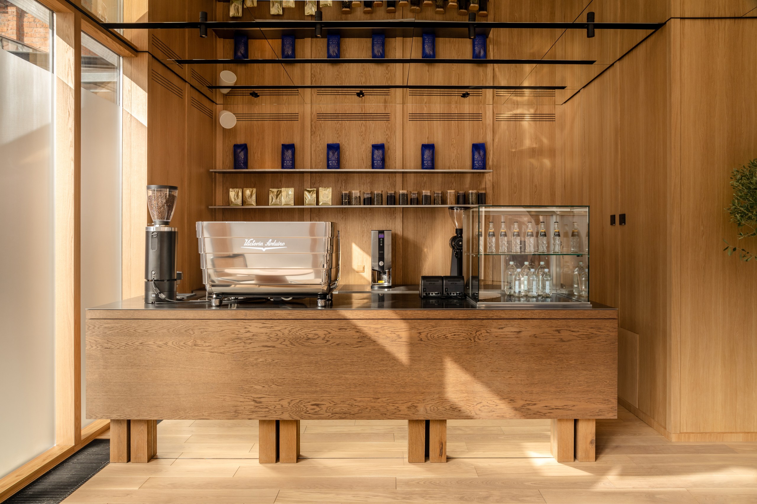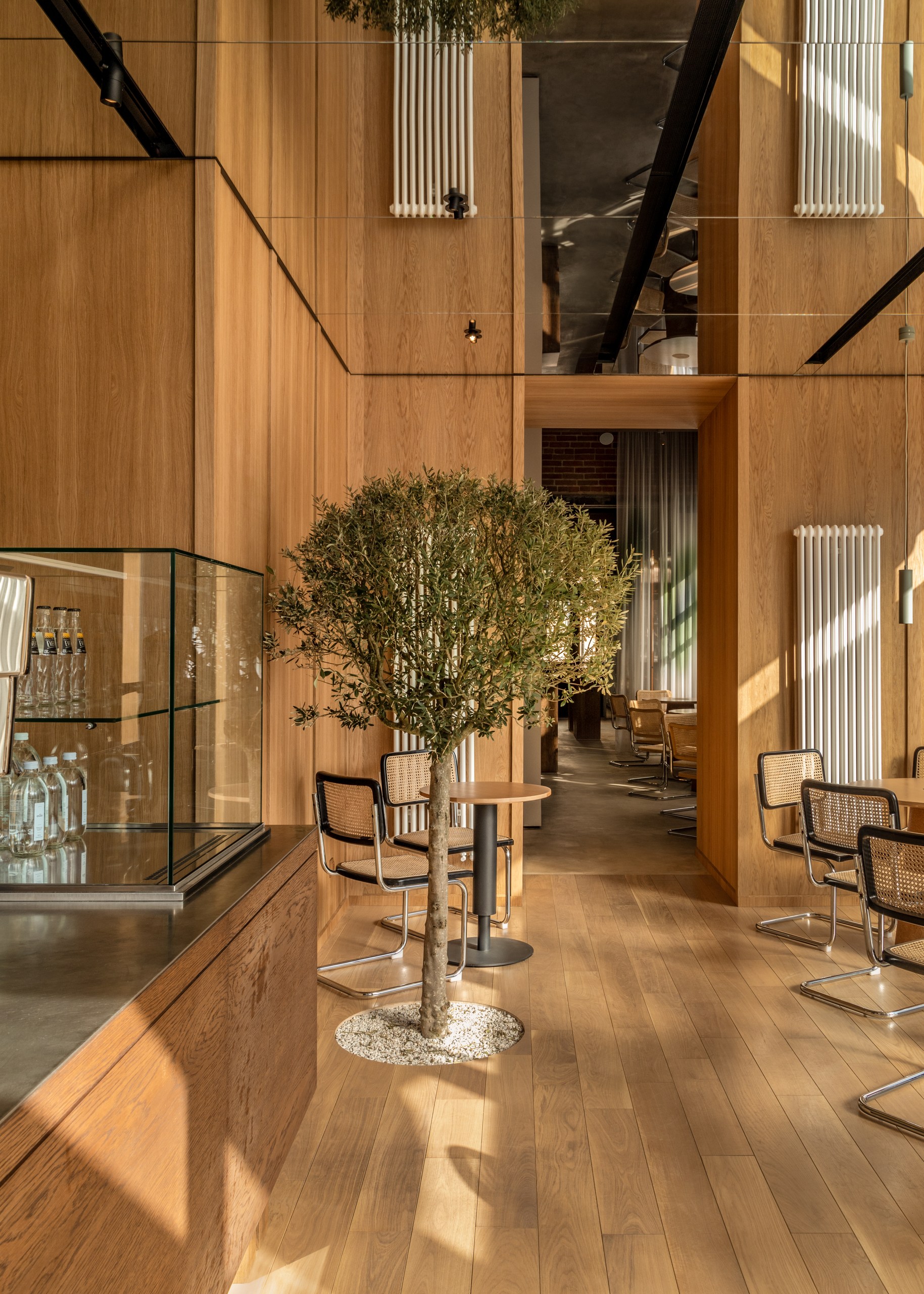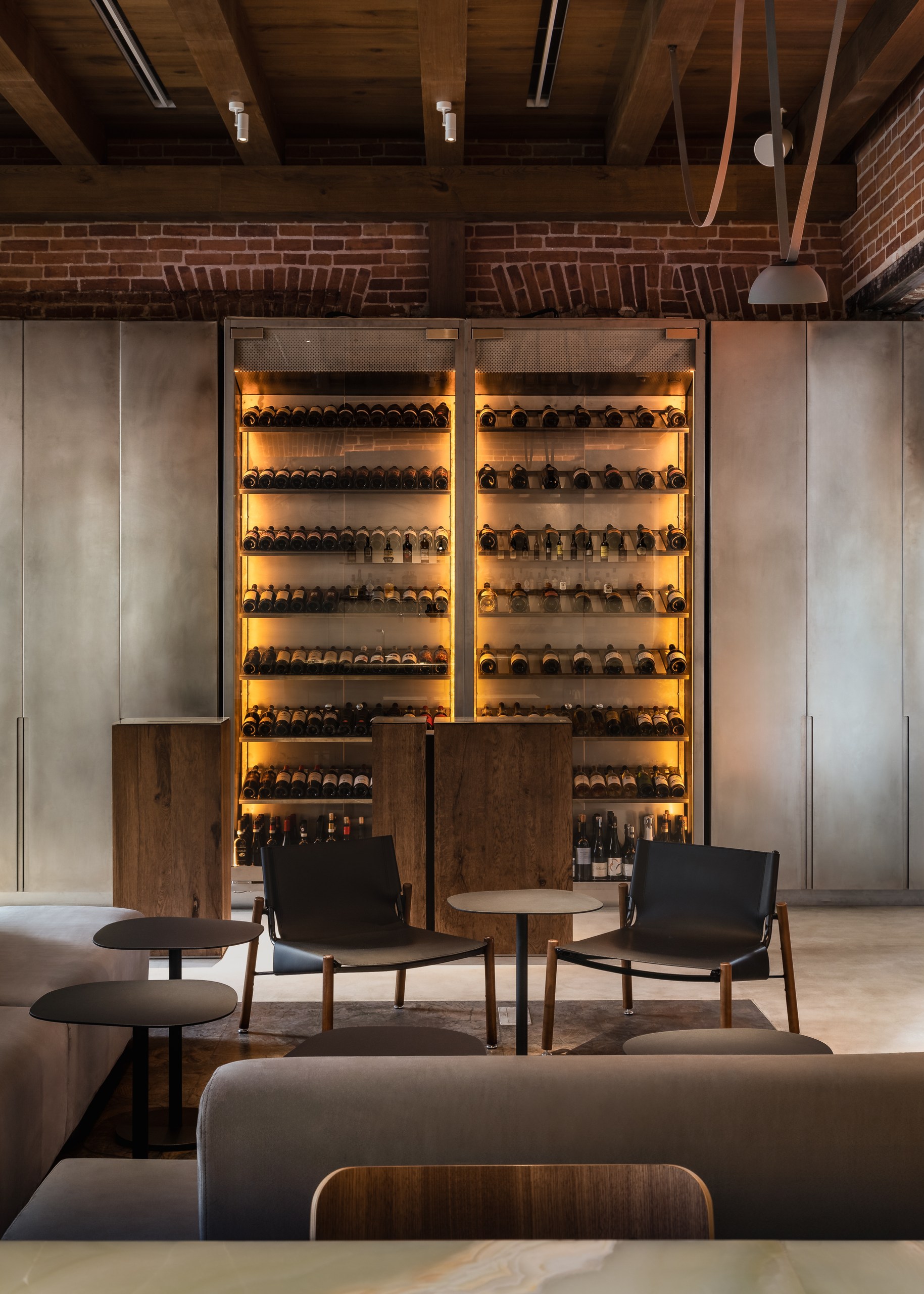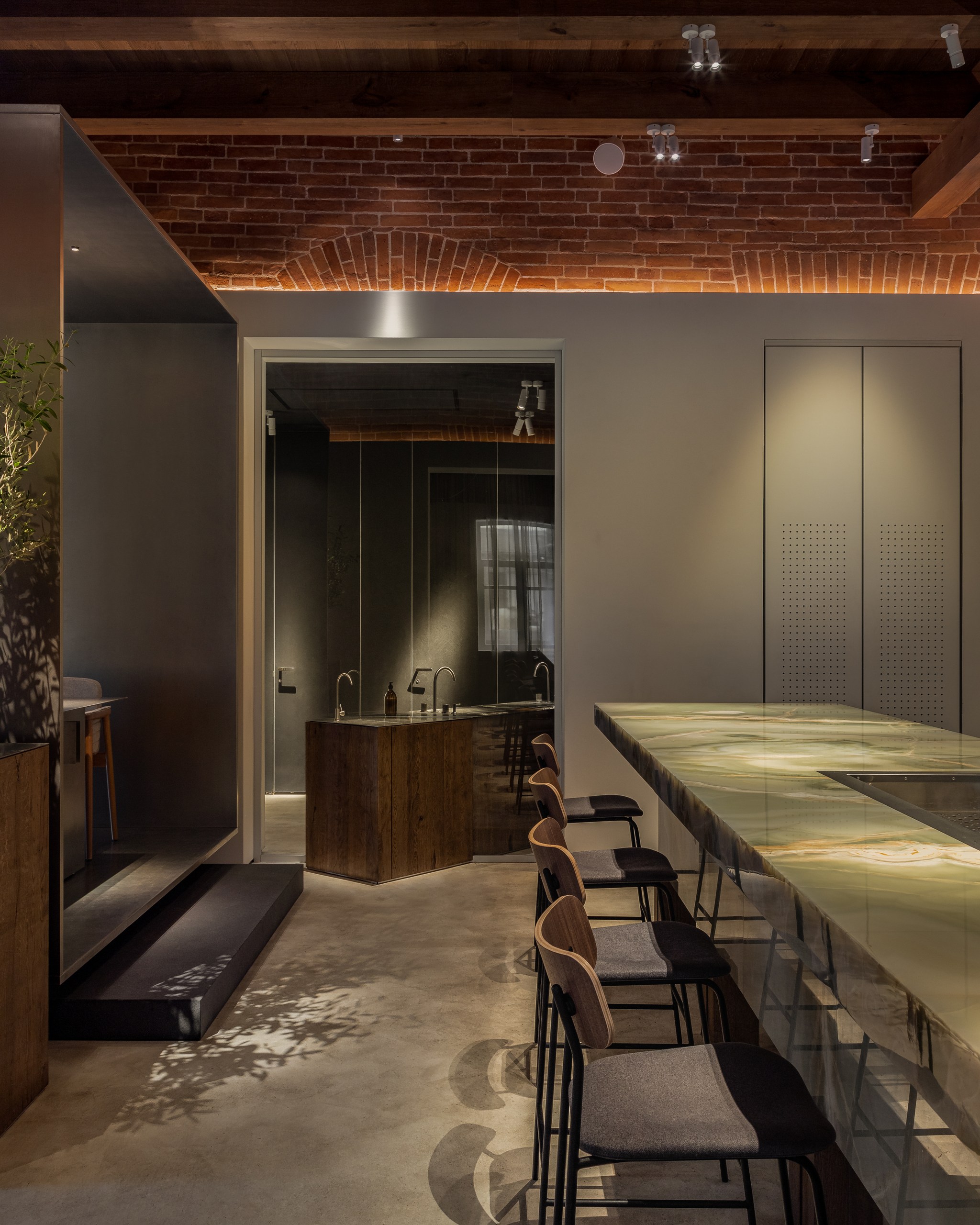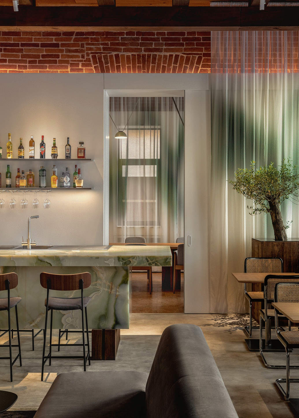 «Нашей главной задачей было соединить историческое и современное, интегрировать новые смыслы, но с уважением к наследию. Мы сохранили и отреставрировали кирпичные и лепные стены, воссоздали деревянный потолок с балками. Новые объемы выполнены из современных, чистых материалов: белые панели, оникс для барной стойки, стальные конструкции. Особенно удачным решением мы считаем использование легких штор с градиентом натуральных оттенков — они объединяют все пространство. Палитра цветов основана на природе: сочетаются кирпич и дерево. с белыми поверхностями и мягкой дымчатой текстильной оболочкой.