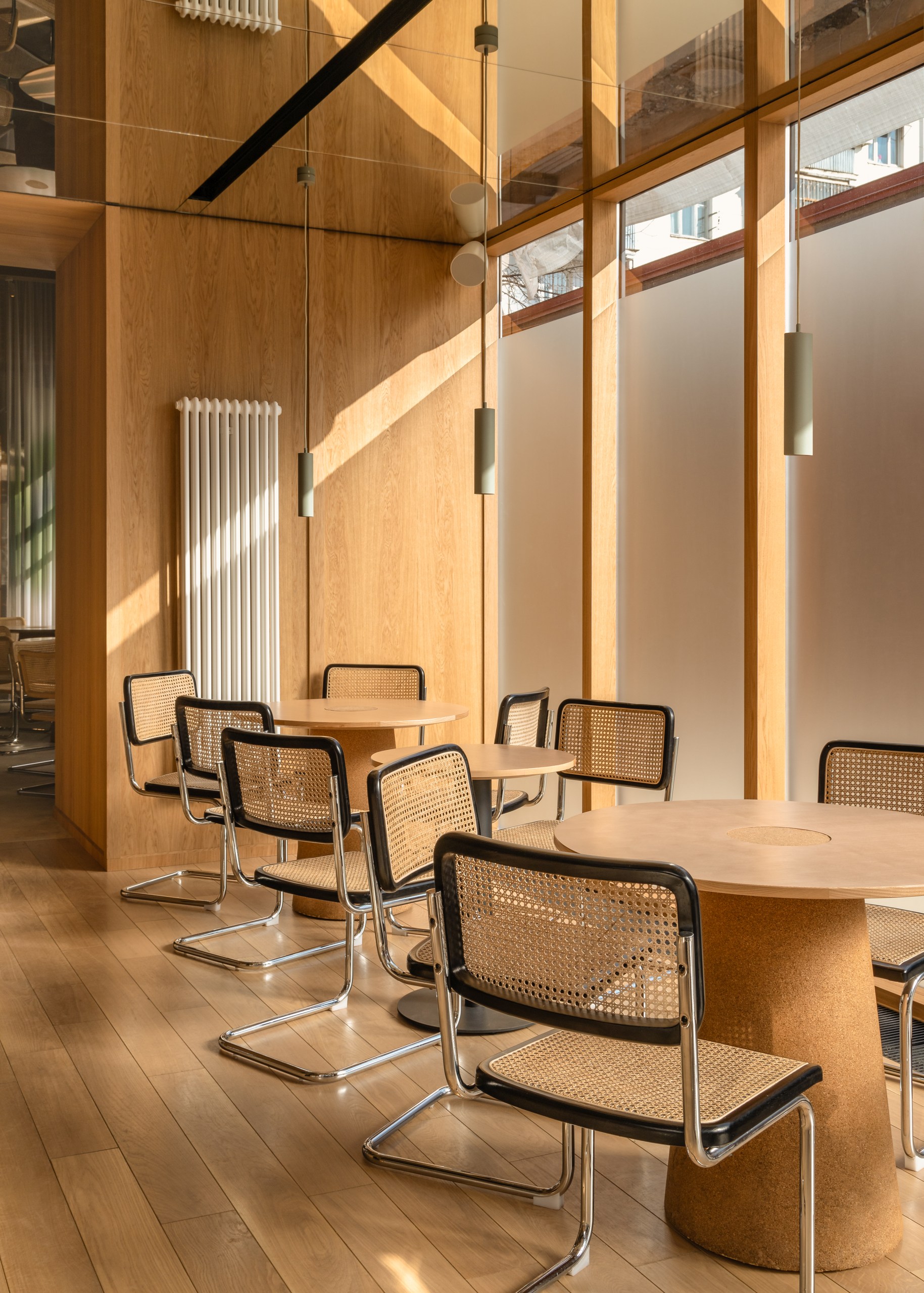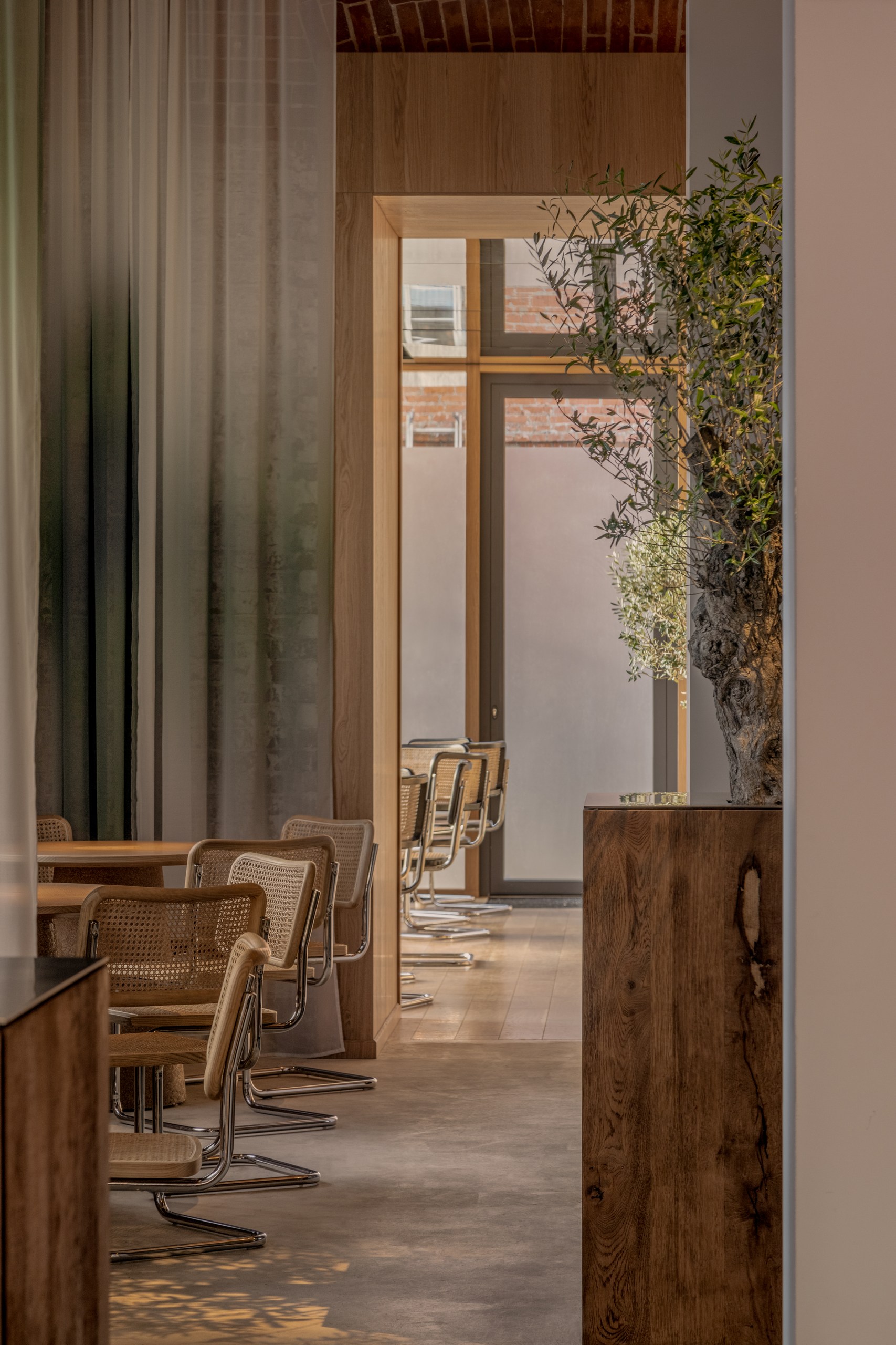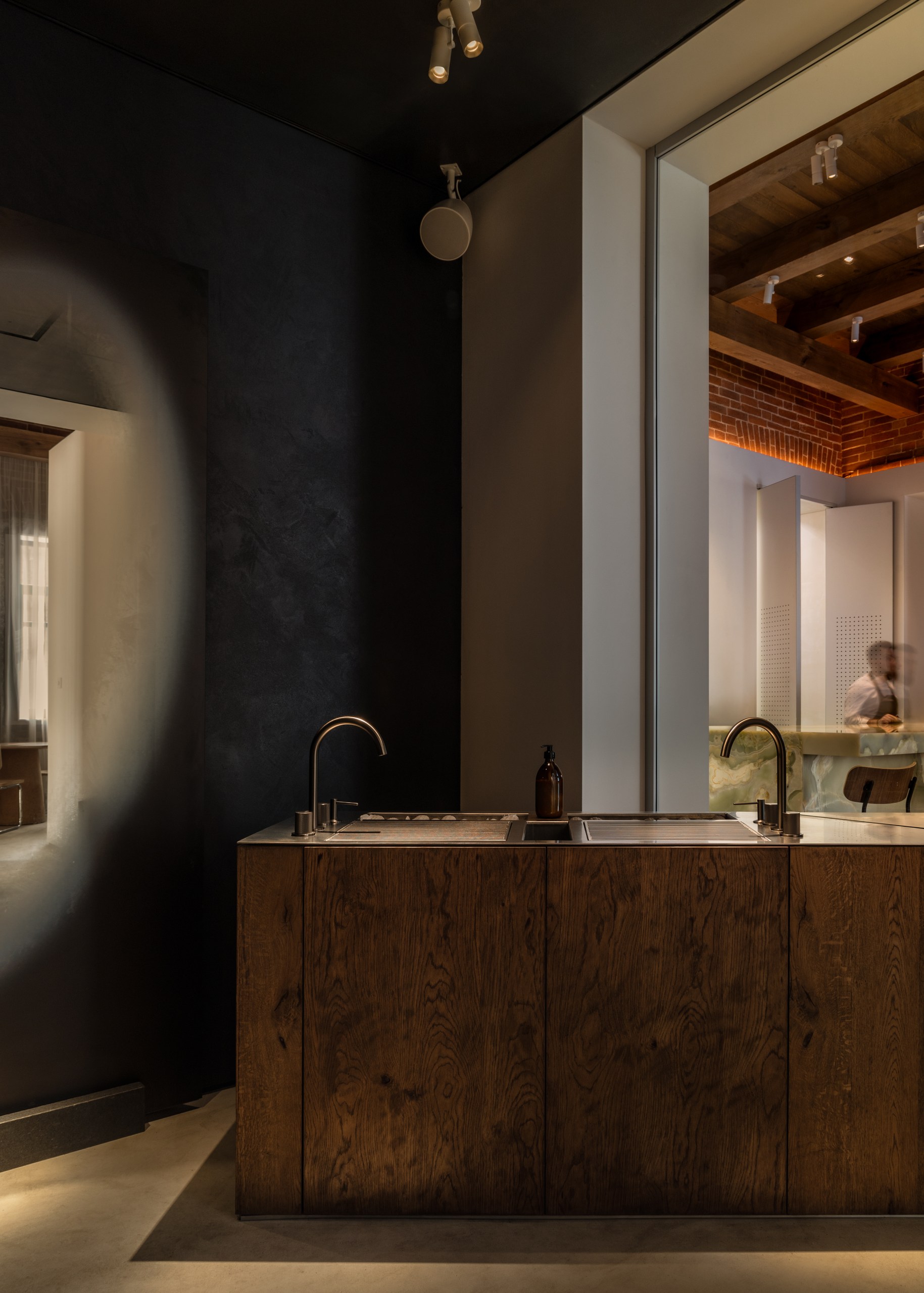 «Мы работали над историческим особняком начала XX века и участвовали в его реконструкции», — поясняют авторы проекта. «Изначально мы обнаружили ряд ценных элементов, которые во многом сформировали интерьер: кирпичные стены, потолочную лепнину и оригинальный деревянный потолок с балками, который нам пришлось реставрировать. Основная задача заключалась в том, чтобы органично интегрировать современную концепцию ресторана в этот богатый контекст».