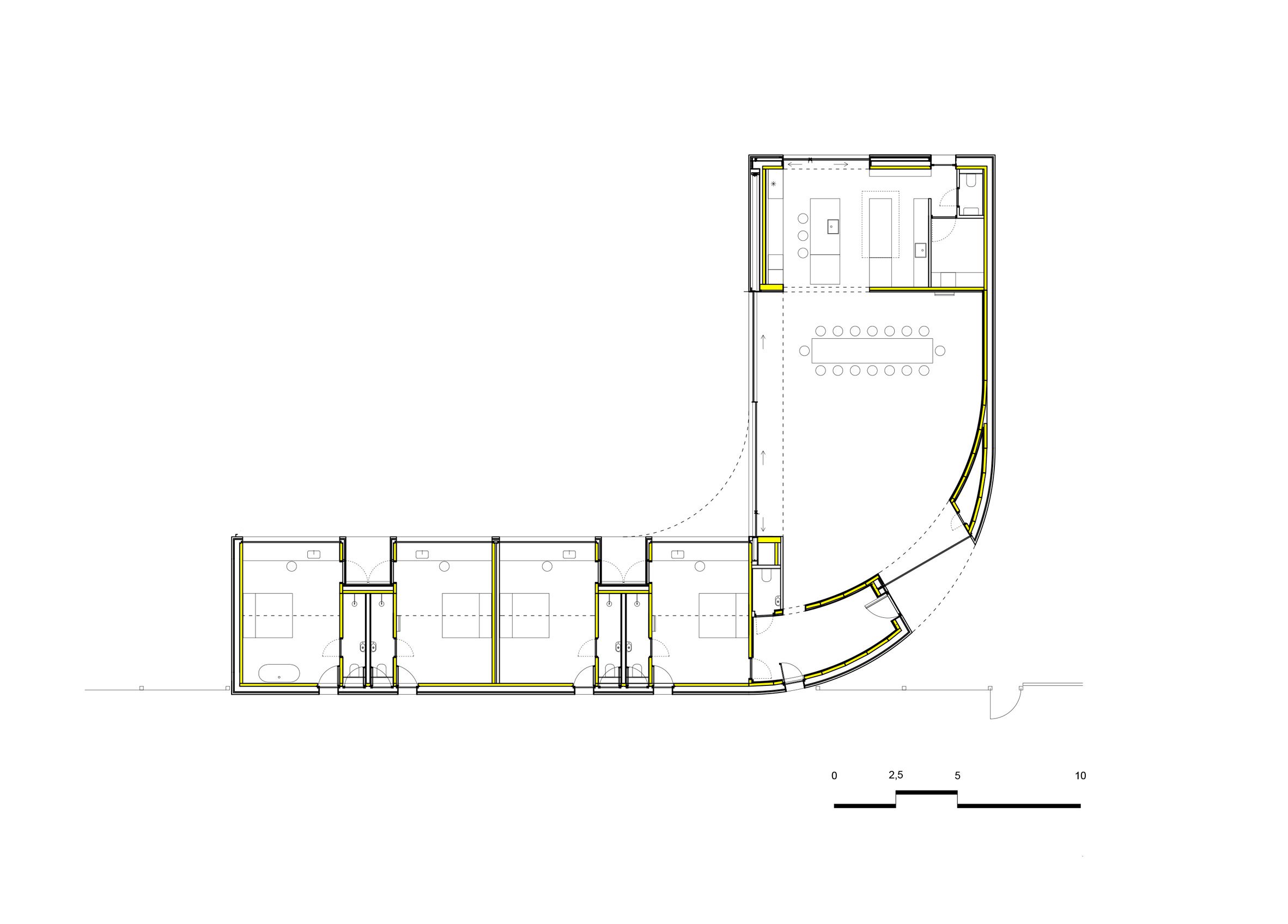 Узкий заостренный объем на западе, огибающий угол участка, плавно переходит в более широкий изогнутый навес на севере. Конструктивной основой пристройки является каркас из поперечно-клееной древесины, заполненный панелями из поперечно-клееной древесины (CLT). Каркас и панели остались открытыми – такое решение подчеркивает внутреннюю отделку, динамичную и меняющуюся геометрию здания. В самой узкой части строения расположены четыре гостевые спальни, а центральную изогнутую часть занимают большая гостиная, столовая и кухня. Раздвижные стеклянные двери во всю высоту ведут в сад, который отделяет пристройку от главного дома. Внутренняя отделка из необработанного дерева контрастирует с черными поверхностями, такими как обугленные изделия из дерева на кухне и в спальнях, а также темные каменные полы.
