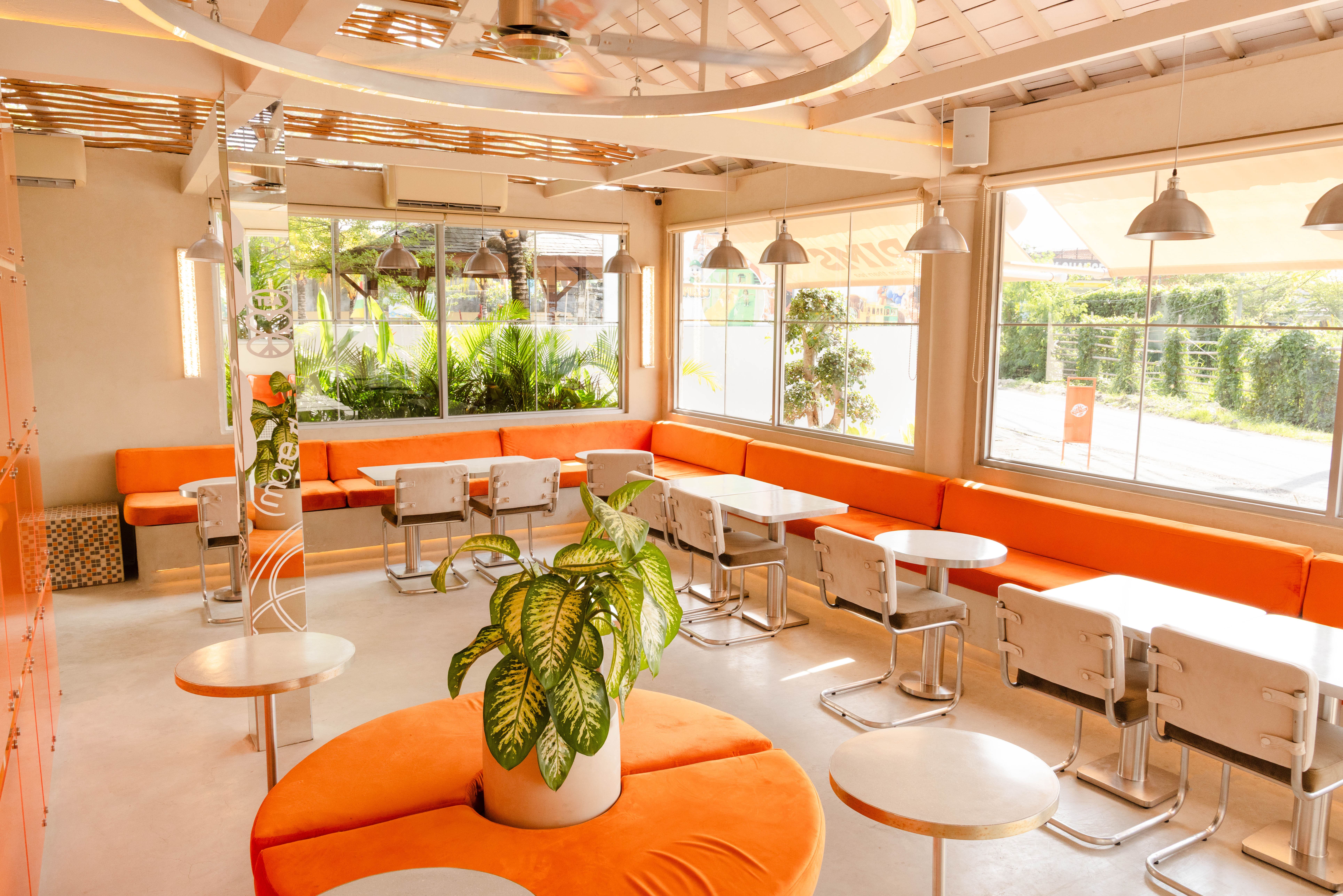 Площадь 98,4 м². метров рассчитан на 30 гостей, еще 10 мест организовано на улице. В основу концепции лег дизайн-код бренда, адаптированный к особенностям и климату региона. Его влияние заметно в культовой оранжевой палитре и акцентированных деталях, таких как вывеска, дополняющая фотозону снаружи, и вешалки для шлемов у входа в кафе.