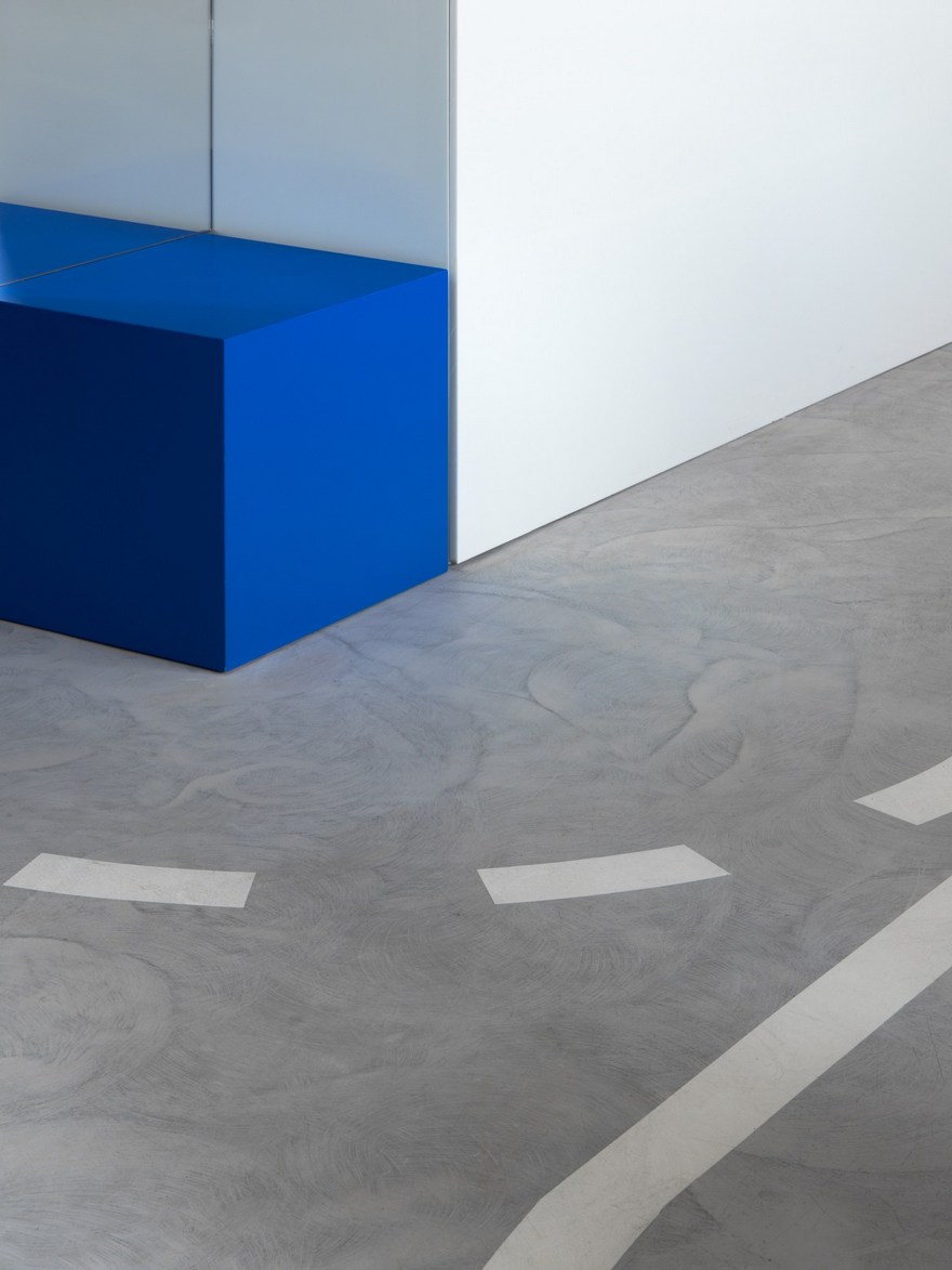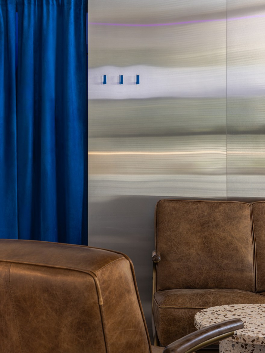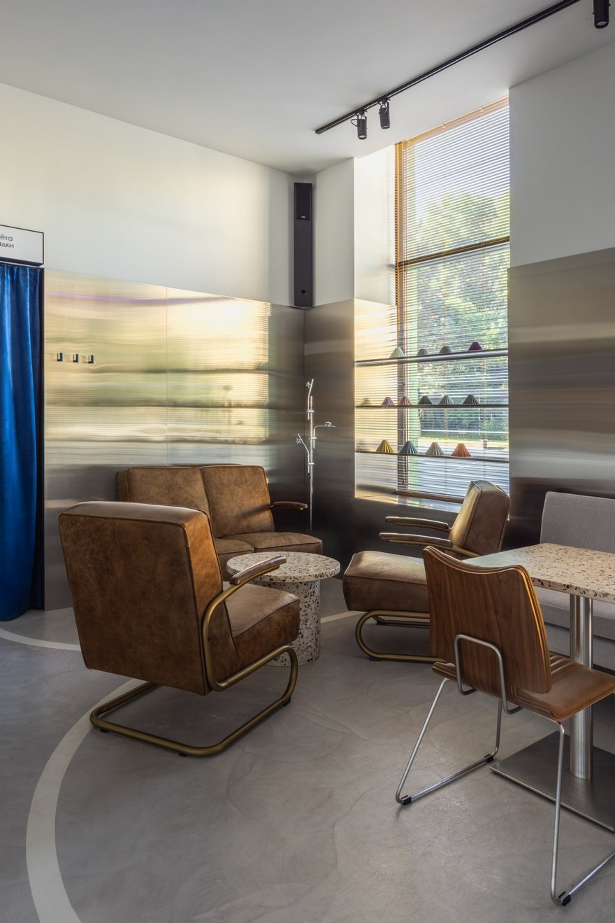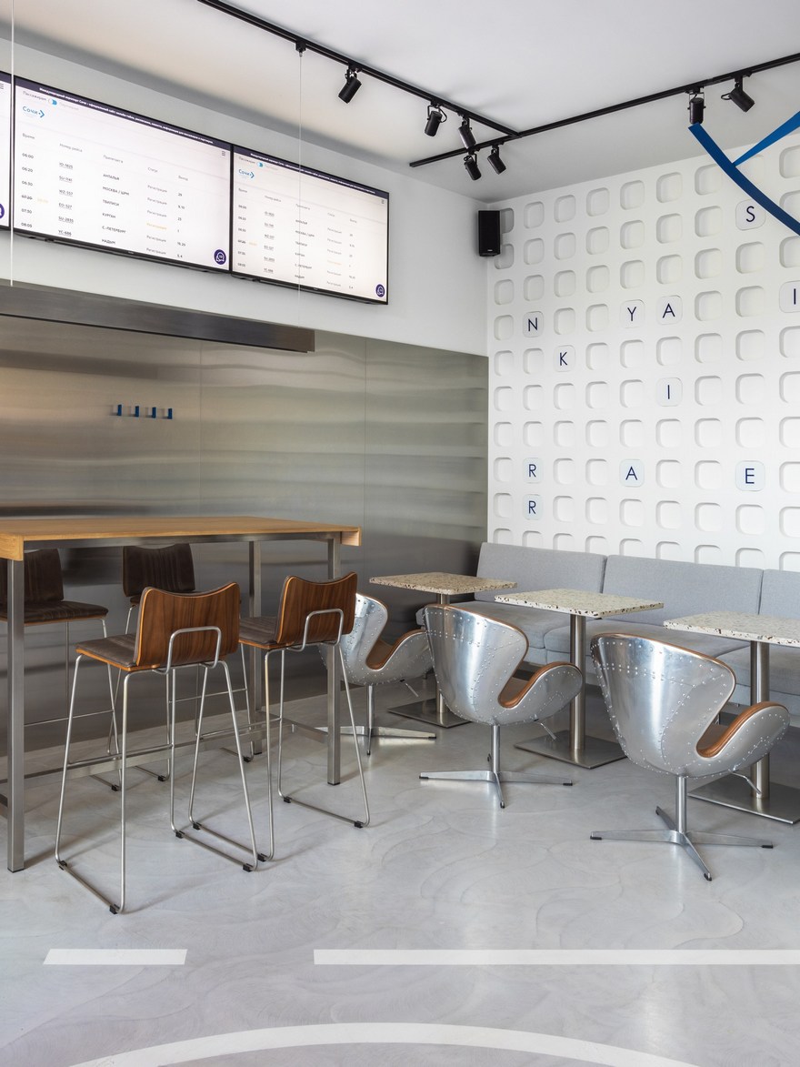 Чтобы не затягивать с ремонтом, перепланировку решили не приступать. Это повлияло на выбор материалов и некоторые решения: например, чтобы скрыть неидеальную фактуру стен, их обшили металлом, а первый проем, ведущий в ванную, закрыли шторами, визуально скрывавшими его от глаз гостей и усиливавшими сходство с салоном самолета. «Главная задача в коммерческом интерьере — обеспечить комфорт целевой аудитории и передать философию бренда посредством тактильных и визуальных акцентов», — комментируют авторы проекта. — Для усиления темы использованы материалы, связанные с миром авиации: нержавеющая сталь, алюминий, кожа. Культовый сигнальный синий цвет выступает ярким акцентом на фоне нейтральной палитры. На наливном полу дорожки имеют разметку, напоминающую рулежную дорожку аэродрома.