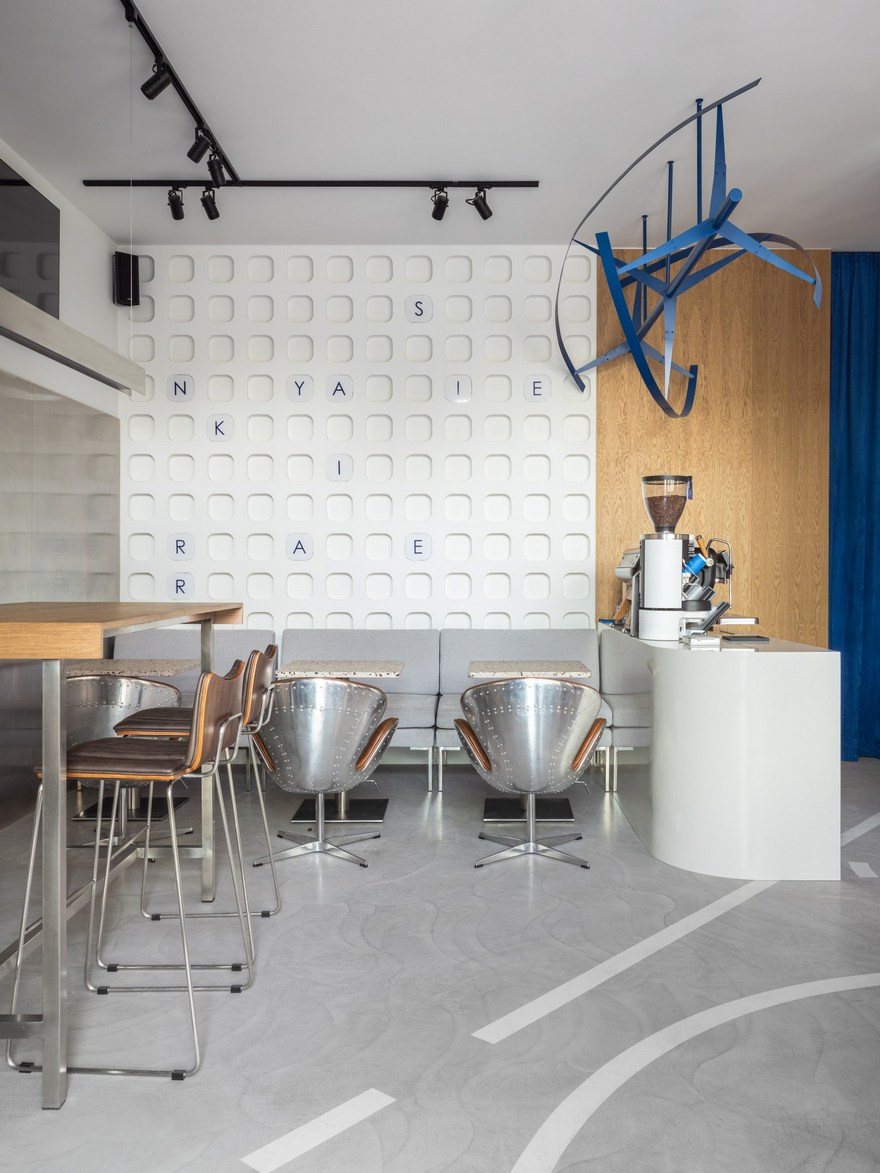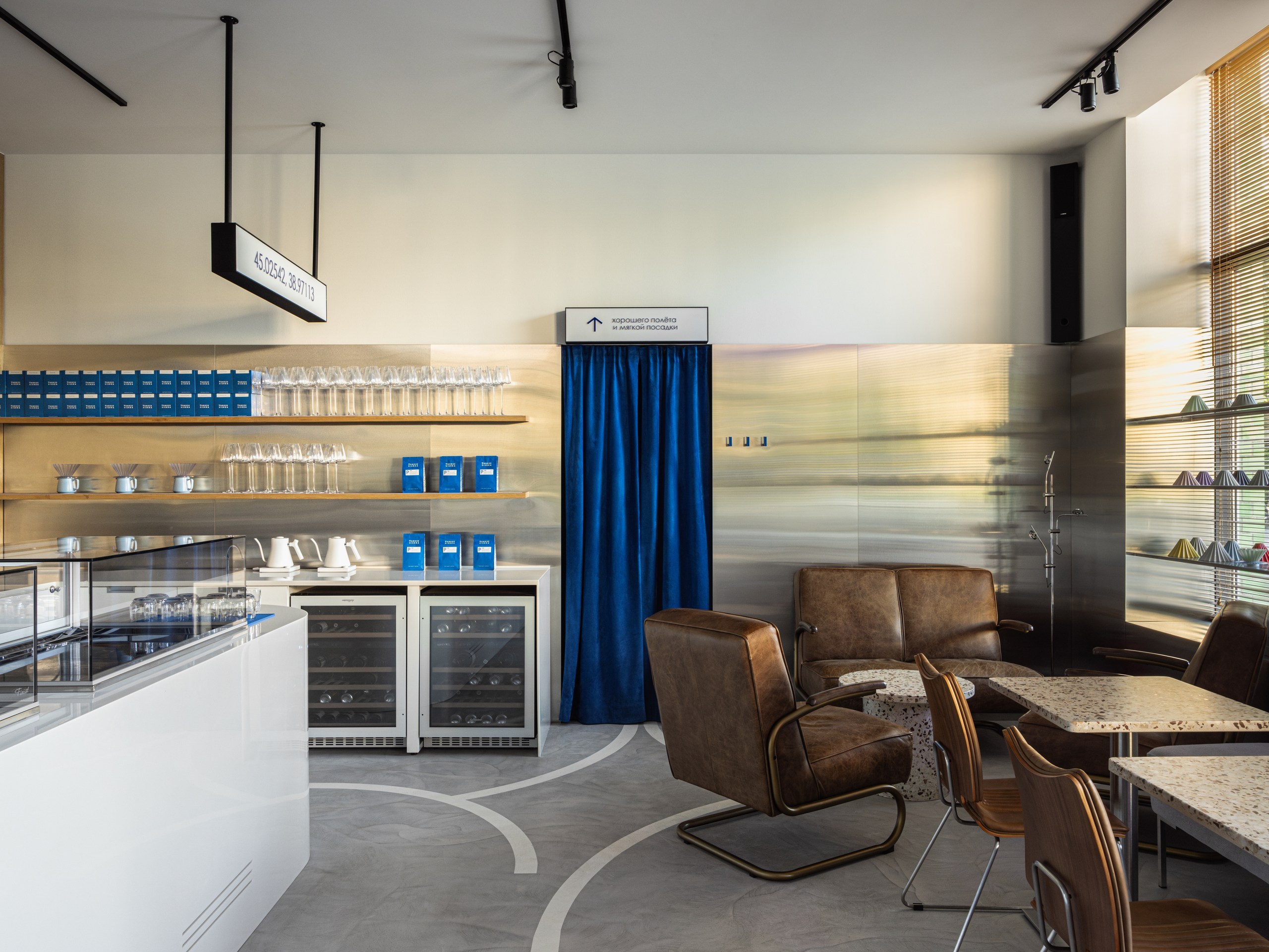 «Задачей было создать интерьер, объединивший две главные страсти заказчика: небо и кофе», — поясняют дизайнеры Анна и Максим Ильющенко. «Вдохновленные нашей любовью к авиации, мы спроектировали пространство, напоминающее кабину пилотов, но при этом напоминающее зал ожидания аэропорта или бизнес-зал».