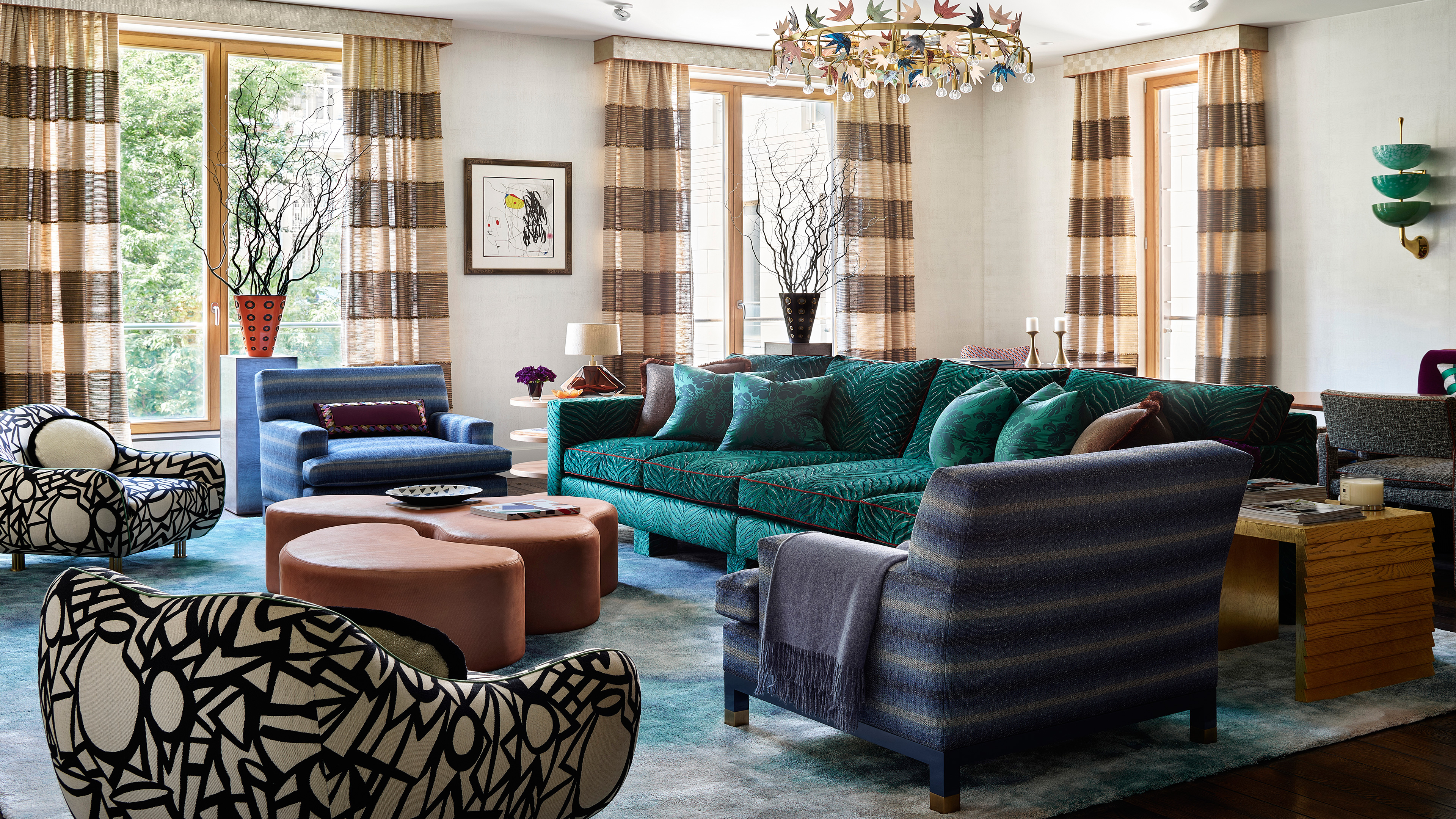 Владельцы этих городских квартир обладают впечатляющей коллекцией произведений искусства. В просторных залах представлены работы Виктора Вазарели, Дэвида Хокни, Александра Колдера, Жоана Миро. Также есть отделка из тонированной соломы и золотистой кожи, синего макассара и красного лака, тканей с люрексом, изумрудного бархата, серебряного дерева, мексиканской вышивки, перламутровой кухни, кровати с балдахином, вдохновленной временем Марии-Антуанетты. ..