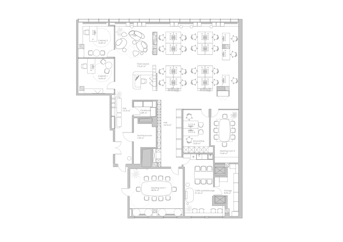 Задача заключалась в том, чтобы создать пространство, в которое сотрудники хотели бы возвращаться. Несмотря на использование холодной цветовой палитры, офис получился теплым и уютным. Нежный небесно-голубой цвет объединил весь интерьер, дополненный оттенками медового дерева и теплыми песочными тонами. Также использовались легкие металлические конструкции.