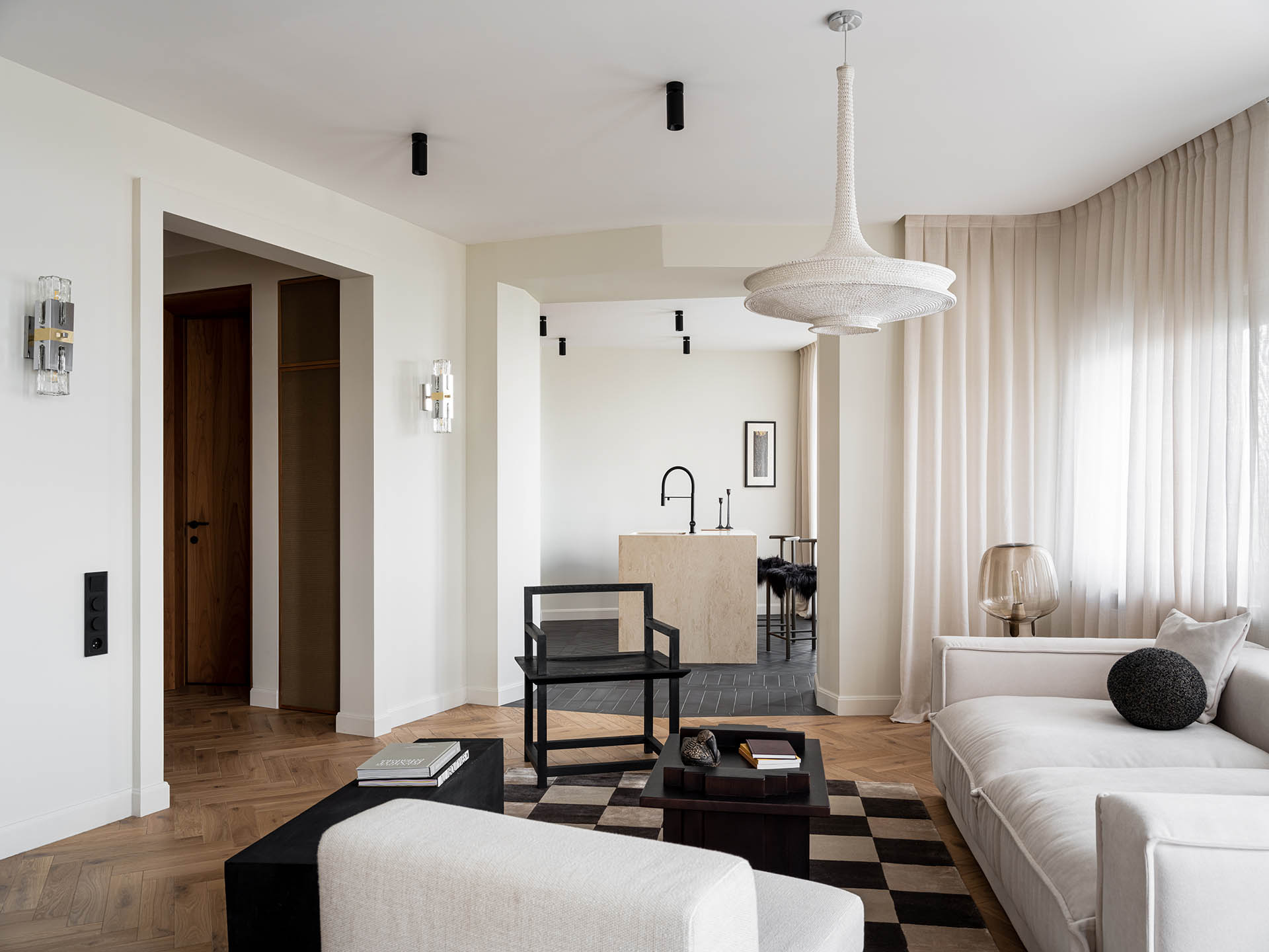 Двухкомнатная квартира площадью 70 м². метров расположена на восьмом этаже 24-этажного дома в одном из жилых комплексов Москвы. Владелец, молодой предприниматель, попросил команду студии создать монохромный интерьер, наполненный тактильными фактурами и арт-объектами. «Это не первый наш проект с клиентом и это именно тот случай, когда работа строится на полном доверии», — делятся Елена и Ярослав. «Мы приехали туда очень рано, когда даже стены еще не были возведены. Получилось совершенно асимметричное помещение с уходящим вглубь пространства несущими стенами, а все семь окон располагались на разной высоте.