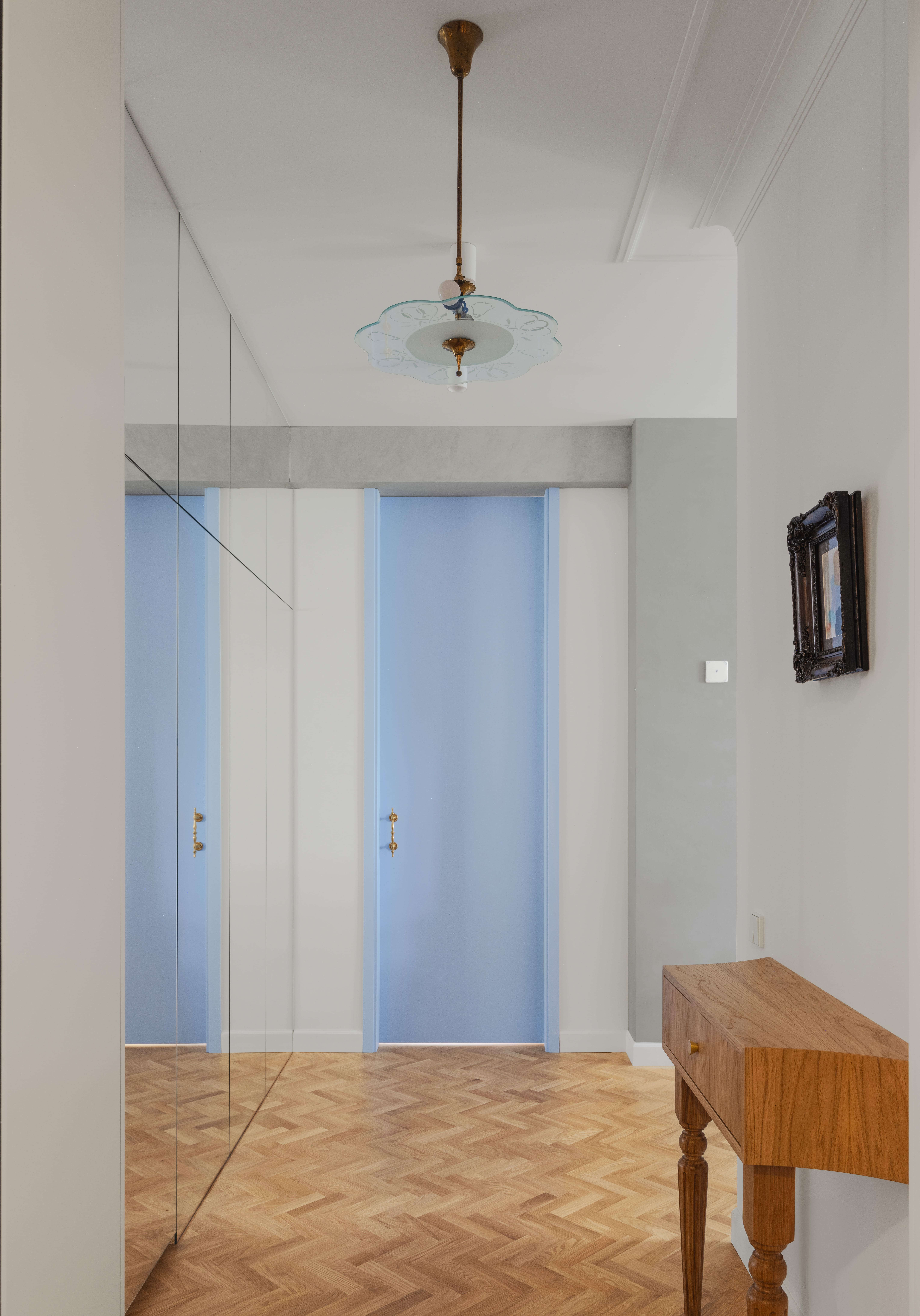 В основу проекта легла лепнина, повторяющая ту, которую пришлось разобрать из-за серьезных повреждений, паркет «елочка» теплого оттенка, белые стены и небесно-голубые двери с советскими латунными ручками. В интерьере множество винтажных предметов, органично сочетающихся с современной мебелью. В гостиной почетное место занял ковер ручной работы, прибывший из Дербента, и торшер IKEA 1990-х годов, форма которого напоминает фрагмент советского плаката. Кухонную мебель дополнили отреставрированные стулья с барахолки и купленная на Авито хрустальная люстра фабрики «Красный май», которую архитекторы собрали вручную из десятков элементов, бережно упакованных в страницы школьного учебника для транспортировки.