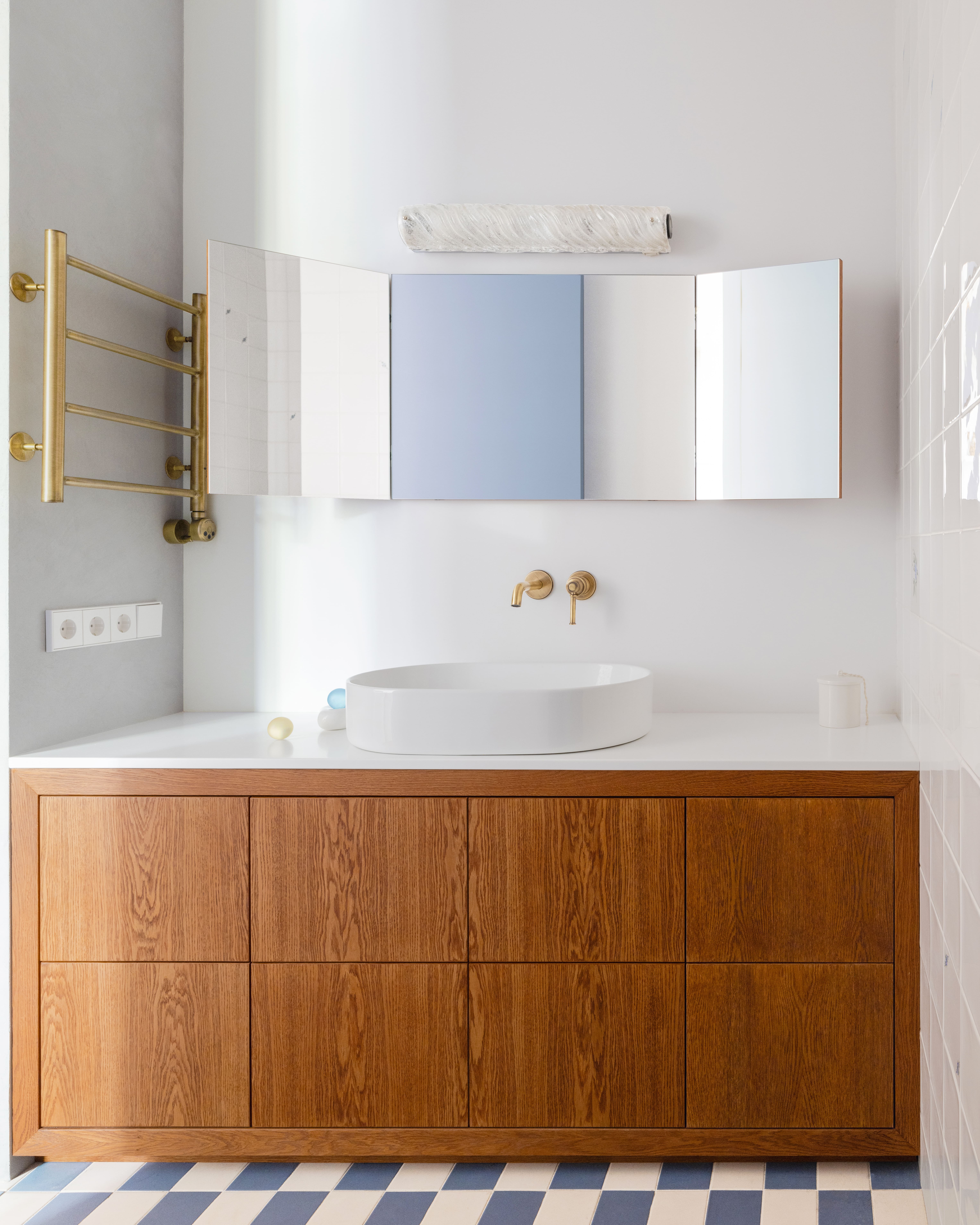 Ванная комната продолжает общую концепцию. Пол украшен метлахской плиткой, напоминающей старые подъезды, а стены украшены смесью современной и аутентичной советской плитки с цветочным рисунком. Шпонированный туалетный столик увенчан зеркалом, вдохновленным советским туалетным столиком, и лампой из текстурированного муранского стекла.