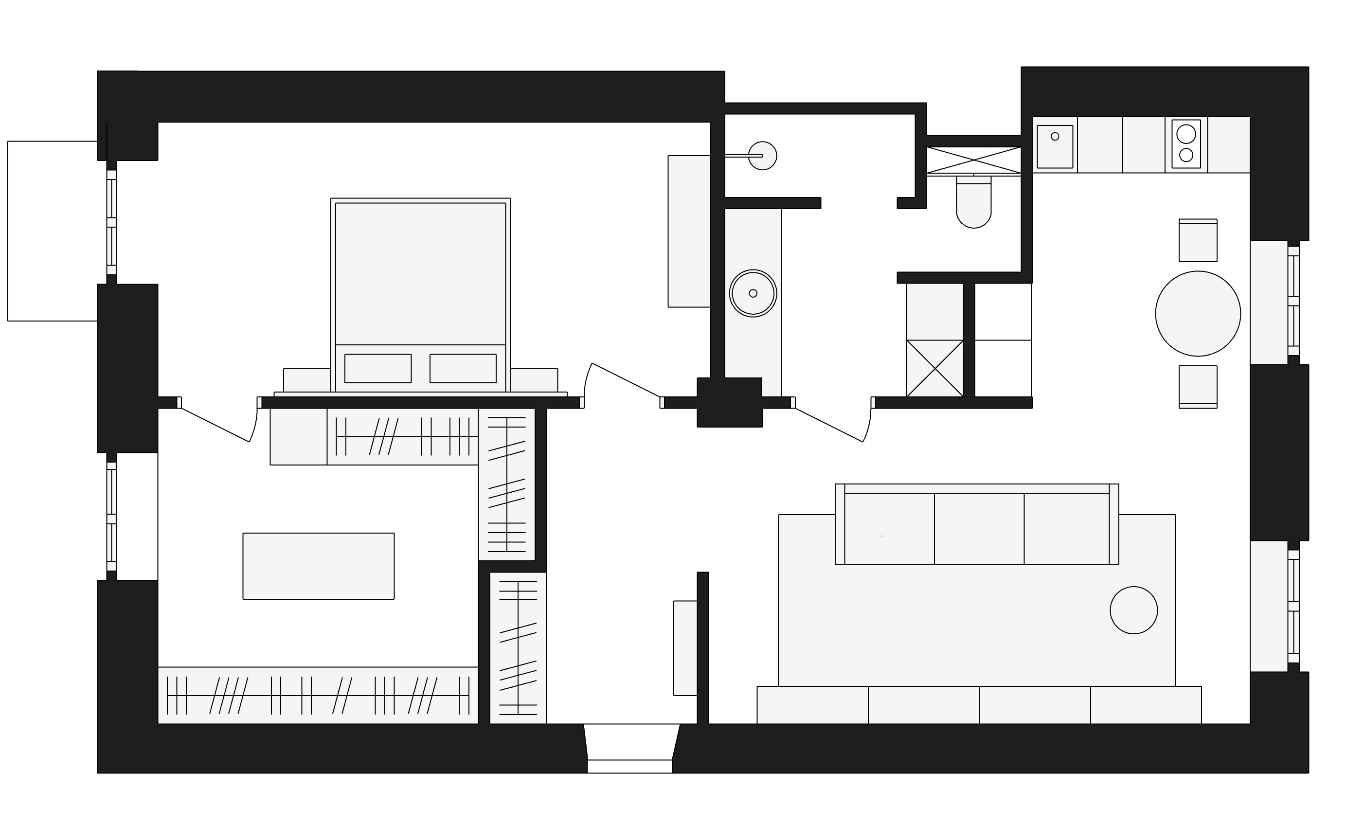 Типично сталинская схема была полностью перекроена. Чтобы сделать основное пространство максимально просторным, команда объединила гостиную и кухню, для чего пришлось отключить газ, а также убрала перегородку, разделяющую коридор. Стену между входом и гардеробной сделали зигзагом, чтобы образовать ниши для шкафов. Санузел увеличили за счет прихожей, чтобы освободить место для прачечной.